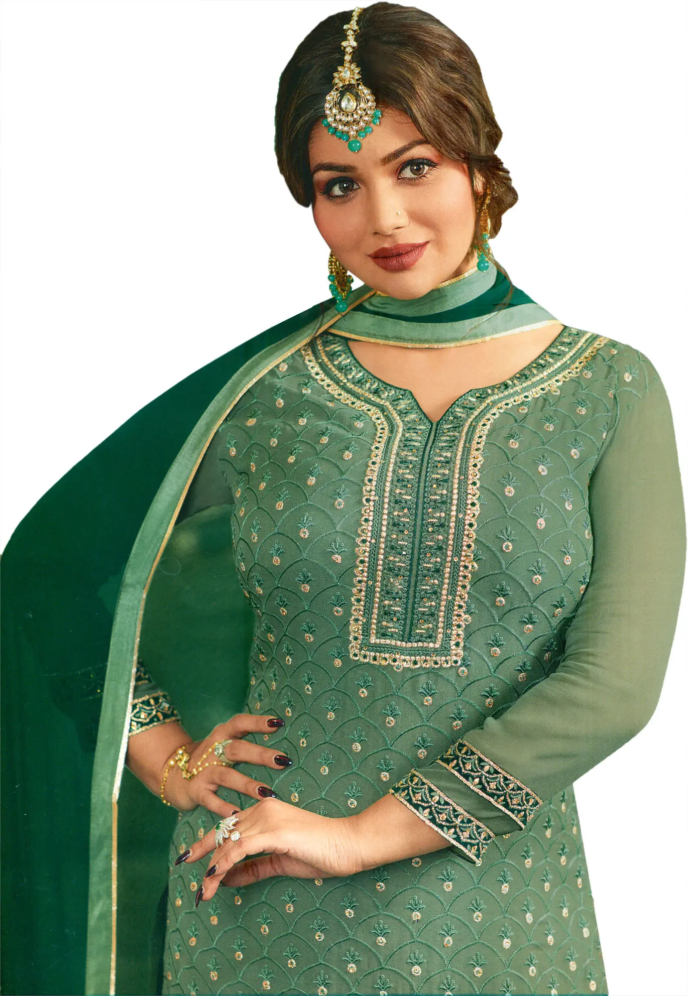 Embrace a vision of refined grace and opulent design with the Lily-Pad Ayesha Salwar Kameez Suit. Crafted from luxurious silk, this ensemble is a testament to exquisite craftsmanship, designed to make you feel like royalty at any special occasion. The serene lily-pad green hue is a breath of fresh air, offering a sophisticated alternative to traditional colors, while the rich emerald green accents add a dramatic flair.