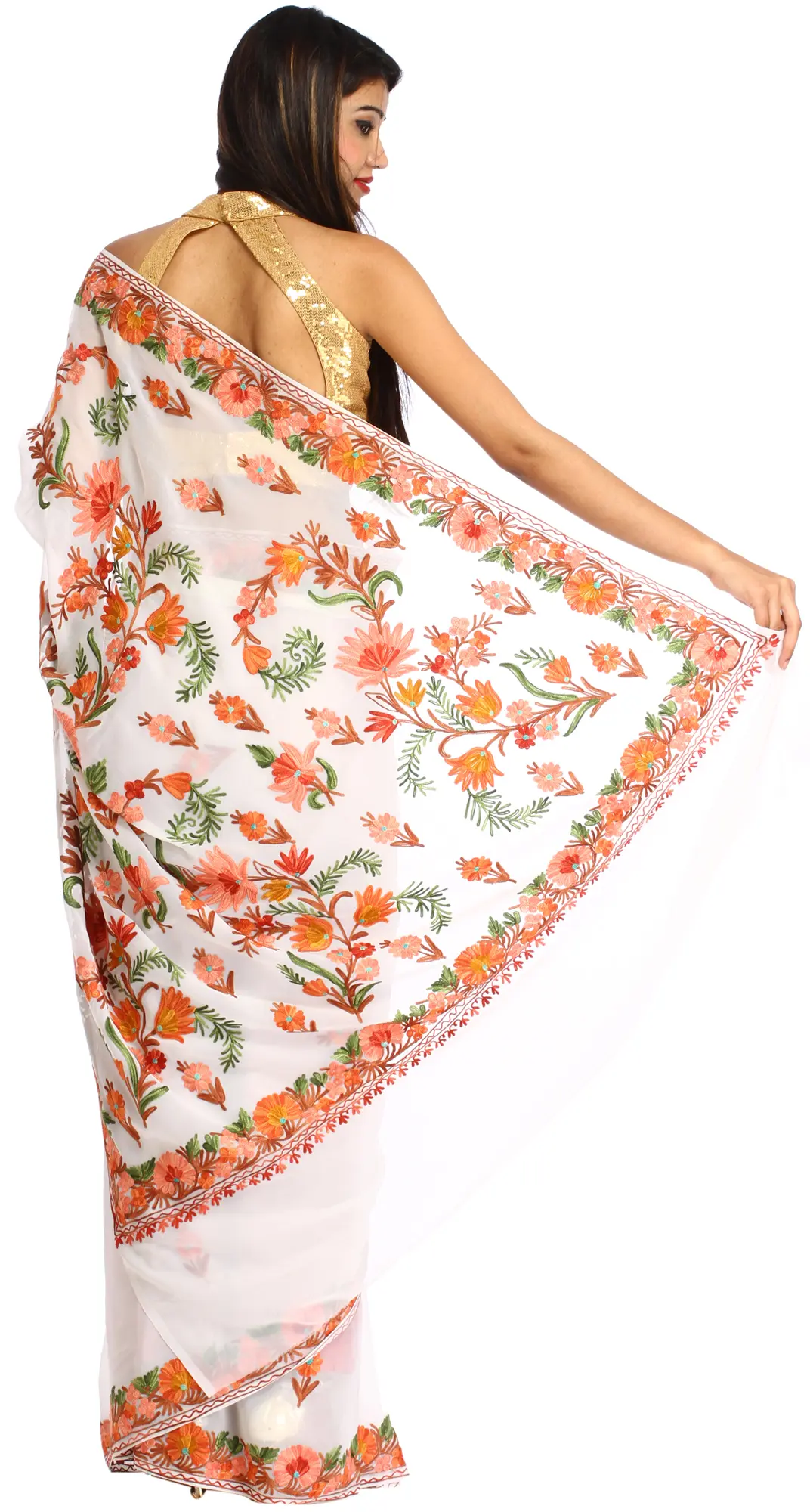 Georgette Saree with Multicolor Aari Embroidered Floral Motifs from Kashmir