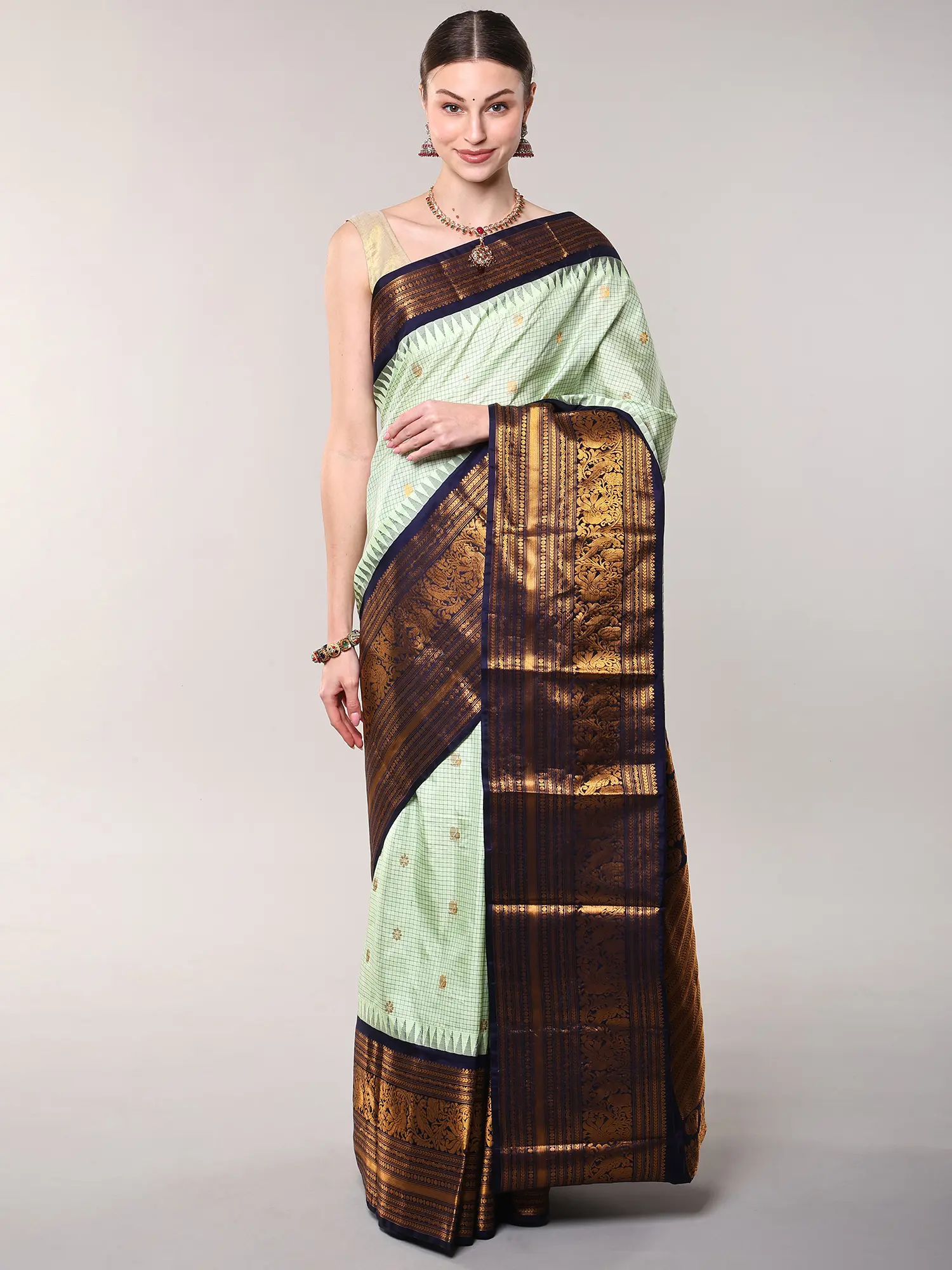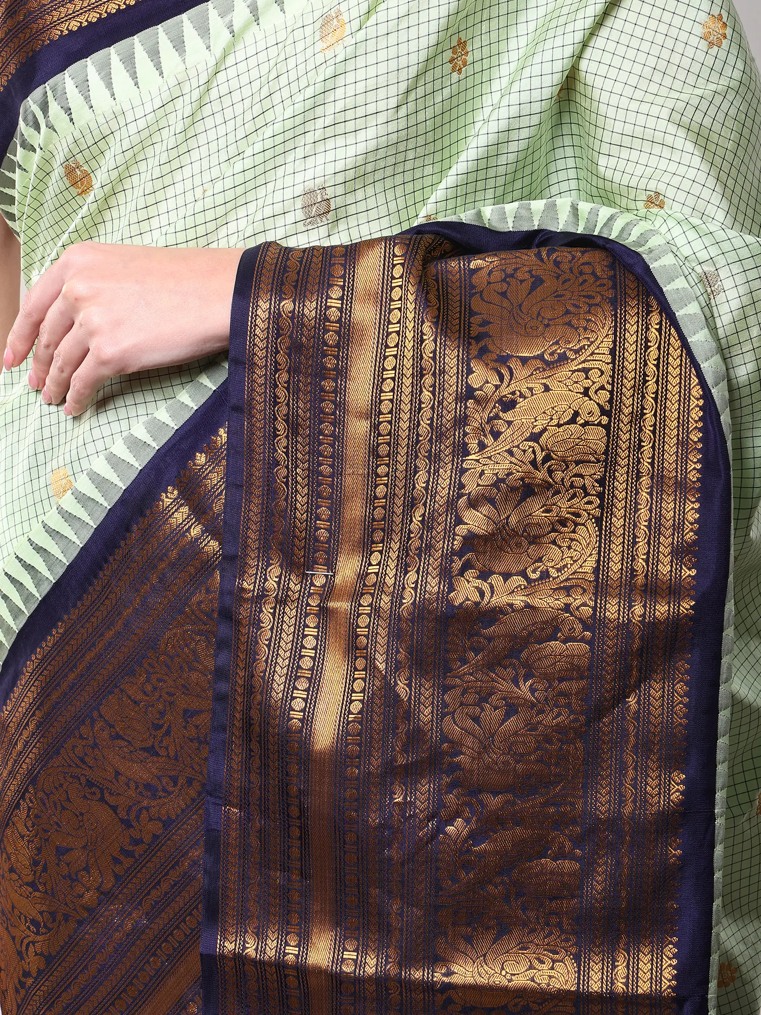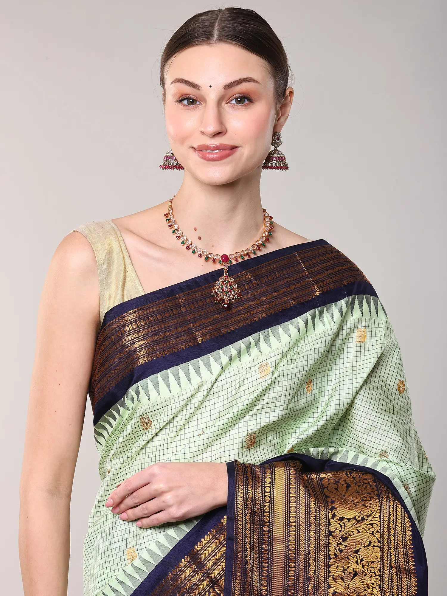 Lime-Green Pure Silk Graph Checks Saree with Zari woven Contrast Pallu and Temple Border from Bangalore