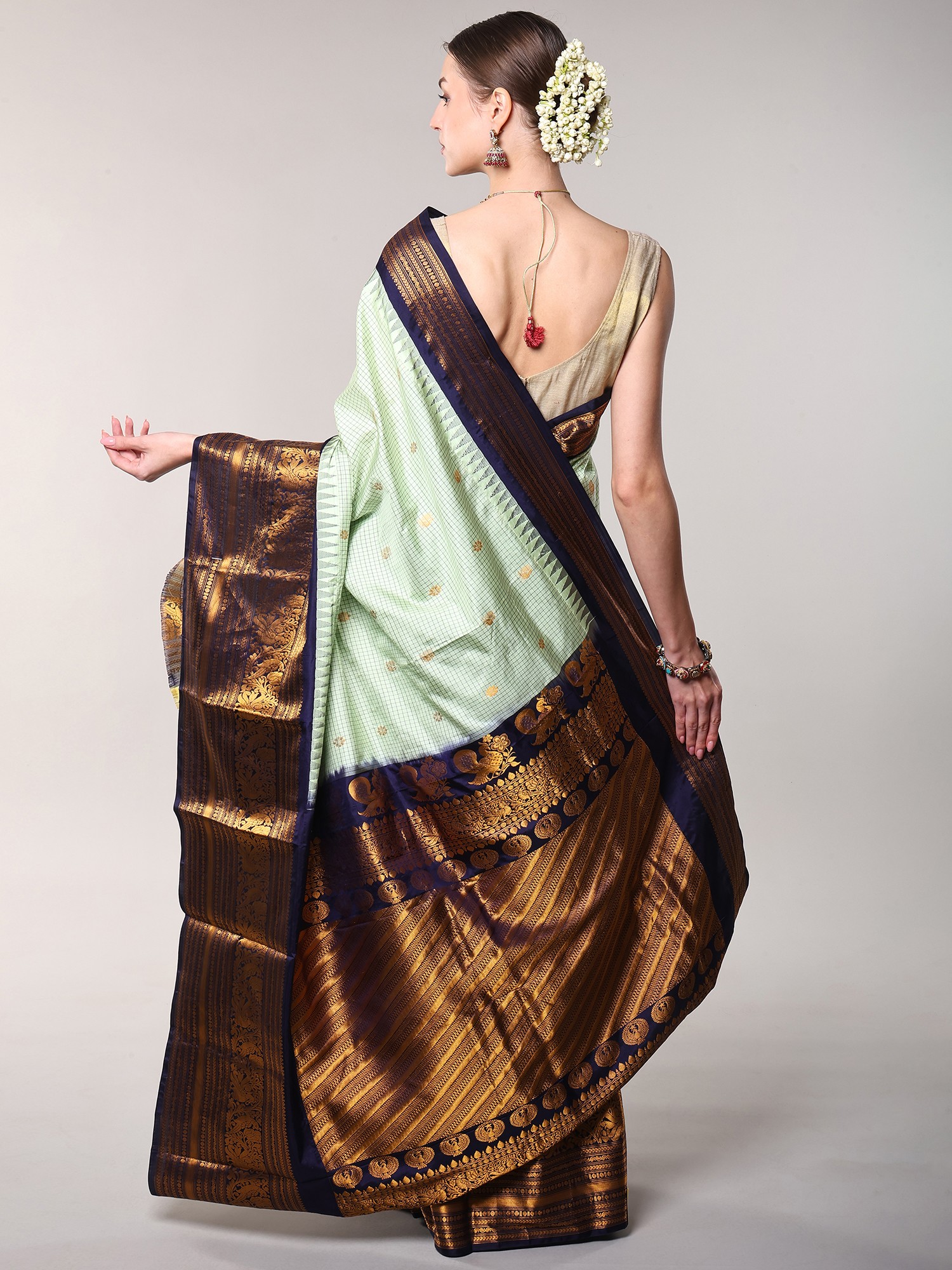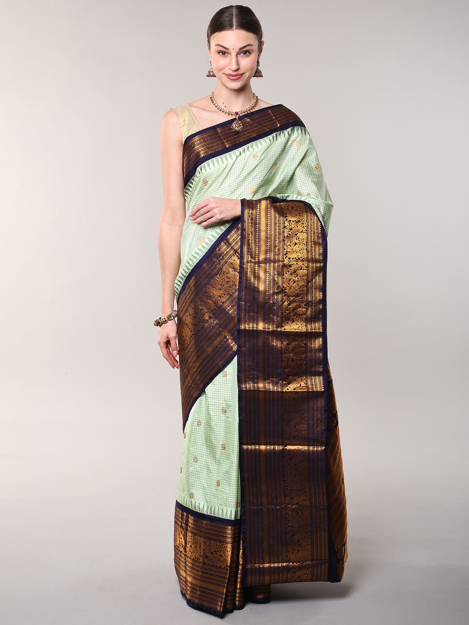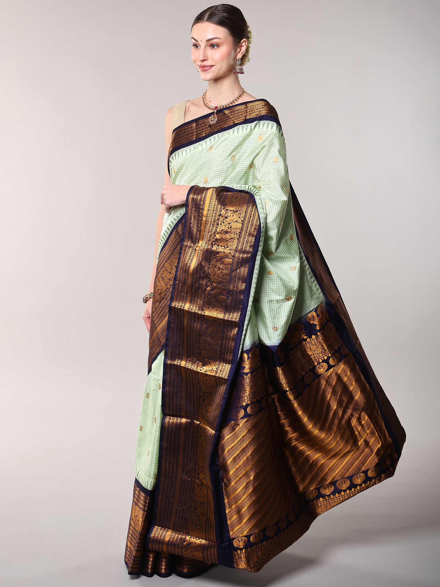 Lime-Green Pure Silk Graph Checks Saree with Zari woven Contrast Pallu and Temple Border from Bangalore