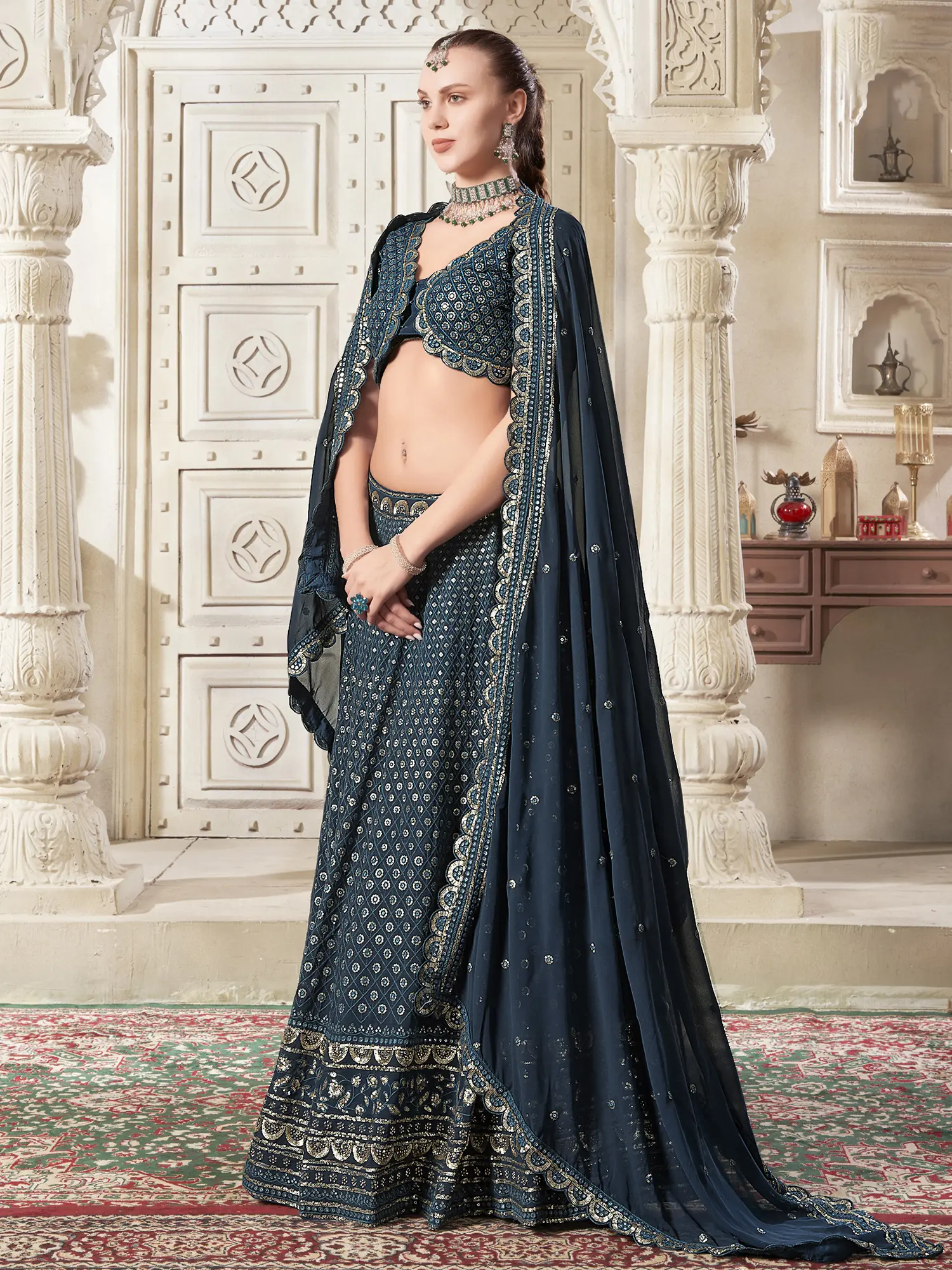 Completing this magnificent ensemble is a flowing dupatta made from the same premium georgette. The dupatta is generously sized, allowing for various styling options. Its edges are finished with a coordinating border of sequins and thread work, echoing the intricate details of the lehenga and choli, ensuring a cohesive and luxurious look. This dupatta adds an extra layer of grace and sophistication, perfect for framing the face or draping elegantly over the shoulders.