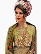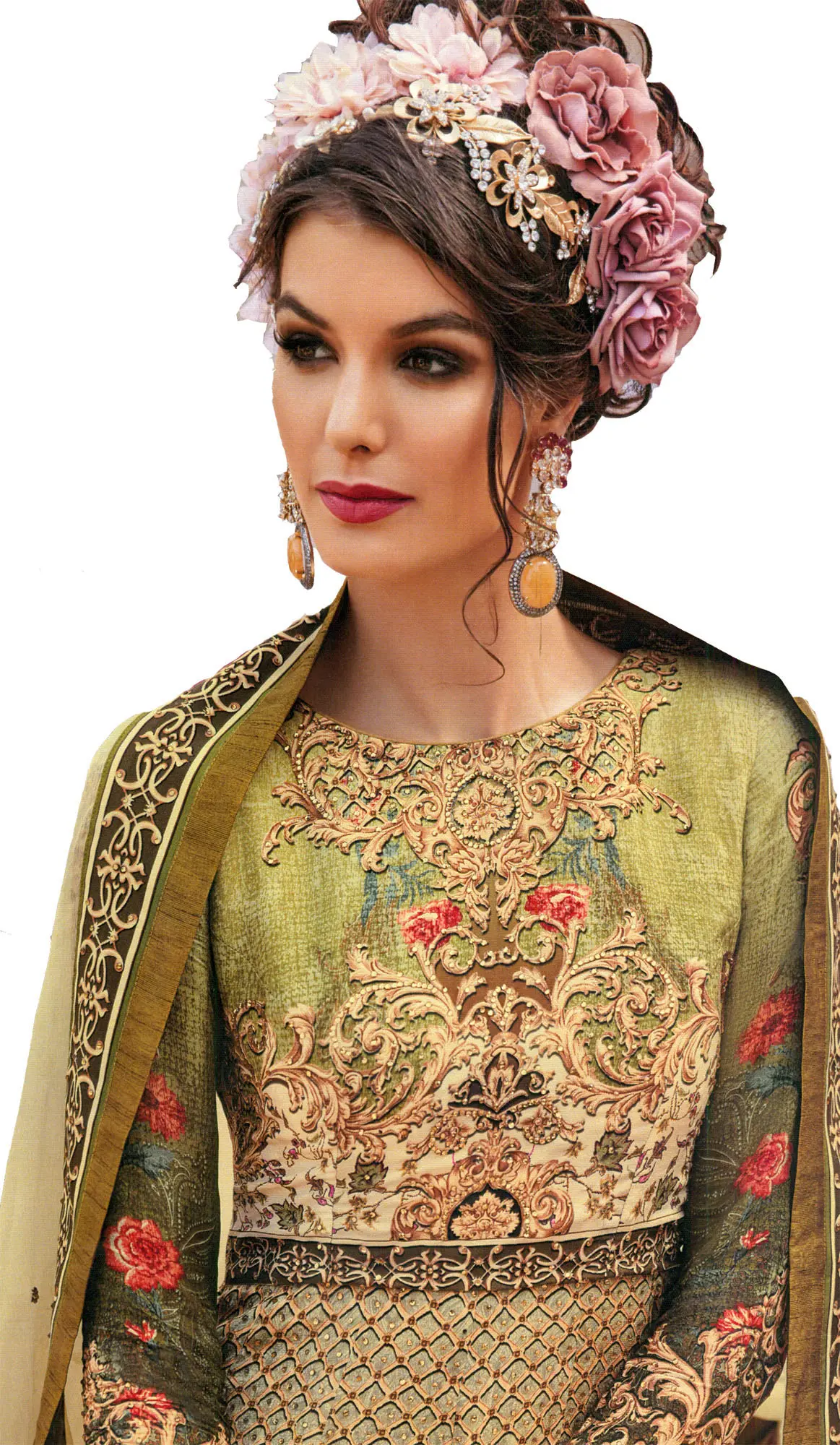 The classic Anarkali cut is renowned for its flattering silhouette, starting with a fitted bodice that gracefully flares out into a voluminous, floor-length skirt. This design not only creates a stunning visual impact as you move but also offers unparalleled comfort and freedom of movement. The long sleeves add an element of classic grace, perfect for occasions that call for modest yet striking attire. The georgette fabric ensures that the skirt cascades beautifully, adding to the overall ethereal charm of the suit. This Linden-Green Anarkali Suit is more than just an outfit; it's a statement of elegance, a celebration of intricate artistry, and a promise of unforgettable presence. It is ideal for weddings, festive celebrations, cultural events, or any moment you desire to embrace sophisticated ethnic wear.