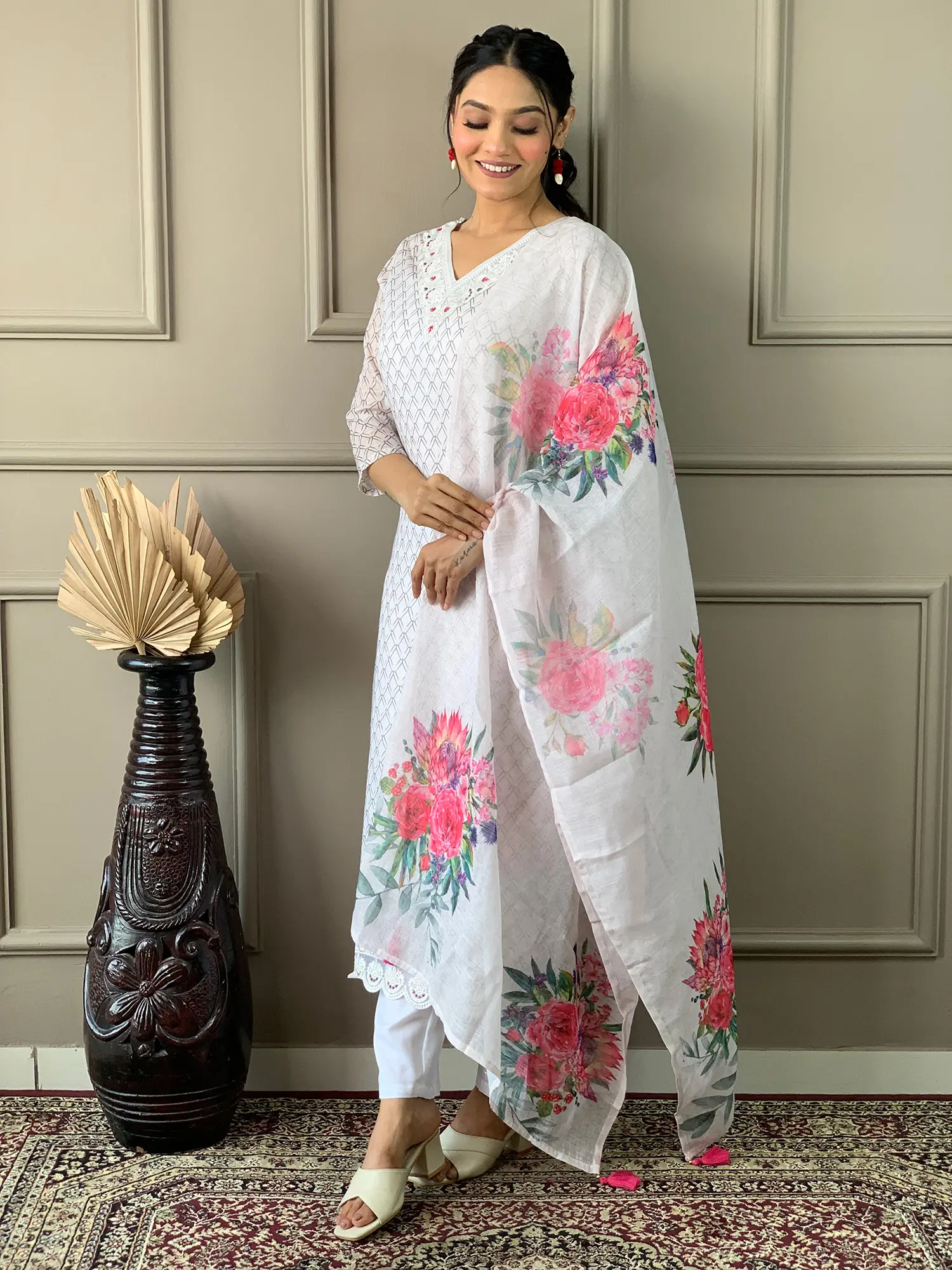 Antique-White Bedspread from Pilkhuwa with Printed Leaves