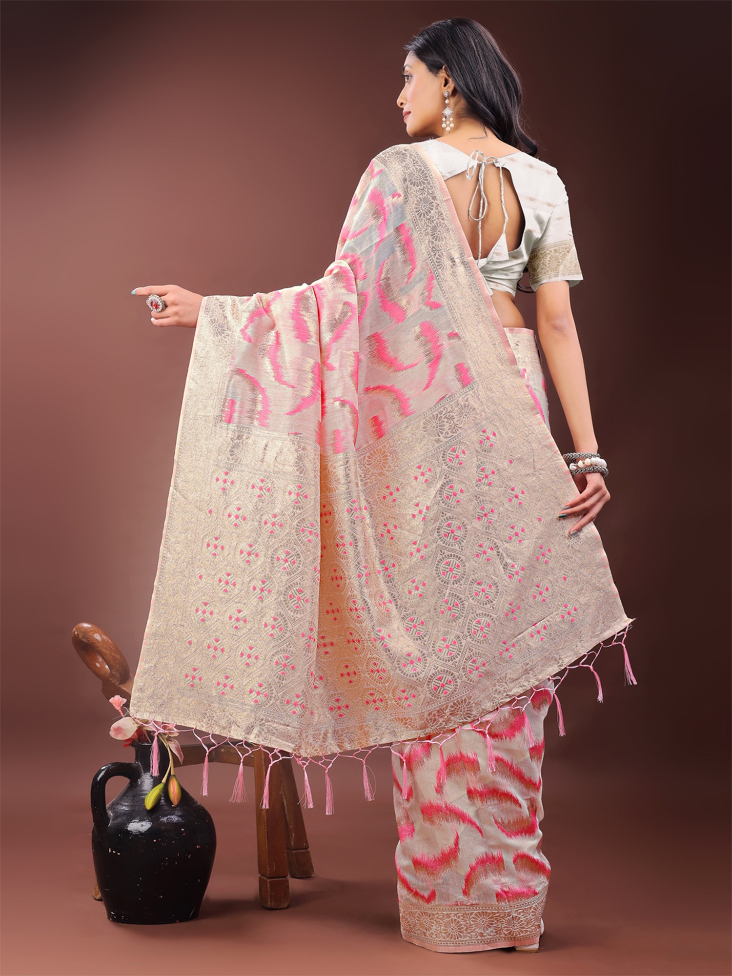 Organza Plain Traditional Attractive Festive Wear Saree With Contrast Tassels Pallu