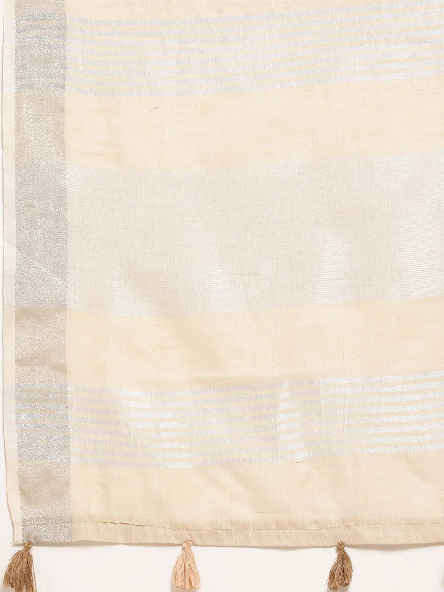 Discover the meticulous craftsmanship that defines this exquisite piece. Woven from a premium blend of linen and cotton, its texture is a testament to natural fibers' inherent beauty and breathability. The artisans employ traditional weaving techniques, intricately incorporating shimmering zari threads that catch the light with every movement, a signature of true artisanal dedication.