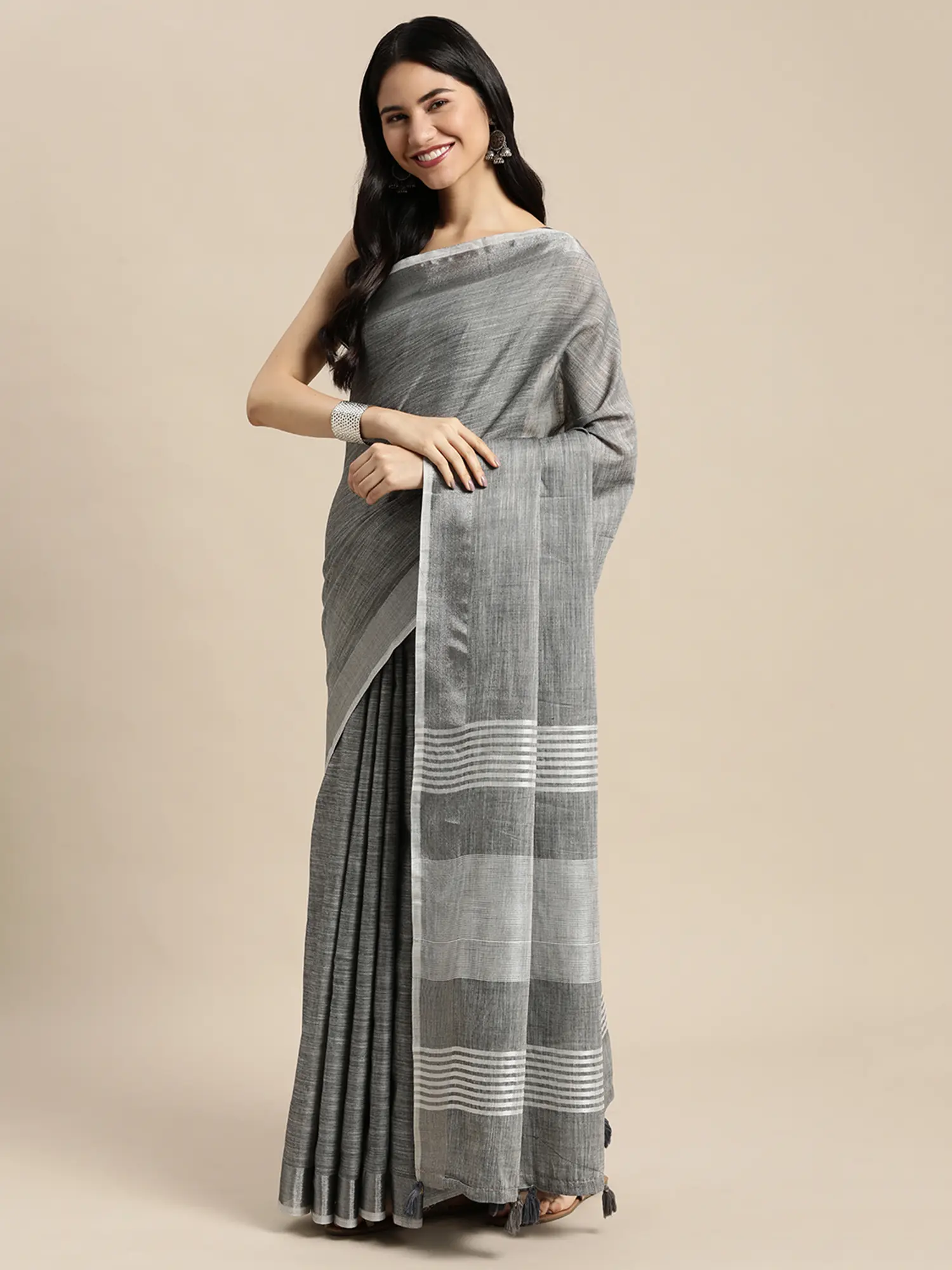 You'll appreciate the subtle yet striking visual appeal. The fabric boasts a delicate, slub-like texture inherent to fine linen, offering a refined depth. A gracefully woven border, accented with metallic zari, adorns the edges, leading to a captivating pallu finished with carefully crafted tassels that add a playful yet elegant flourish. This sophisticated color palette ensures versatile styling for numerous ensembles.