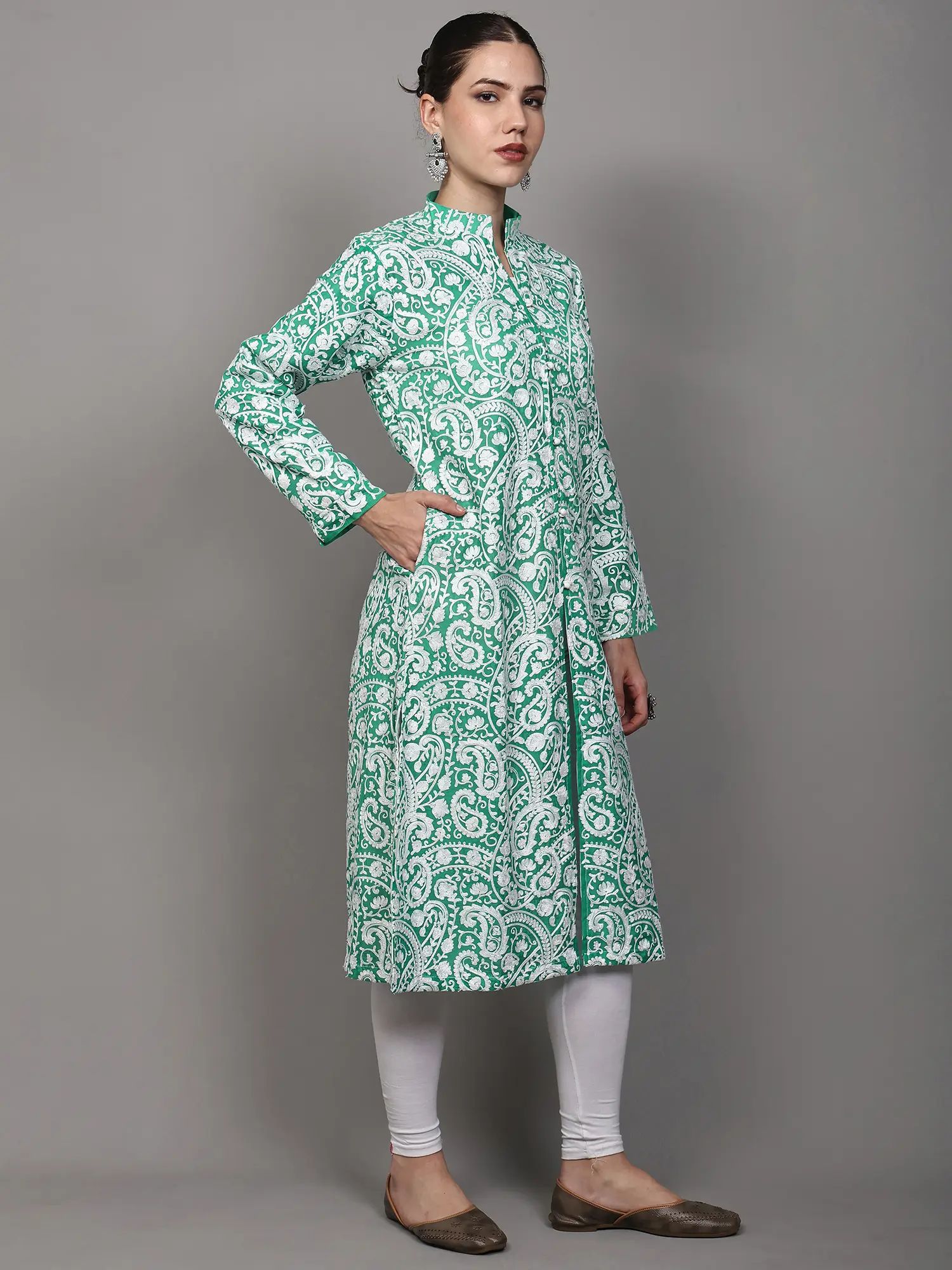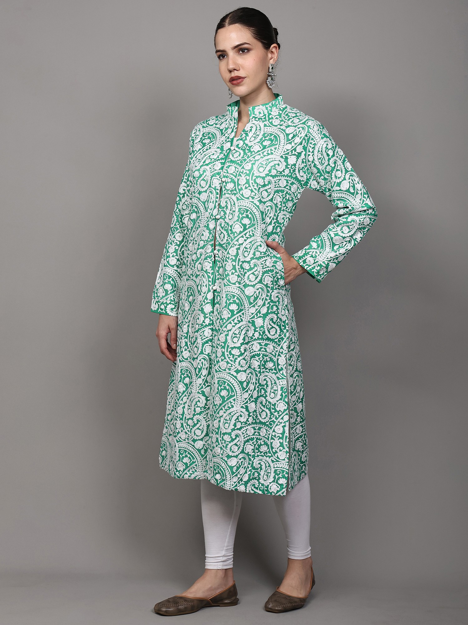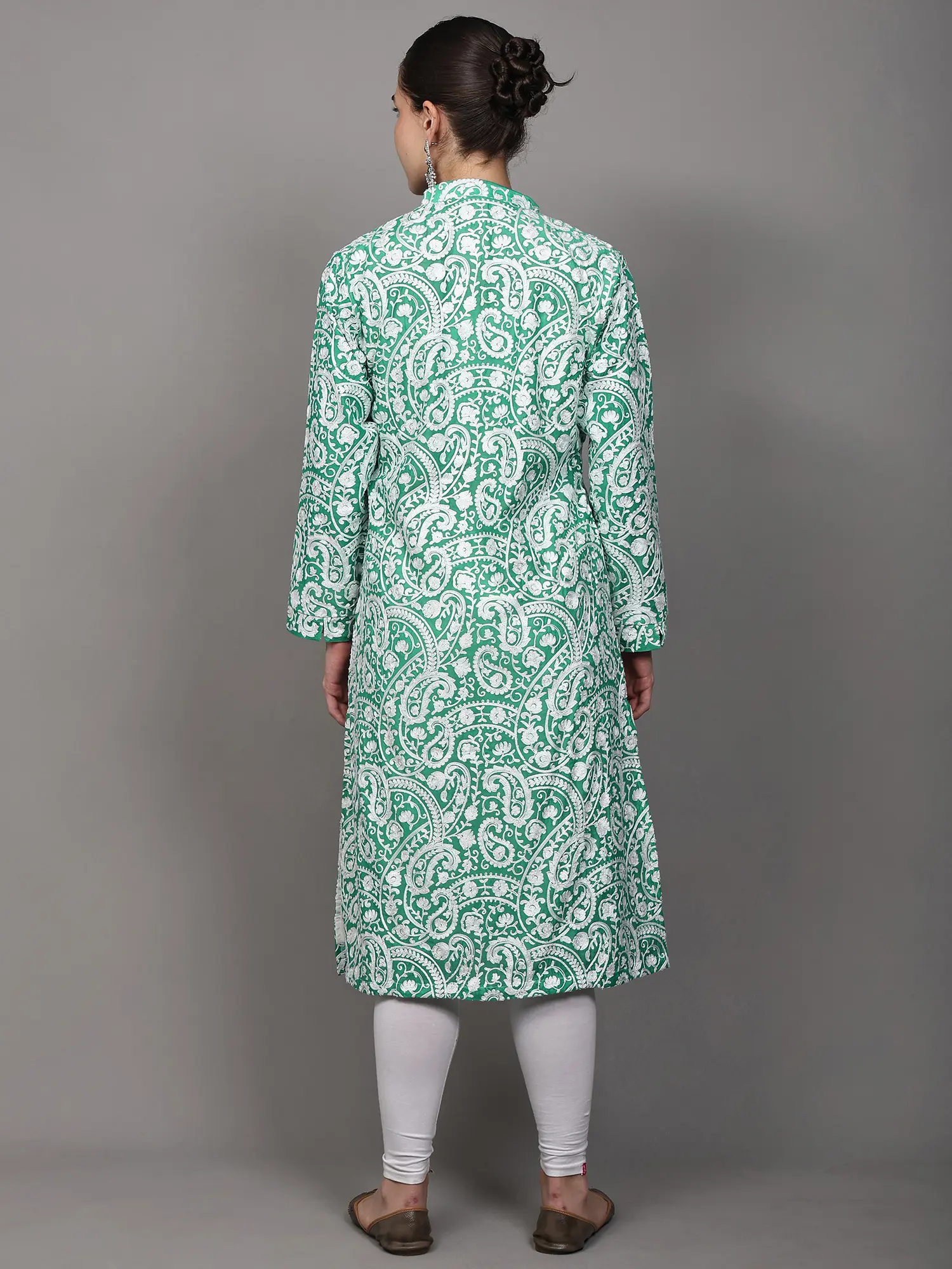 Wool Long Jacket from Kashmir With Aari-Embroidered Giant Leaves and Flowers All-Over