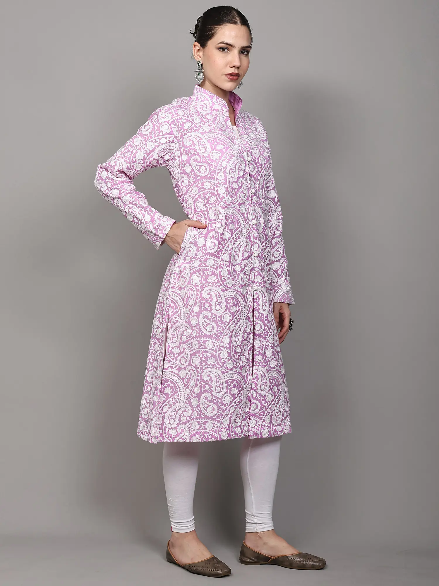 Creole-Pink Long Jacket with Aari Embroidered Maple Vines from Kashmir