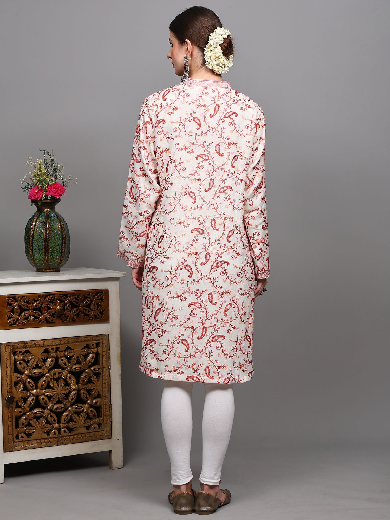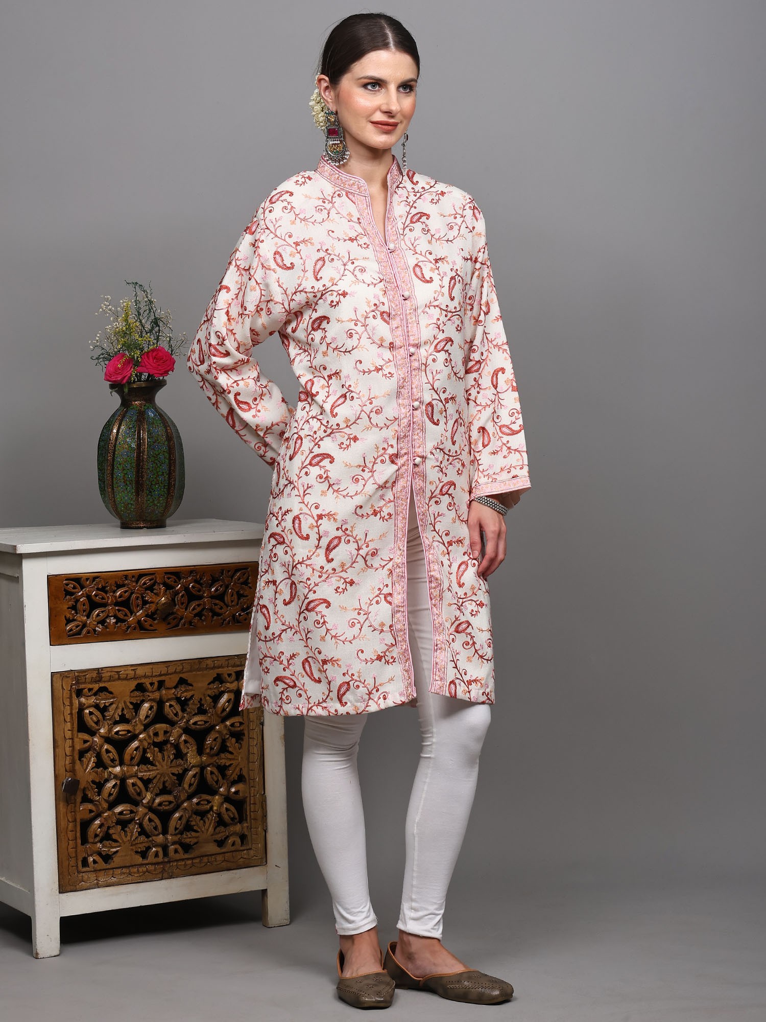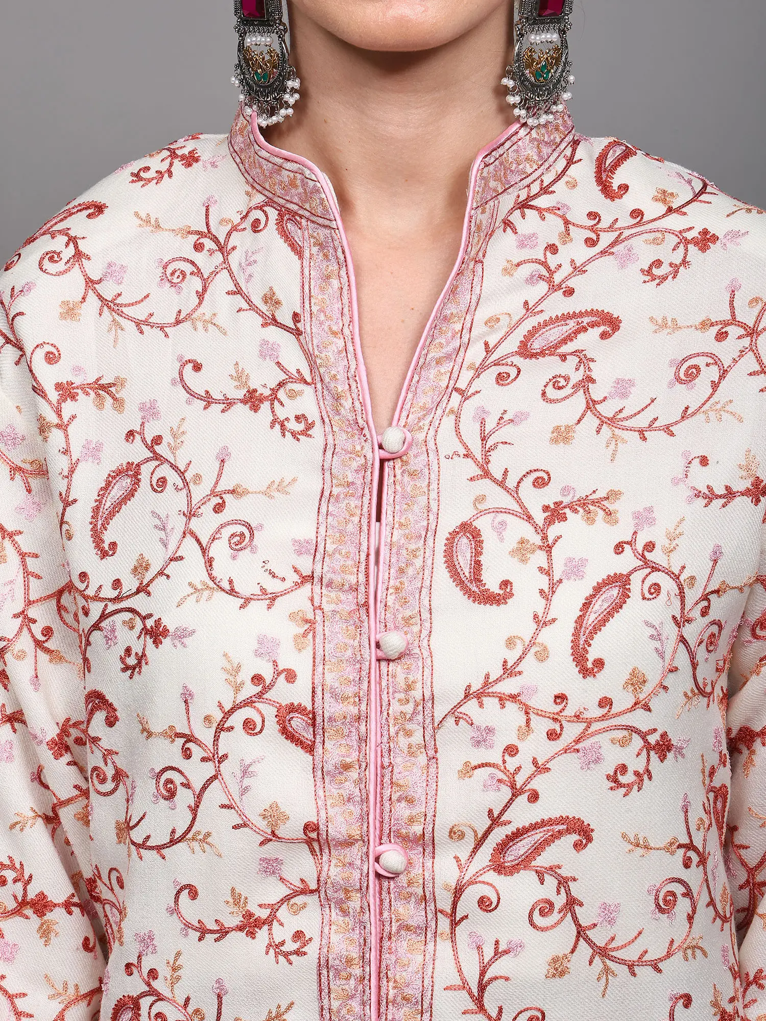 Cannoli-Cream Pure Wool Long Jacket from Kashmir with Intricate Chain Stitch Embroidered Foliage and Side Pockets
