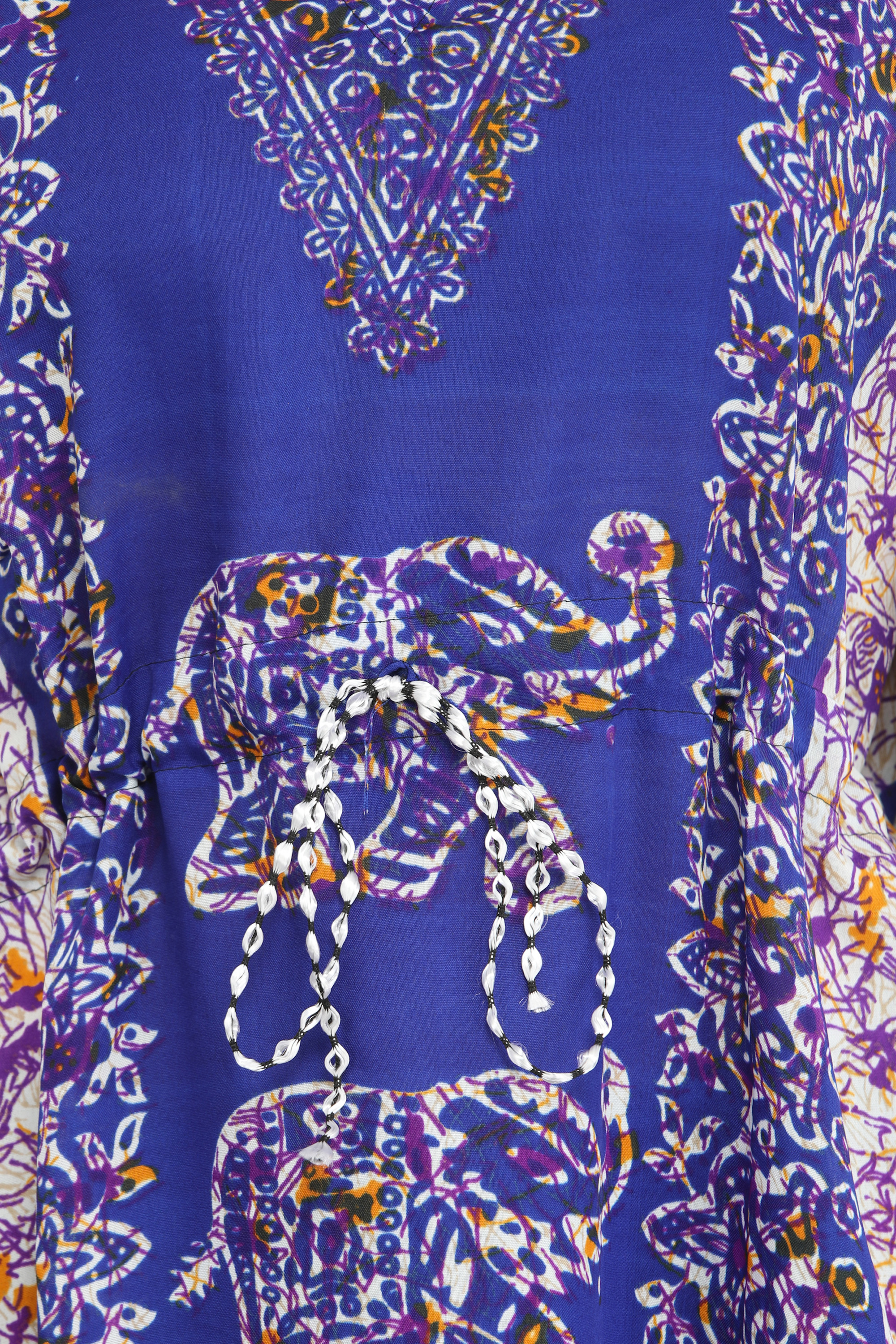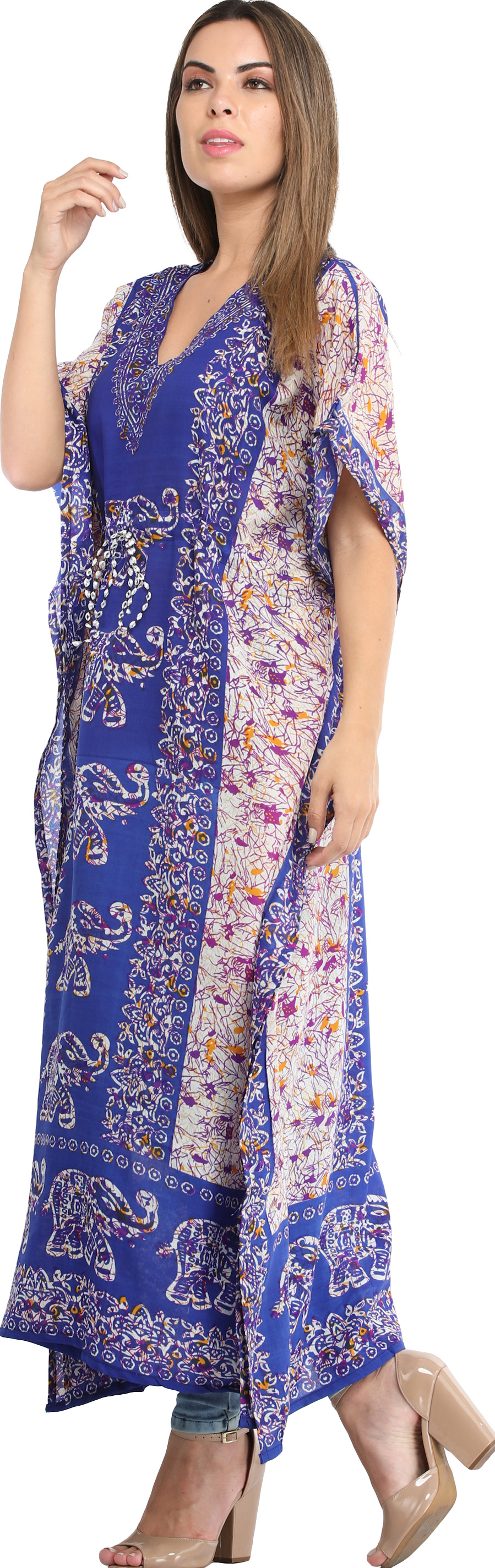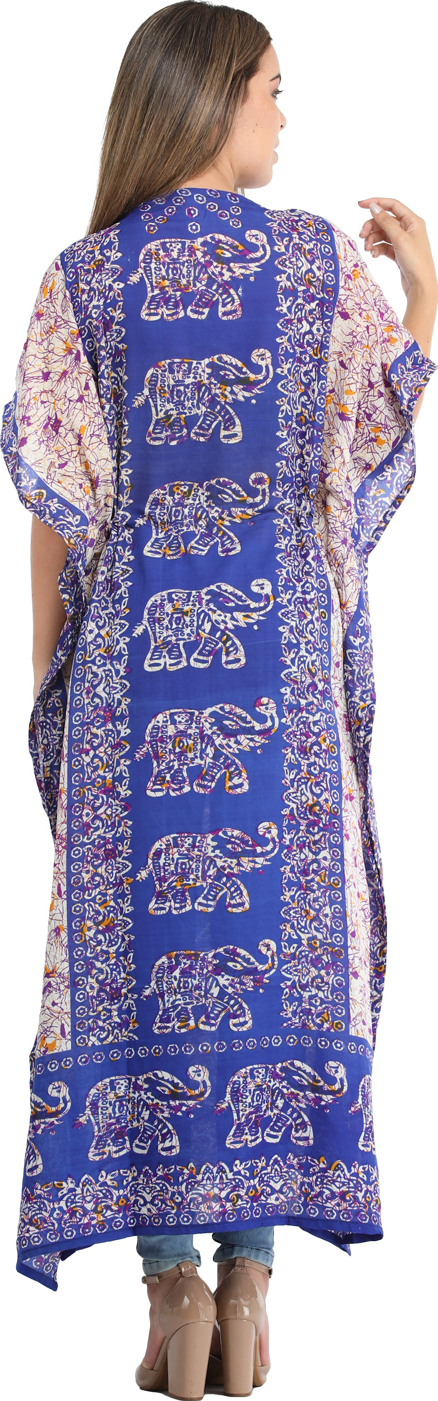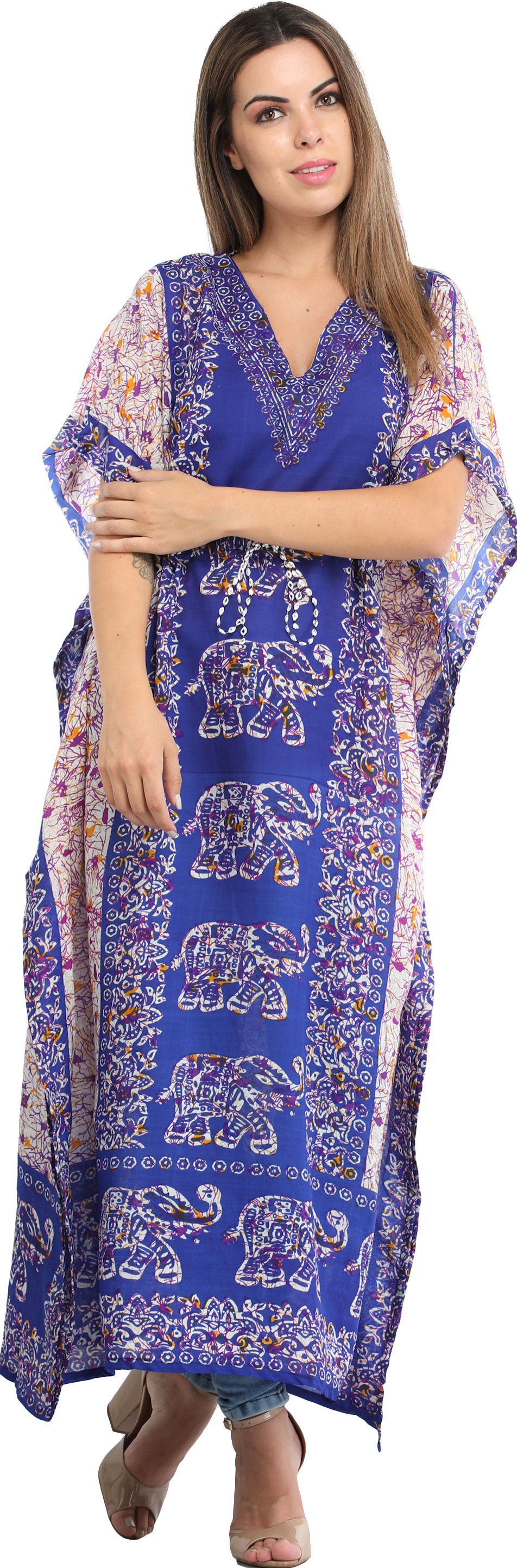 Carry a royal charm in your everyday wear with this long Kaftan, which is adorned with the regal elephant symbol. The comfy viscose flows beautifully, with a breezy feel that you will love in your moments of leisure and comfort, complemented by a classic Indian motif of an elephant that adds a hint of timeless Indian beauty to the dress.