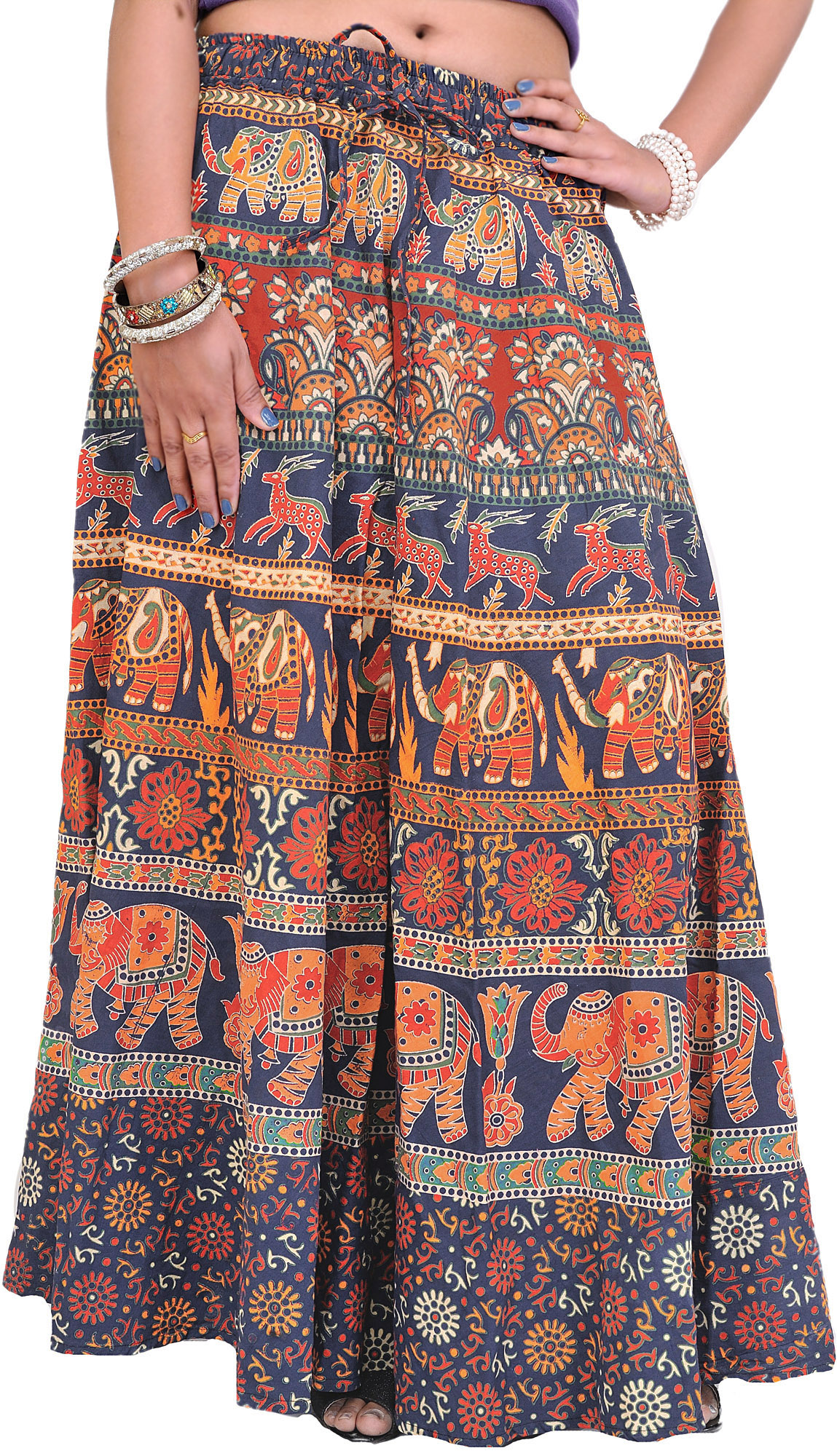 Stone-Brown Sanganeri Midi Skirt with Elephants and Deer Motifs