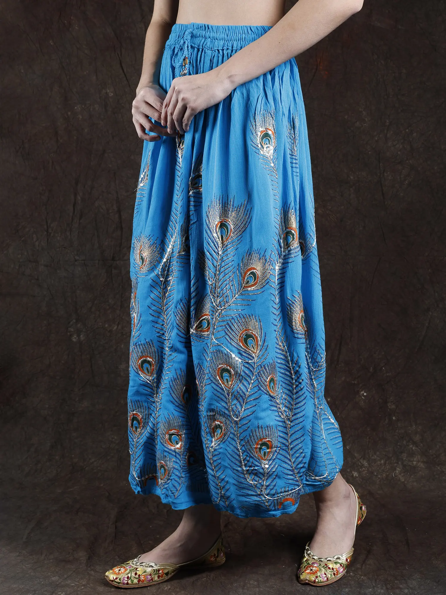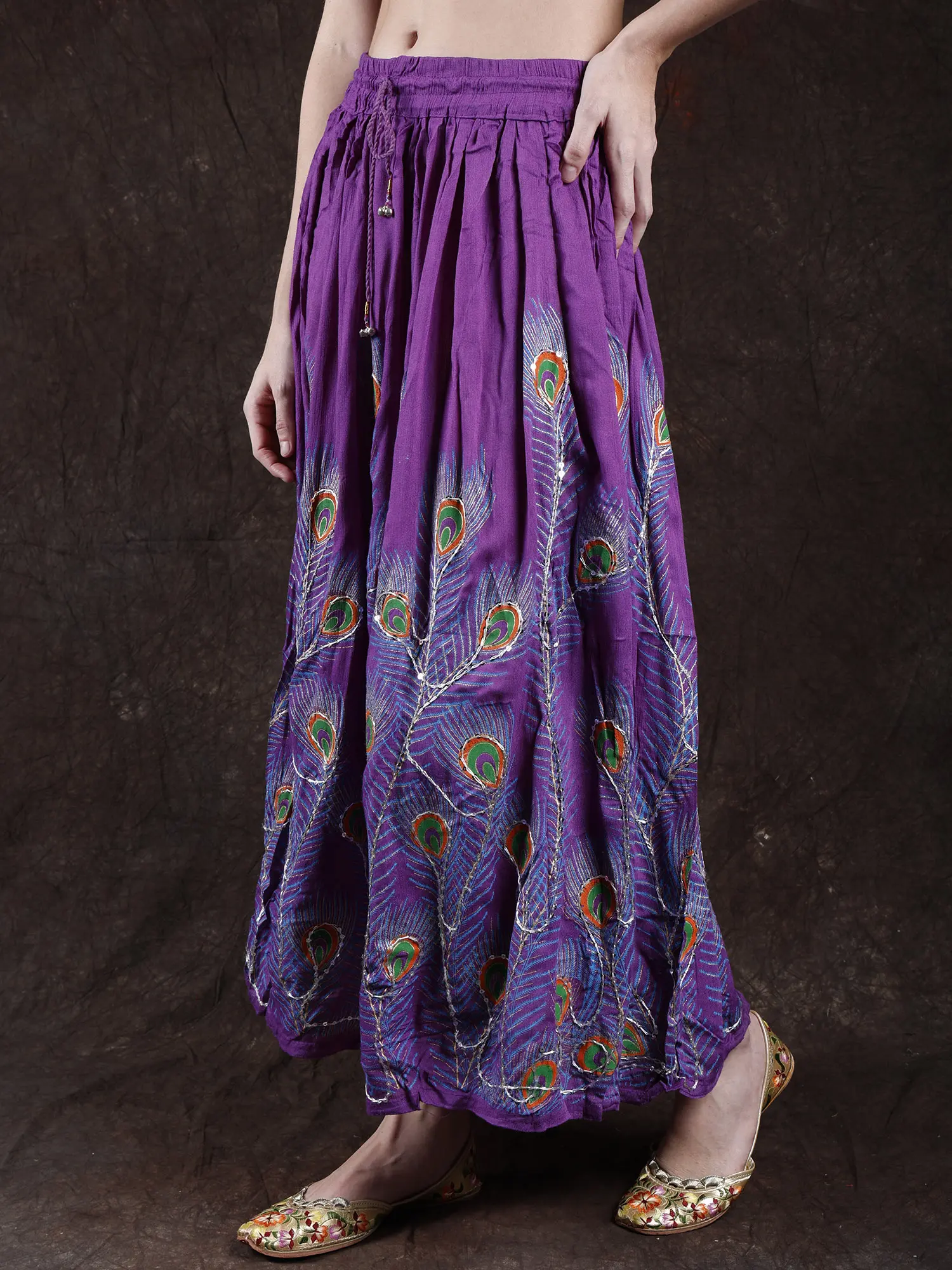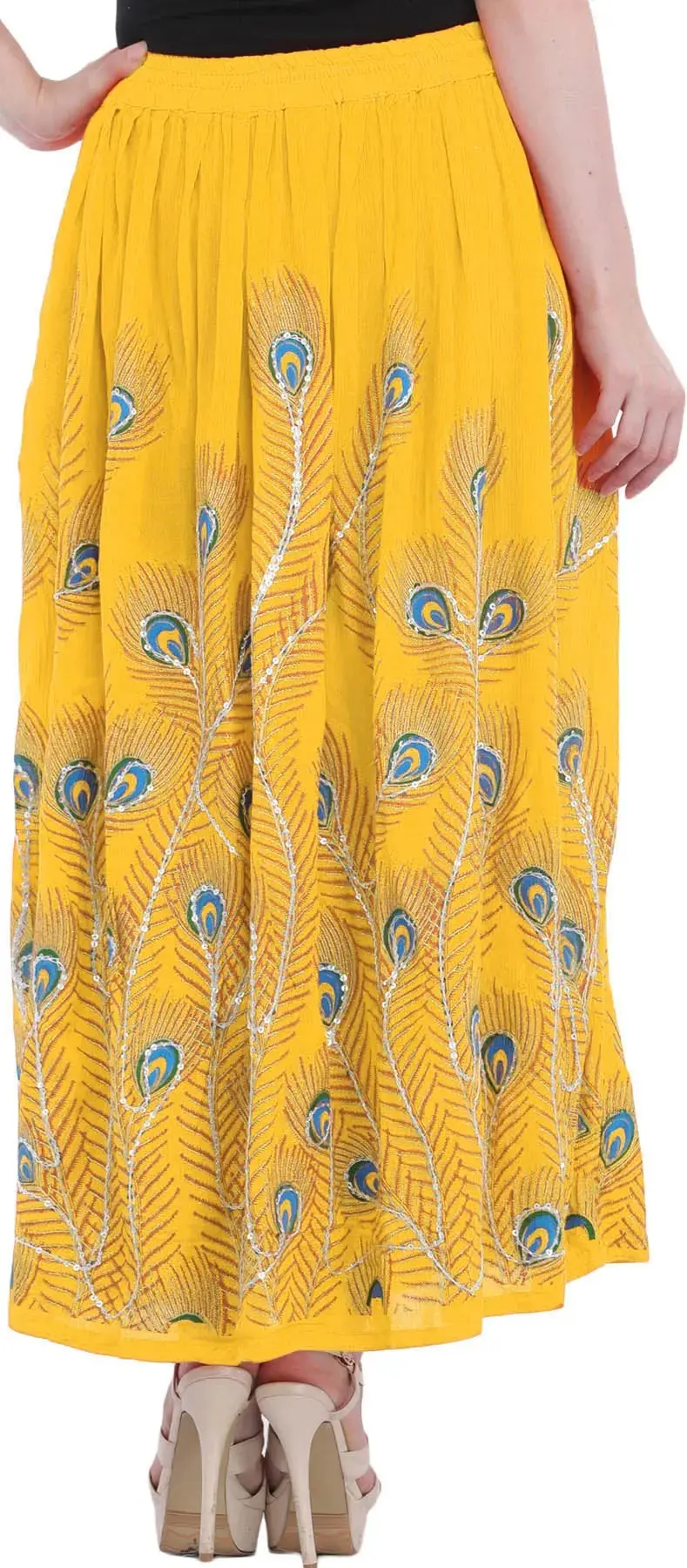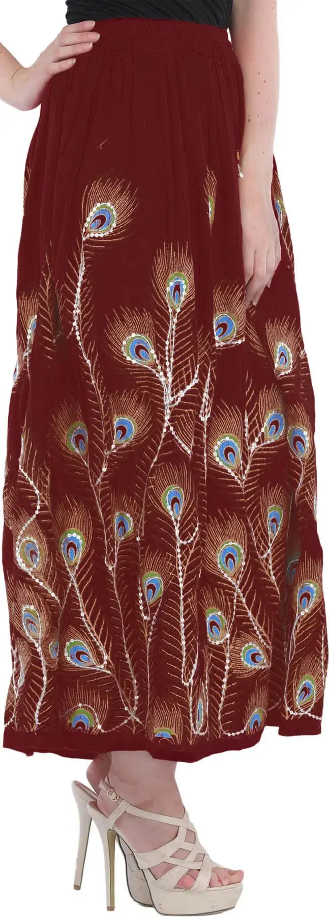 Elevate your style with a long skirt adorned with printed peacock feathers and delicately embroidered sequins. The peacock feathers and delicately embroidered sequins. The peacock feather prints add a touch of grace, while the embroidered sequins bring a subtle hint of glamour to the ensemble. Embrace the beauty of peacock feather prints and sequins for a look that captures attention with its unique and enchanting appeal.