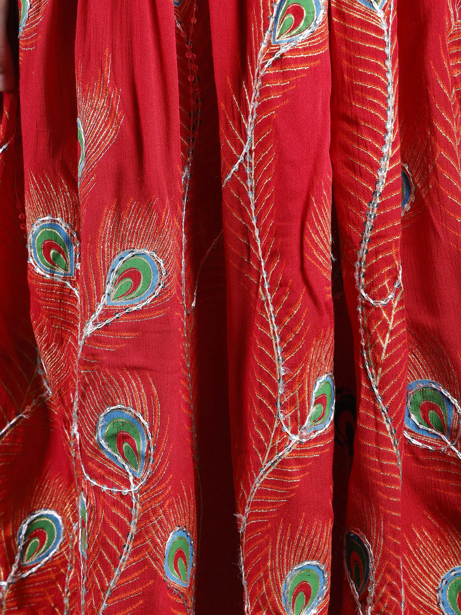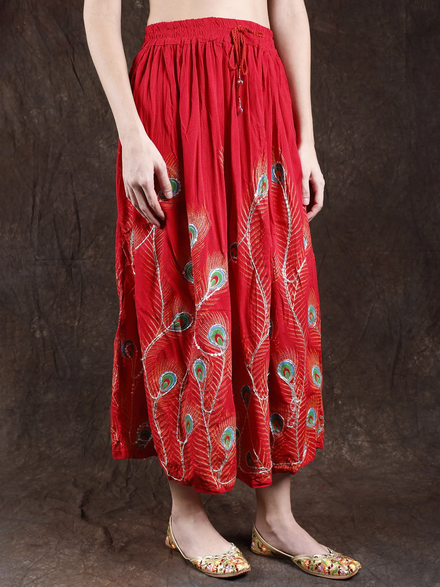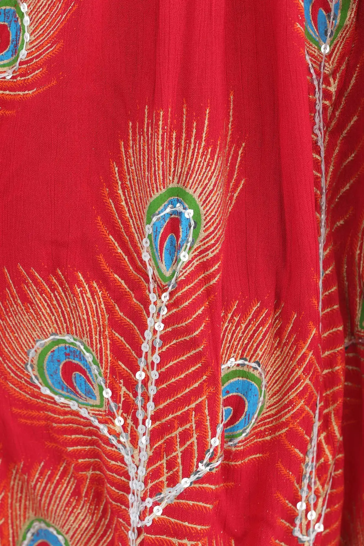 Elevate your style with a long skirt adorned with printed peacock feathers and delicately embroidered sequins. The peacock feathers and delicately embroidered sequins. The peacock feather prints add a touch of grace, while the embroidered sequins bring a subtle hint of glamour to the ensemble. Embrace the beauty of peacock feather prints and sequins for a look that captures attention with its unique and enchanting appeal.