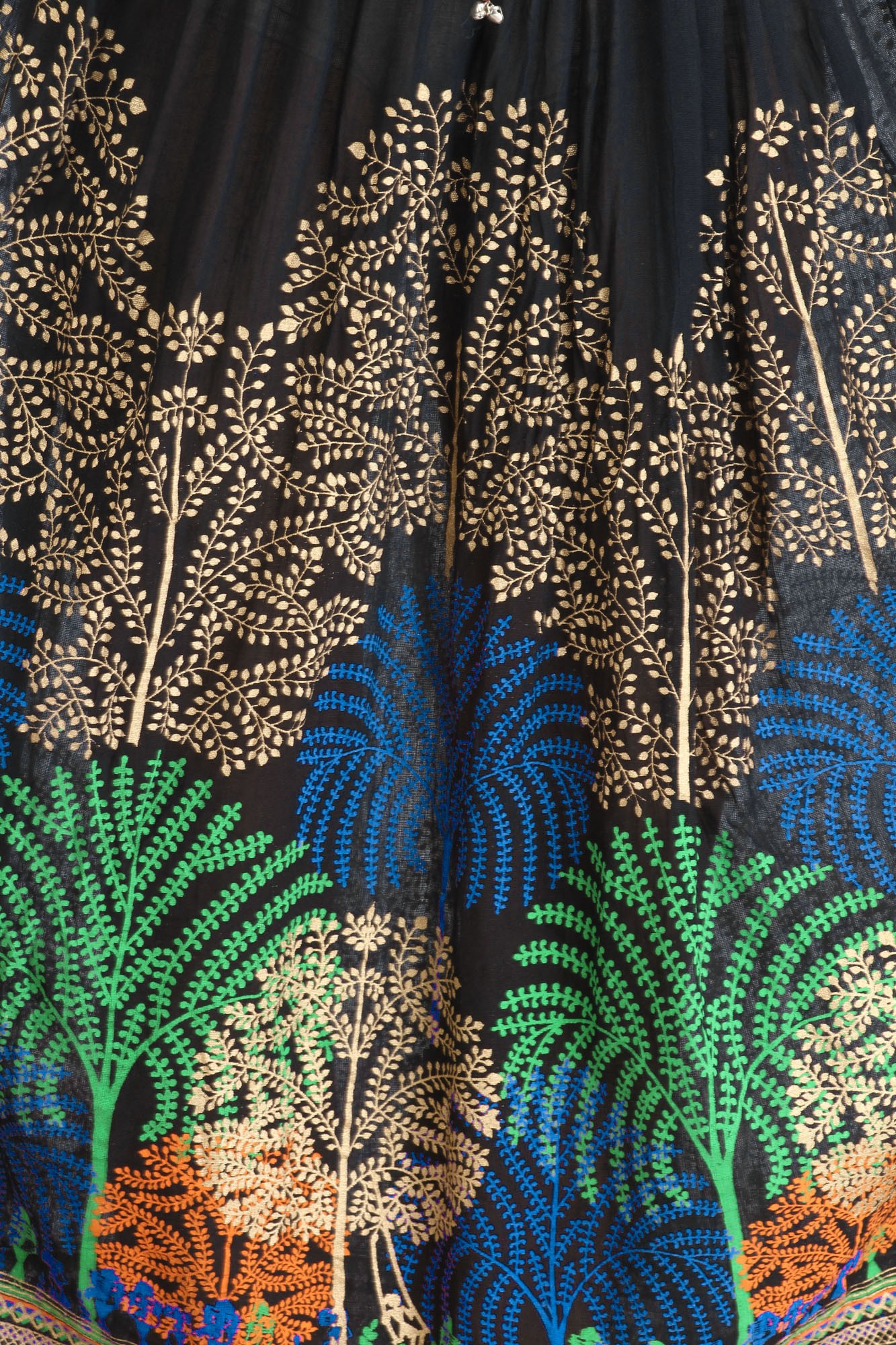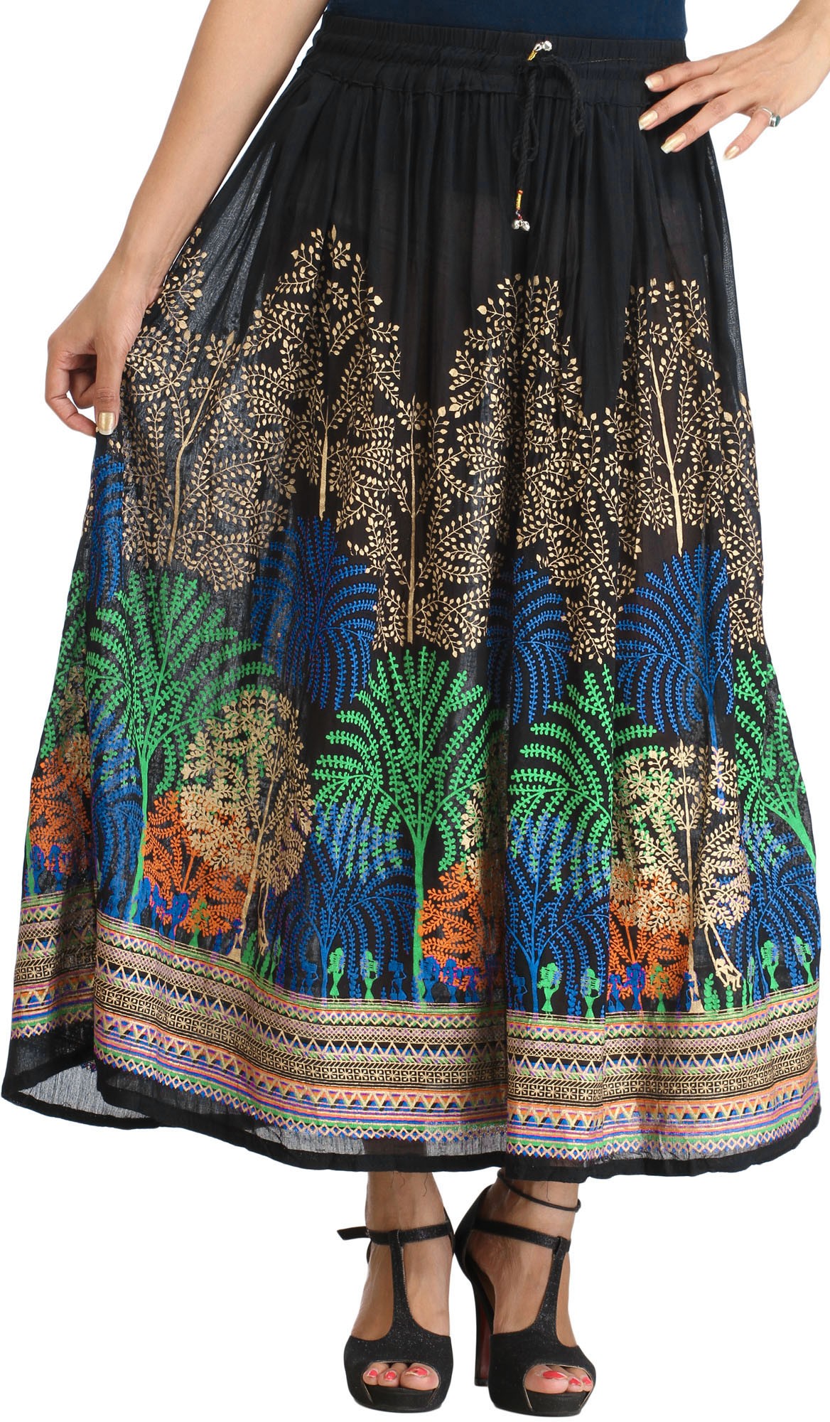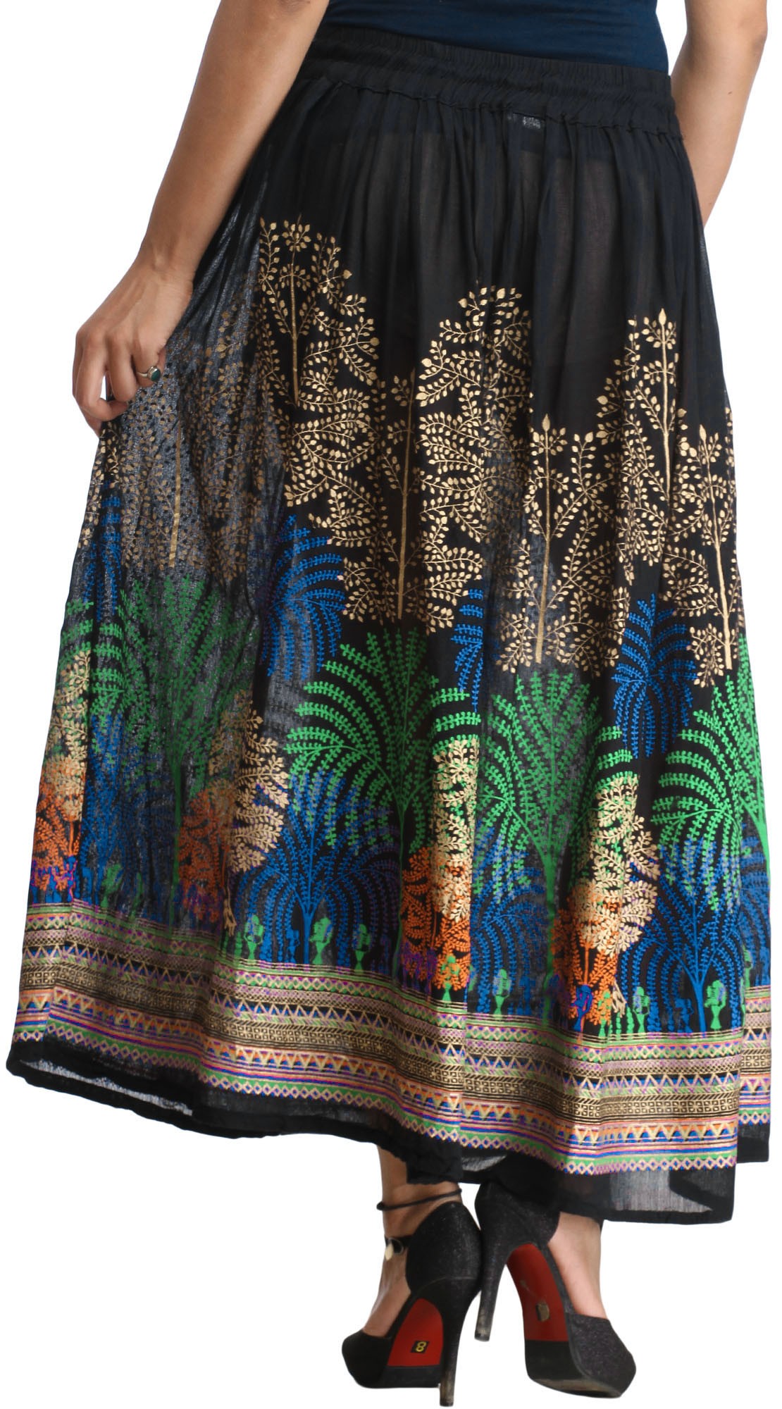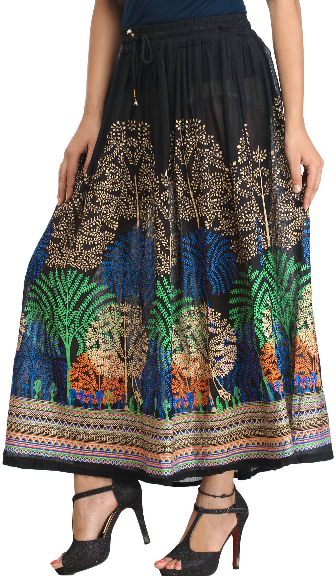Step into a world of whimsical beauty with this captivating long skirt. Crafted from breathable rayon, it drapes gracefully, offering both comfort and style. The deep, caviar-black canvas provides a stunning backdrop for a vibrant, tree-filled landscape that awakens the imagination.