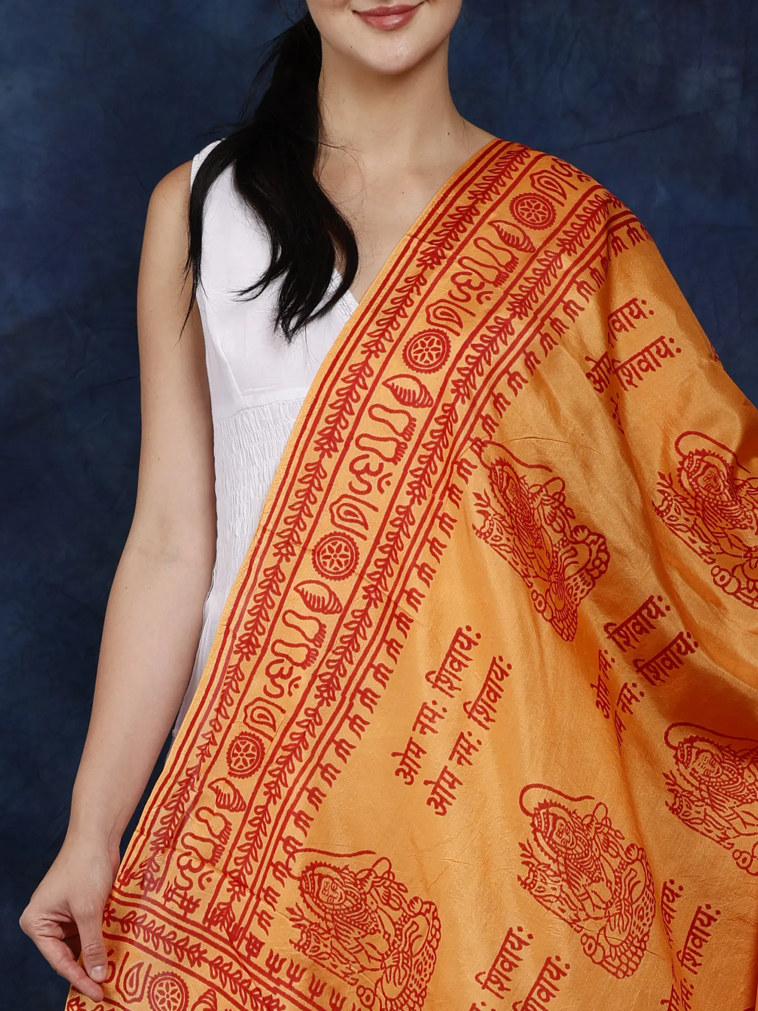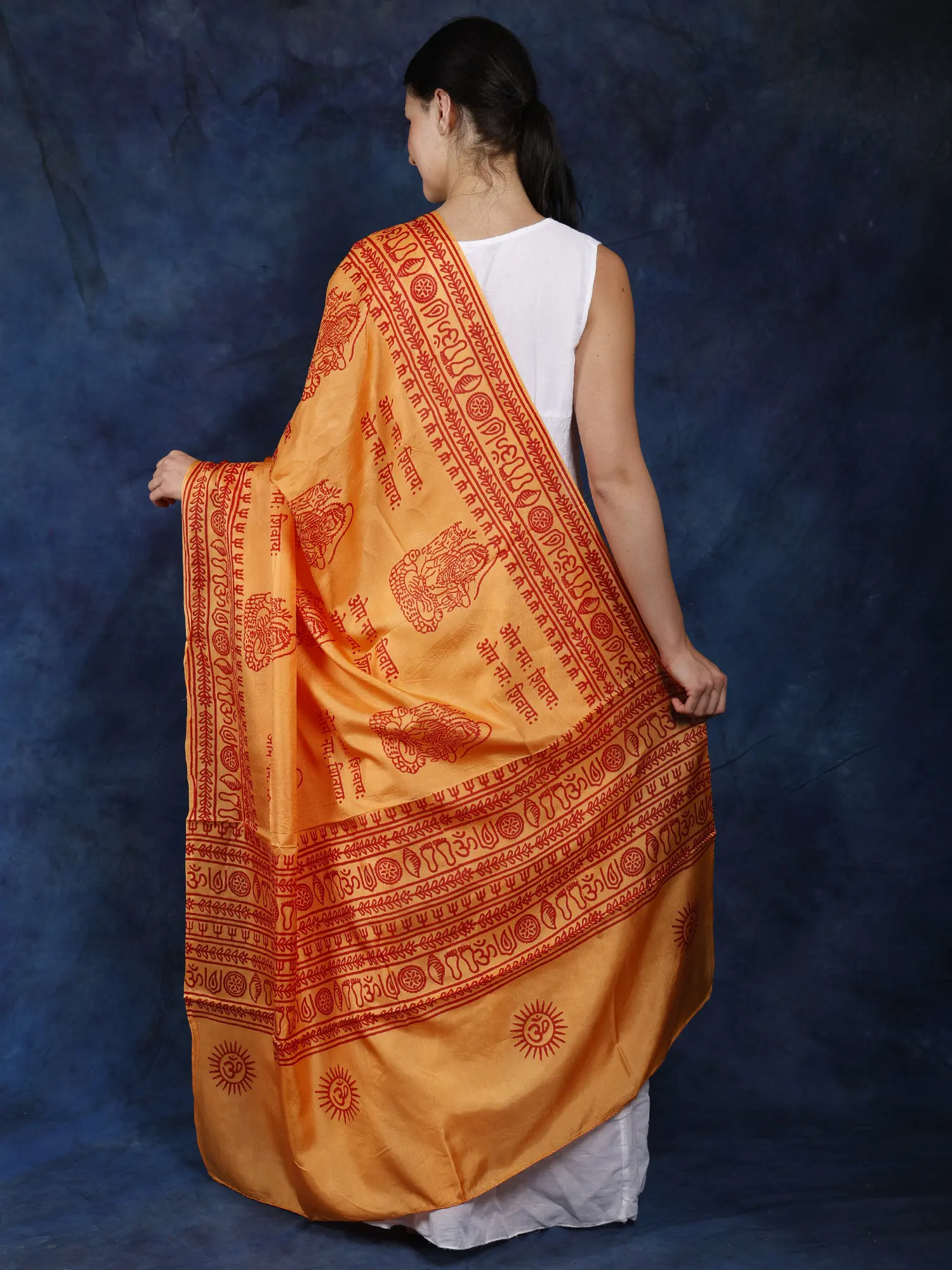 The striking visual appeal of this shawl is undeniable. The rich orange fabric, illuminated by the subtle sheen of silk, creates an inviting and radiant effect. The deep red print stands out boldly, drawing the eye to the sacred imagery and mantra. This combination of color and design evokes a sense of divine energy and spiritual vibrancy. The meticulous placement of each symbol and the clarity of the printed mantra speak to the care and devotion that went into its creation. It is more than just an article of clothing; it is a wearable piece of art imbued with spiritual significance.