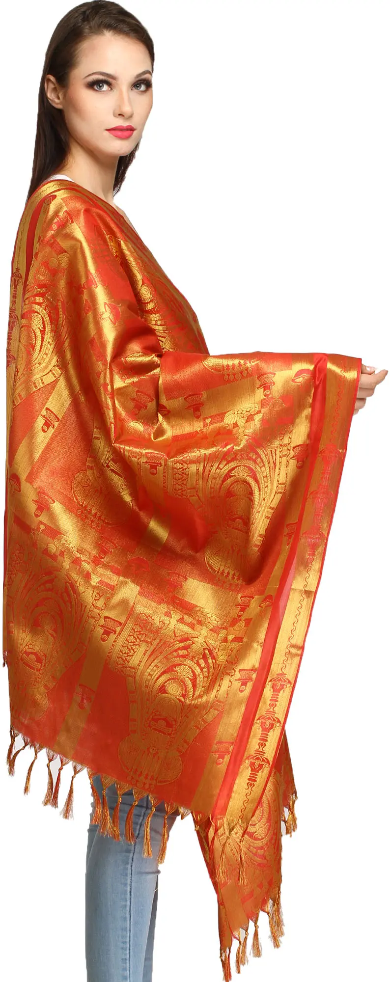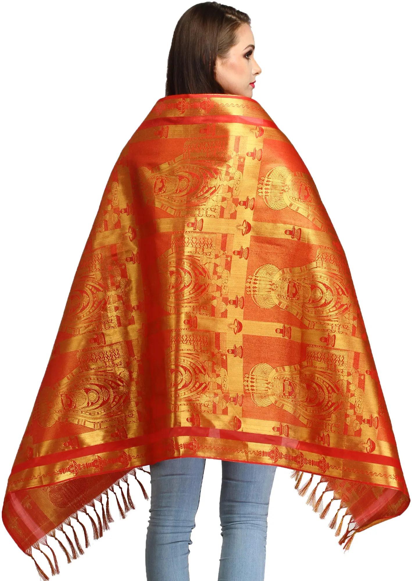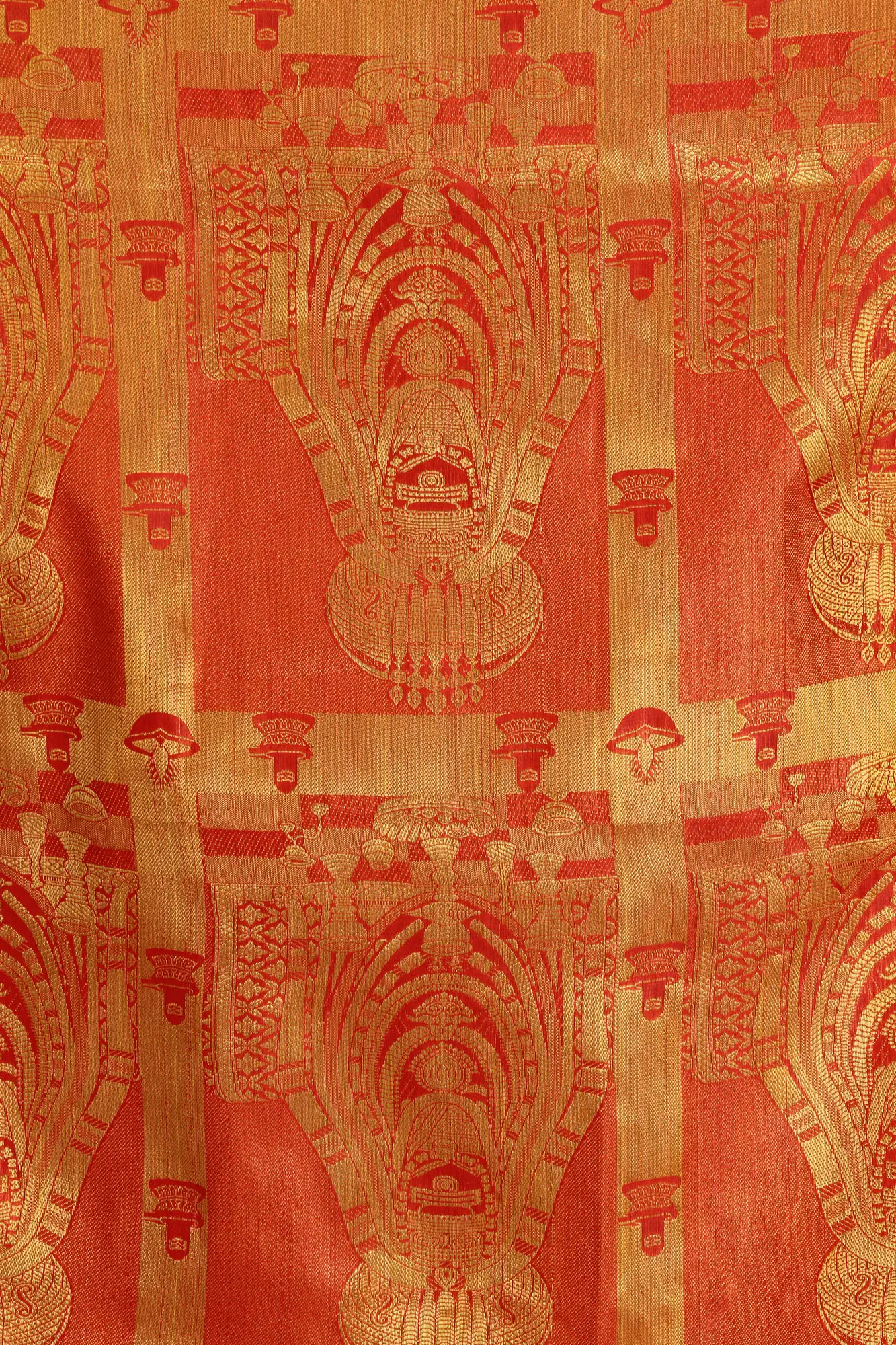 The design showcases stylized depictions of Lord Venkateshvara, rendered in lustrous gold thread. These sacred images are interspersed with traditional auspicious symbols and decorative borders, each element carefully woven to create a harmonious and visually captivating piece. The craftsmanship speaks to the rich heritage of South Indian textile artistry, where devotional textiles are not merely garments but sacred objects imbued with spiritual significance. The shimmering gold threads catch the light beautifully, adding a touch of opulence to the devotional theme, making it suitable for both quiet personal reflection and solemn religious ceremonies.