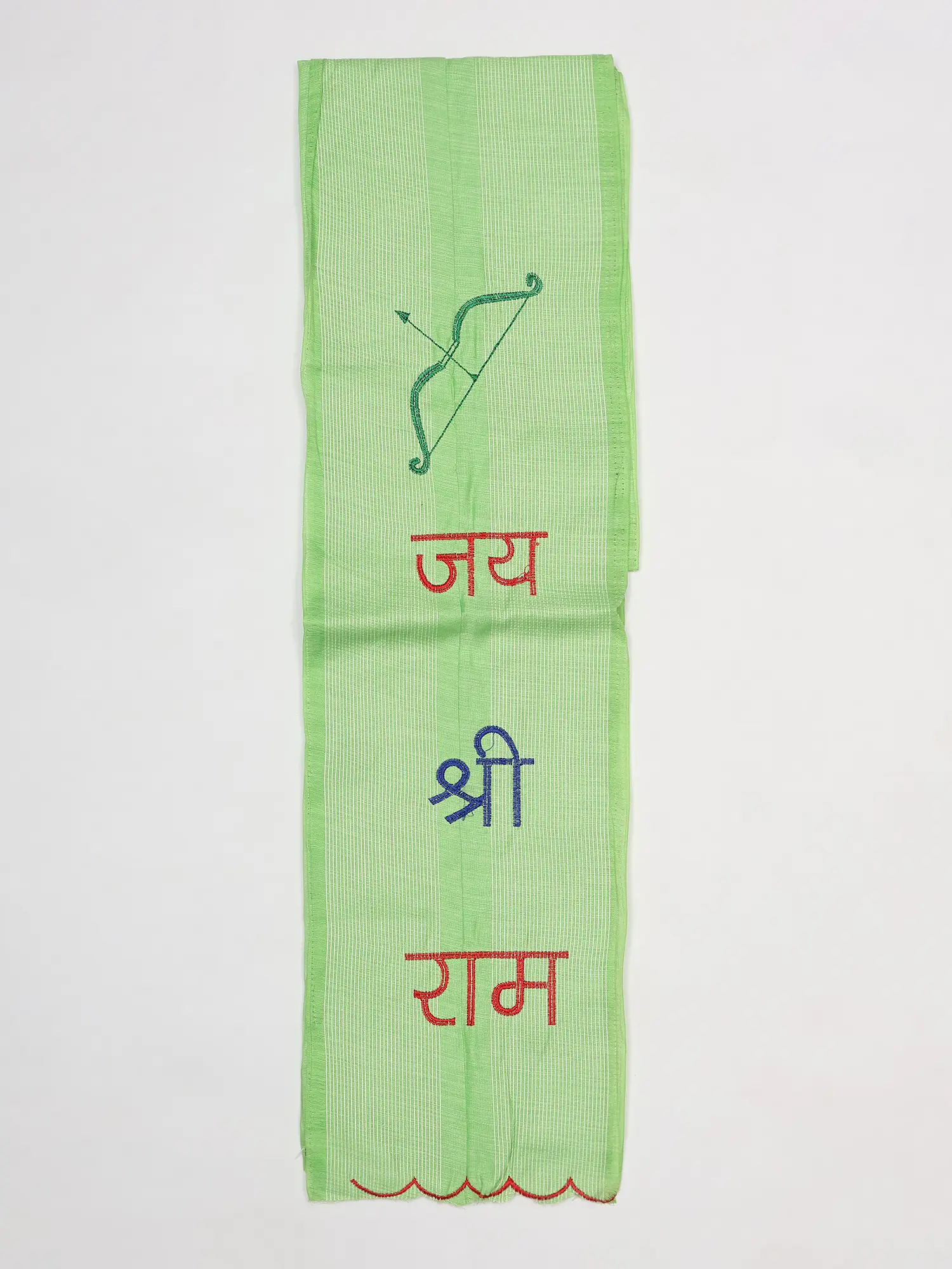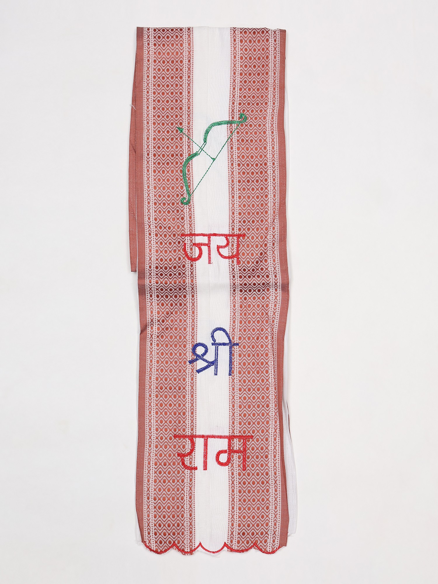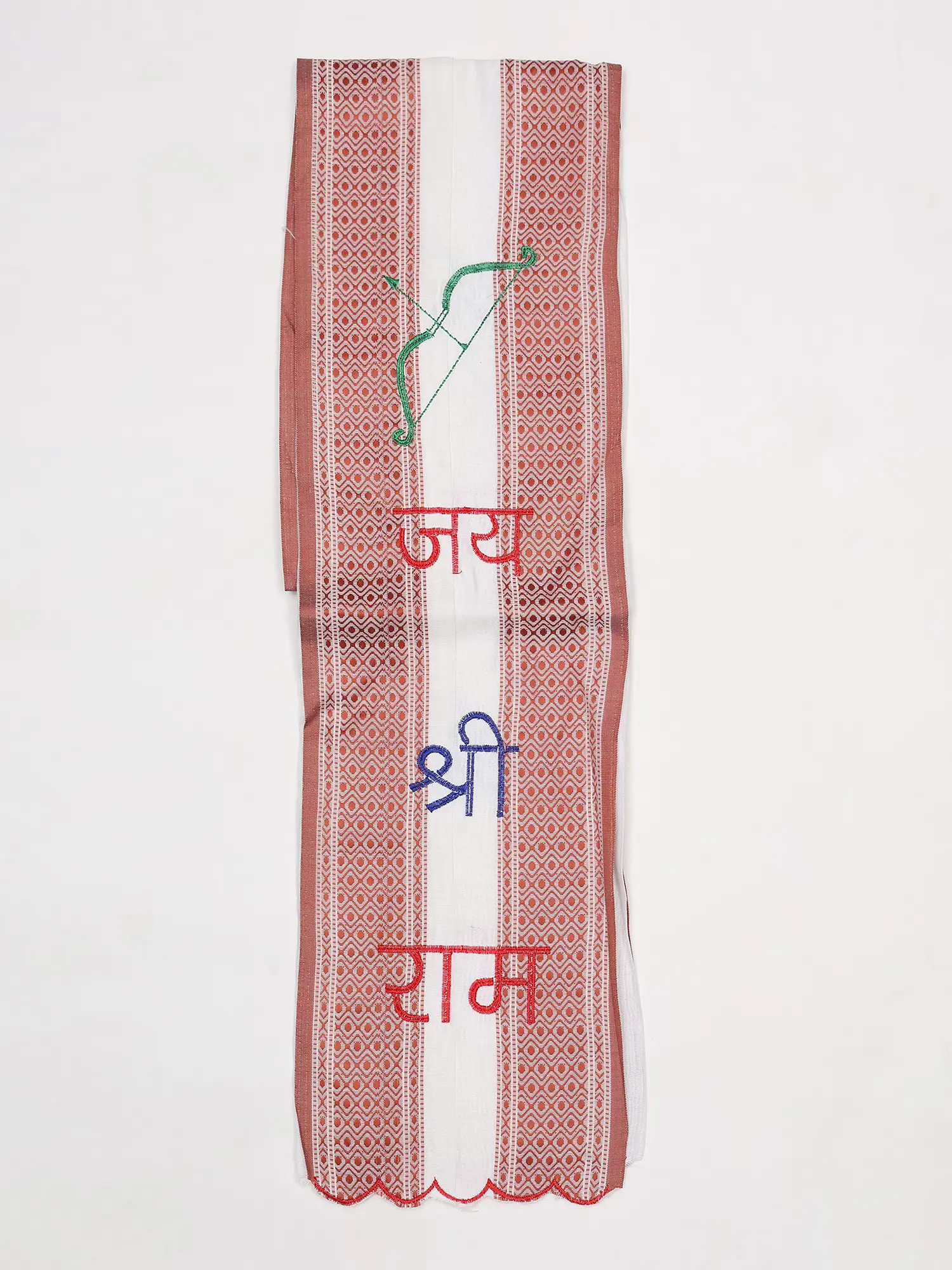 Crafted from lustrous Art Silk, each scarf embodies a dedication to quality and tradition. The fine threads are meticulously embroidered with the auspicious mantra "Jai Shree Ram" and the iconic imagery of Lord Rama's bow, a symbol of righteous strength and divine protection. The careful stitching ensures each detail is rendered with precision, reflecting a commitment to enduring beauty and spiritual significance.