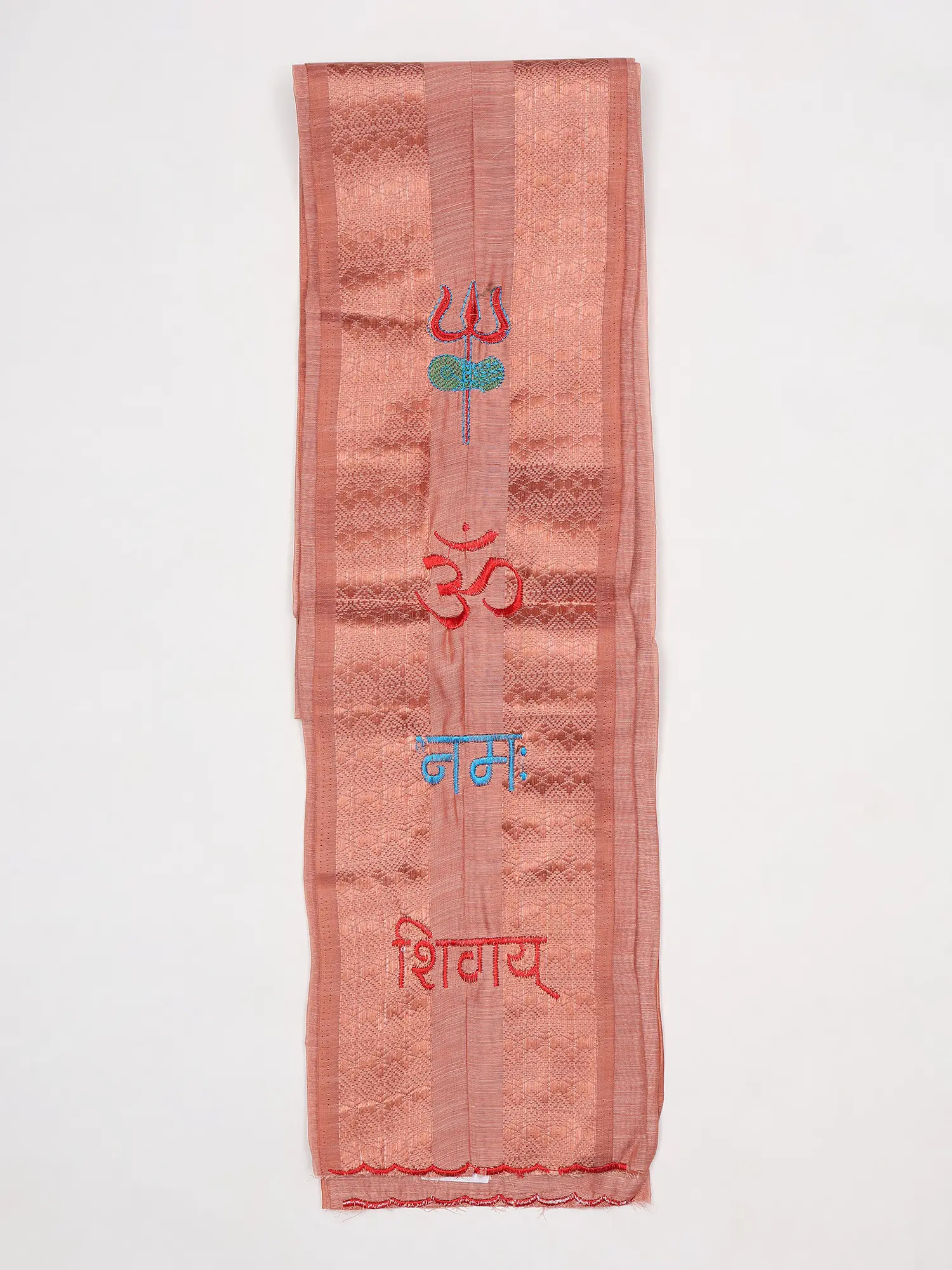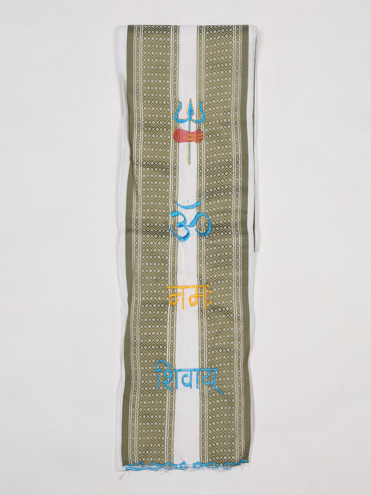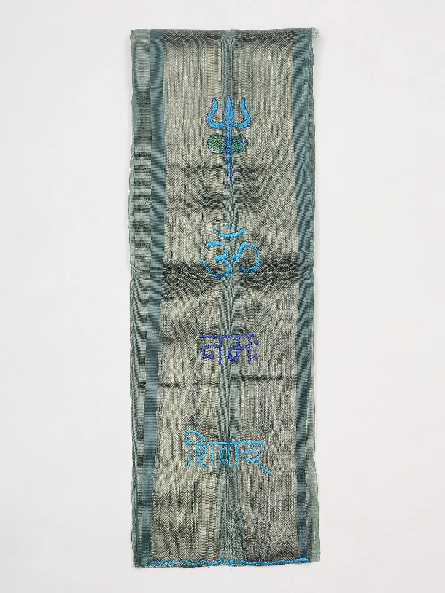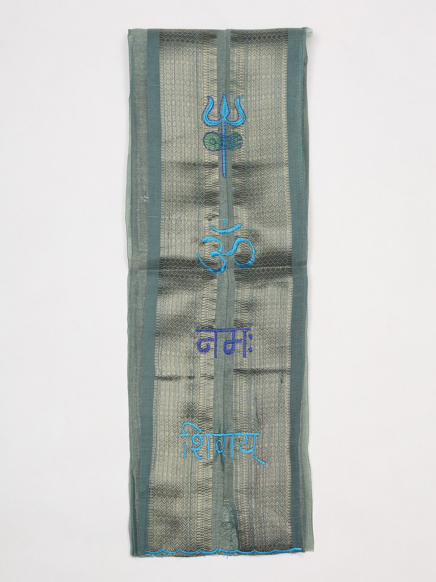 Adorning each scarf are the sacred symbols of Om, the Trishul, and the mantra "Om Namah Shivay," rendered in vibrant, contrasting threads. These elements are precisely embroidered, creating a visually captivating effect that draws the eye and soothes the soul. The generous length of 80 inches combined with a width of 7.2 inches ensures a versatile and graceful presence, whether draped or displayed.