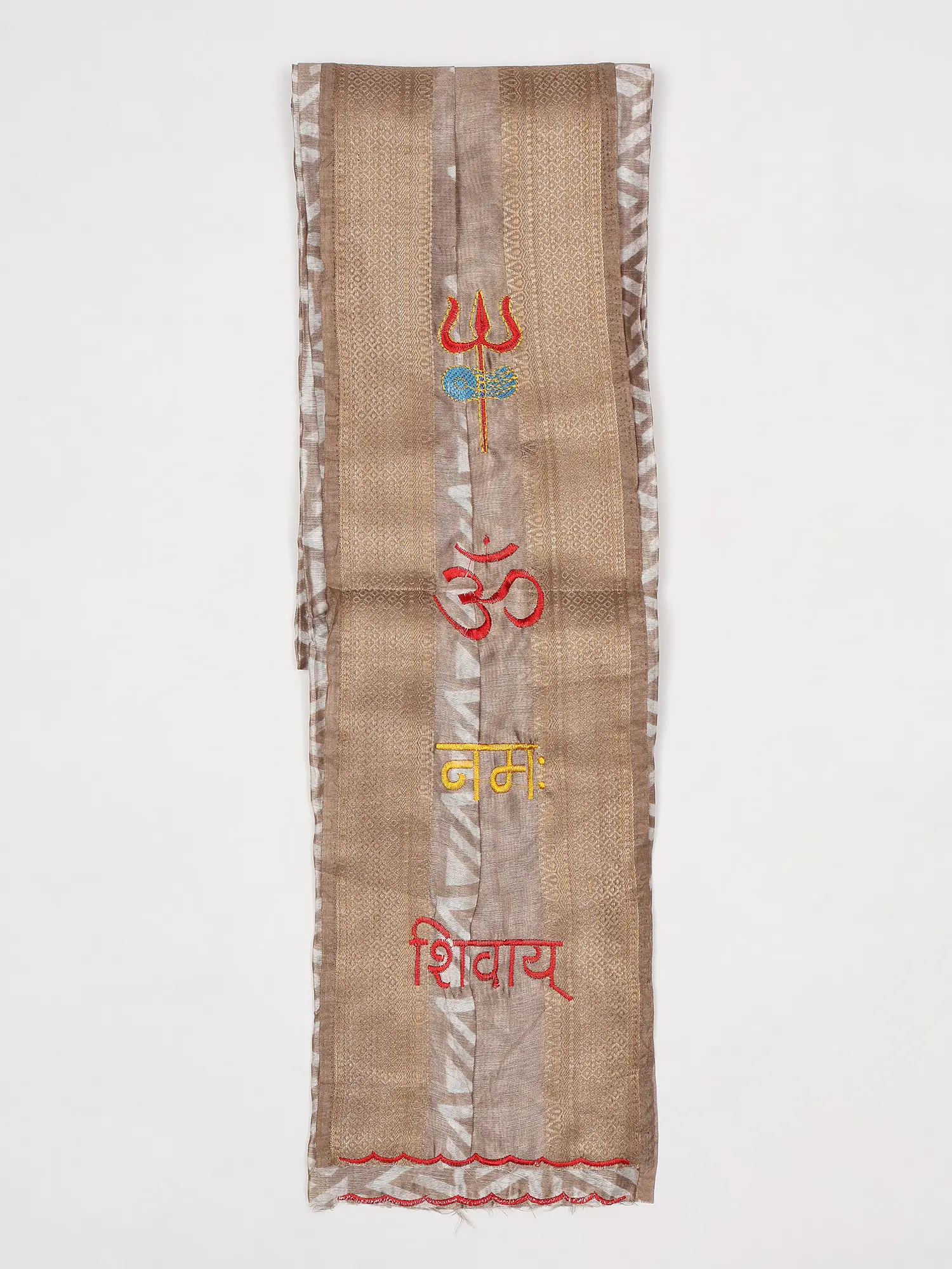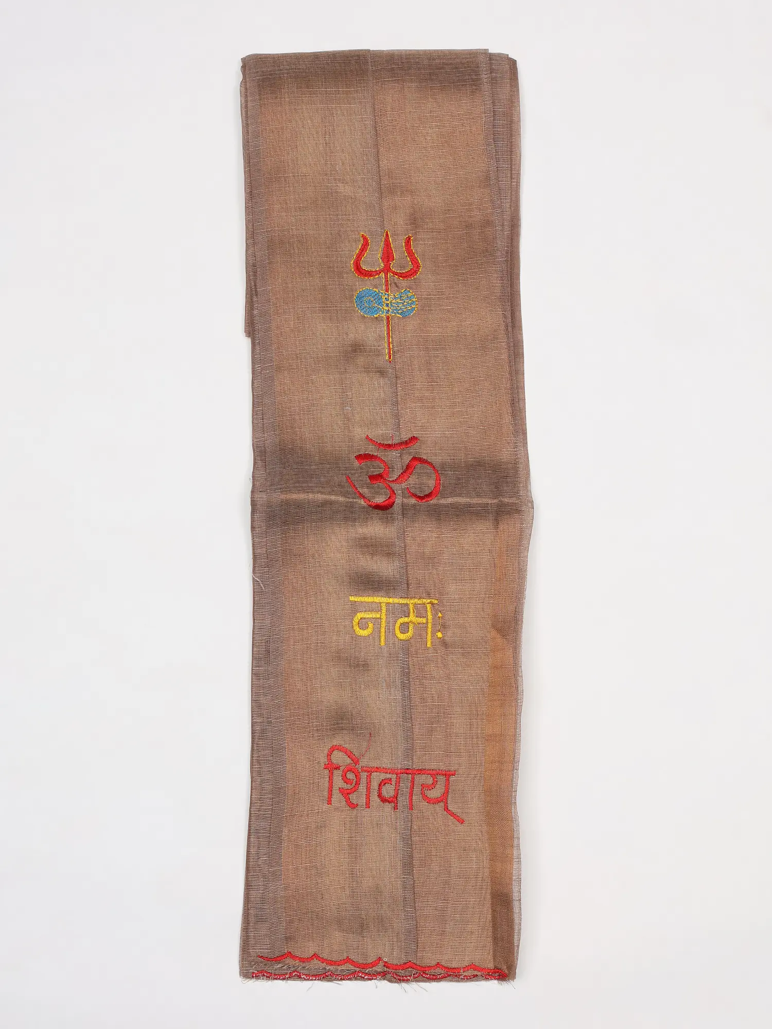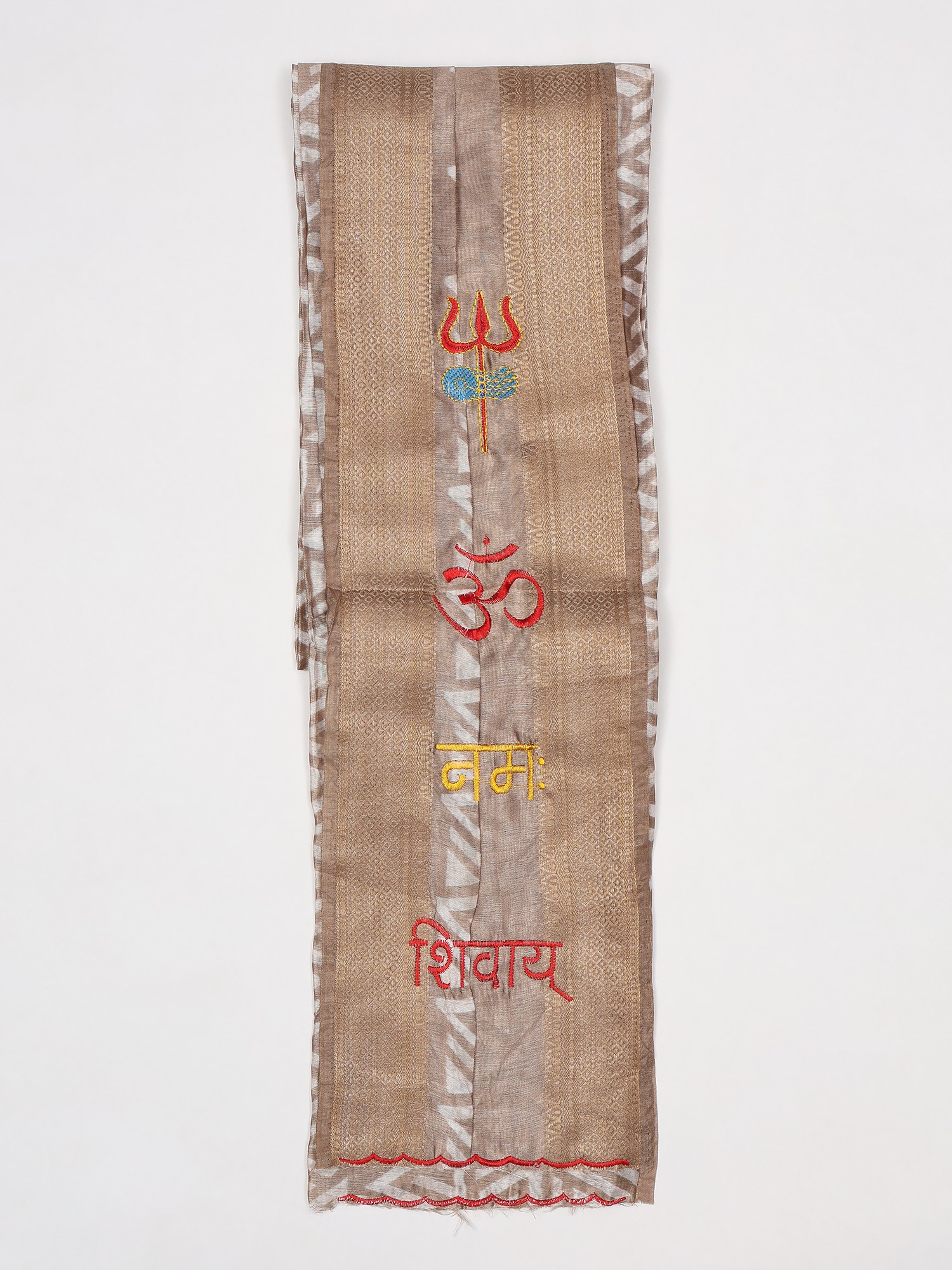 Crafted from luxurious art silk, each piece embodies the dedication of skilled artisans. The fabric's subtle sheen and delicate drape create a truly opulent feel. Intricate embroidery, featuring the sacred "Om Namah Shivay" mantra and the powerful Trishul symbol, is meticulously applied with expert precision, showcasing unparalleled attention to detail.