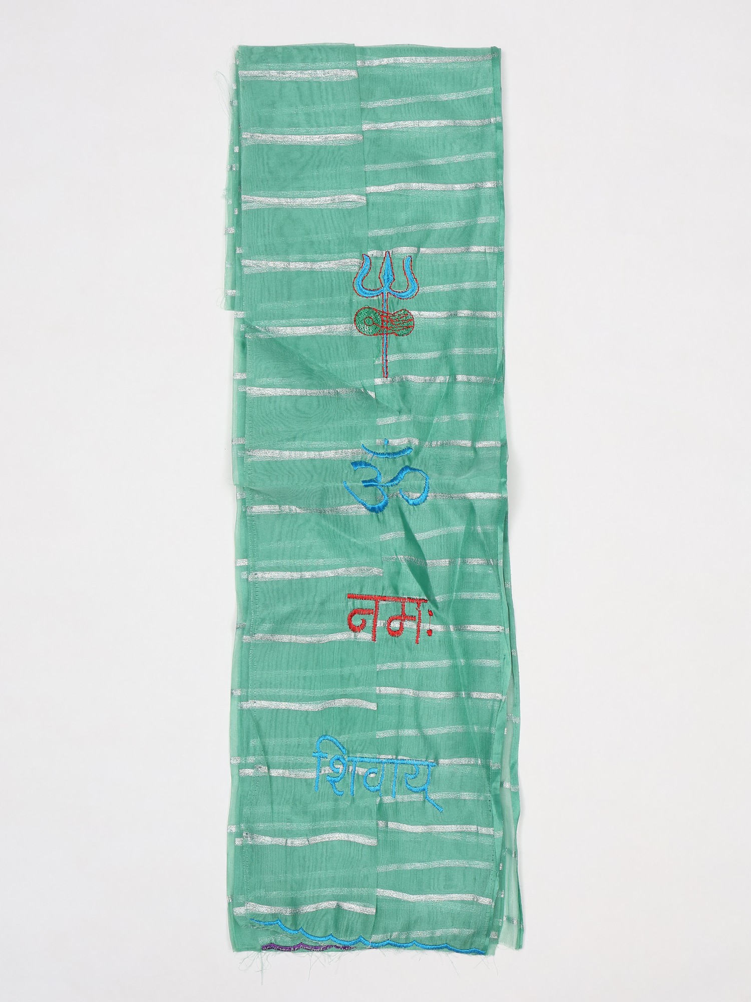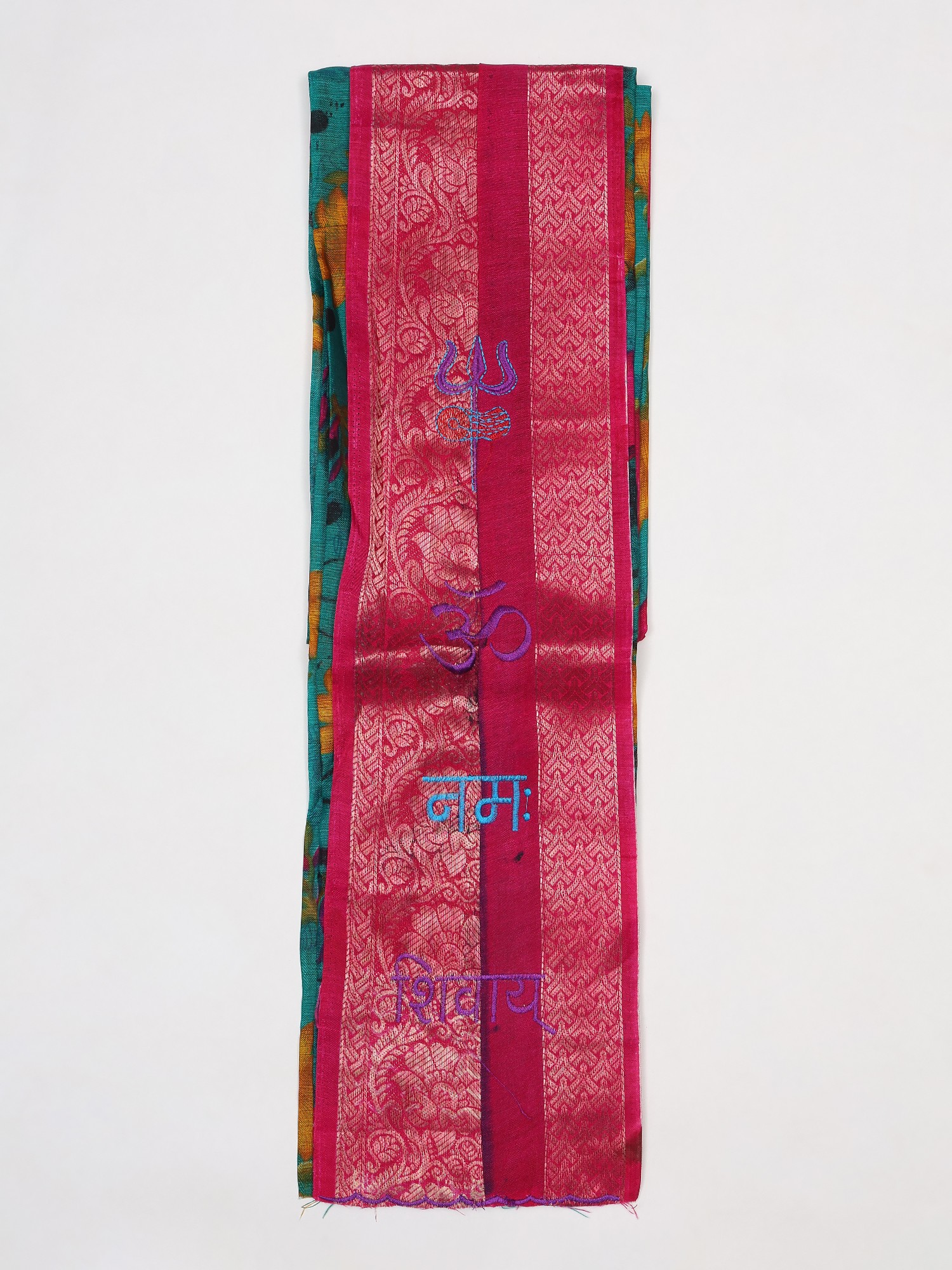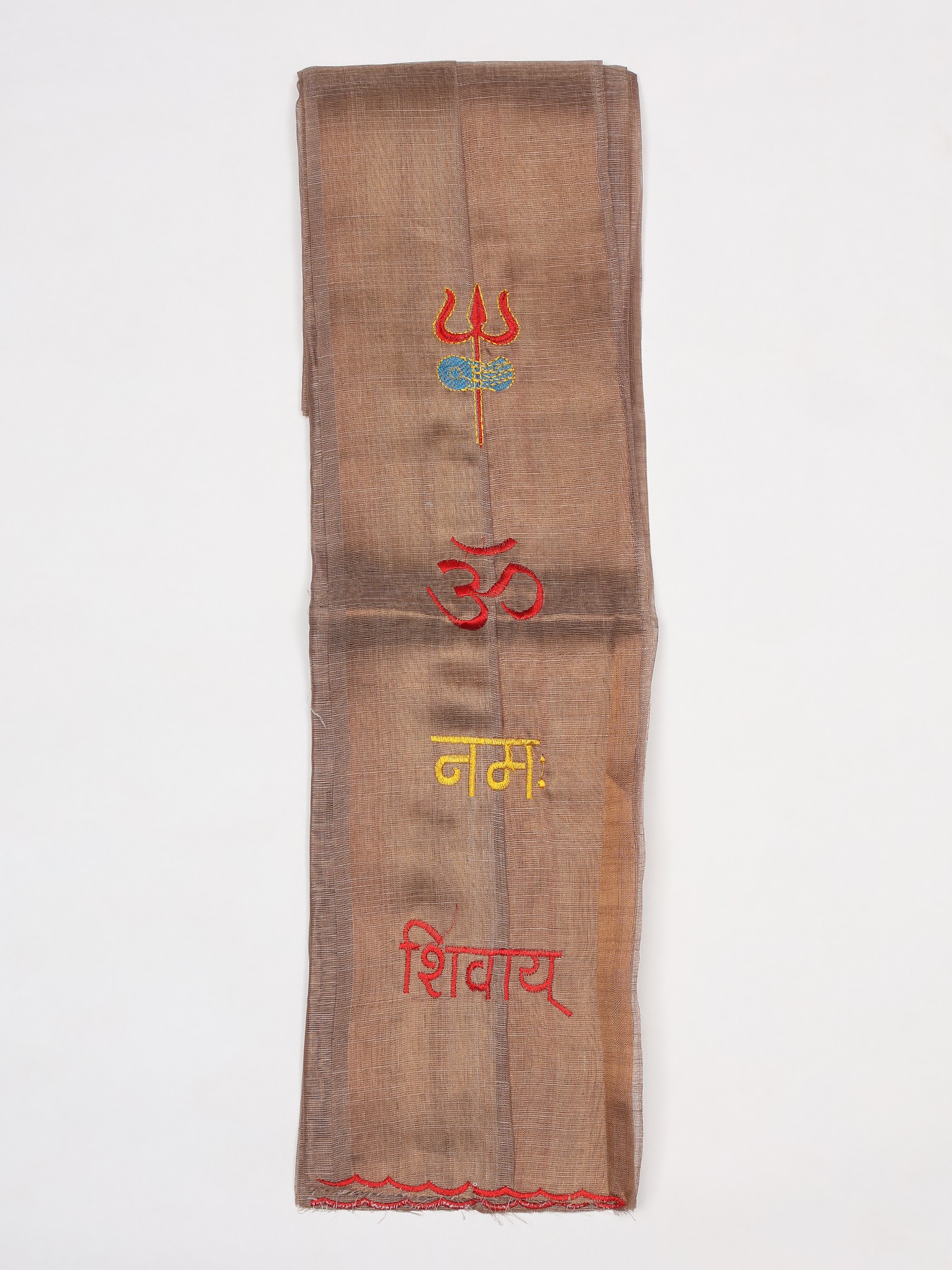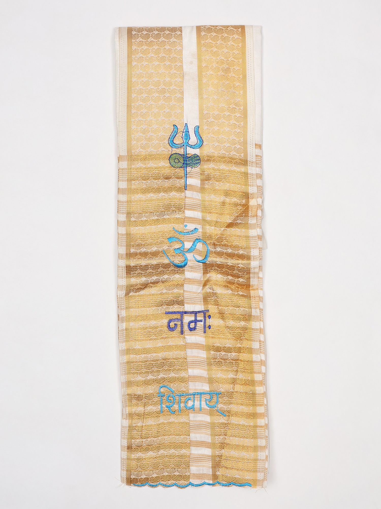 Crafted from luxurious art silk, each piece embodies the dedication of skilled artisans. The fabric's subtle sheen and delicate drape create a truly opulent feel. Intricate embroidery, featuring the sacred "Om Namah Shivay" mantra and the powerful Trishul symbol, is meticulously applied with expert precision, showcasing unparalleled attention to detail.