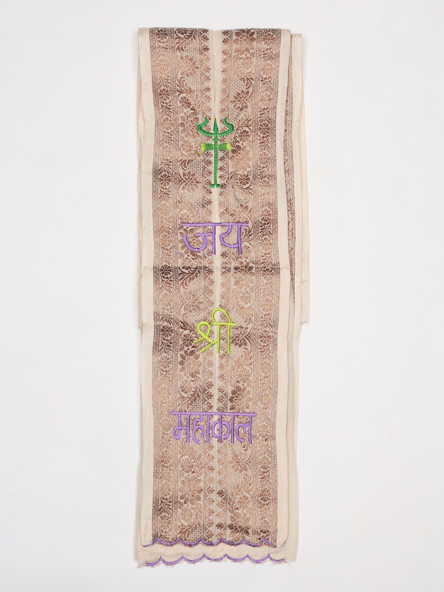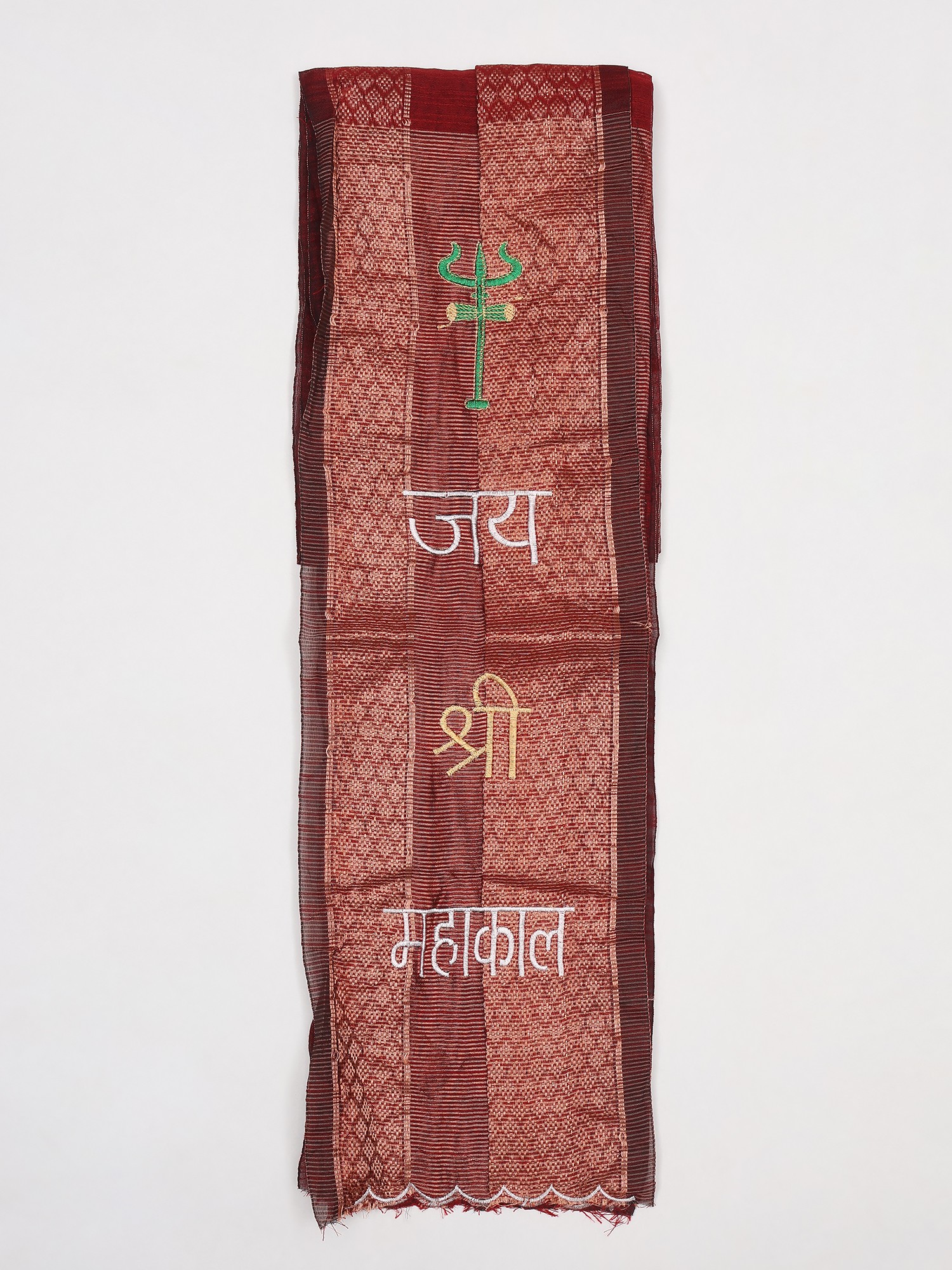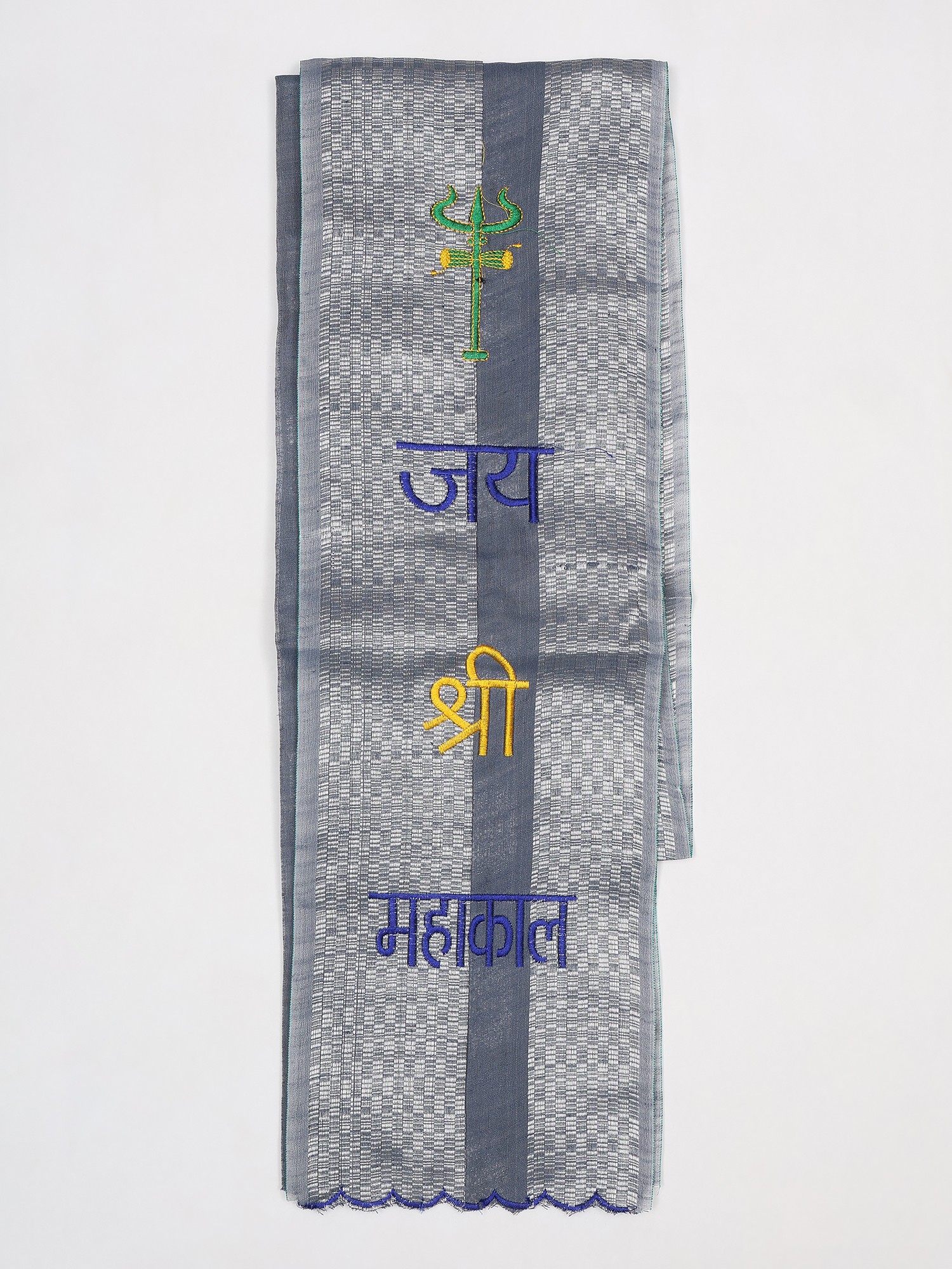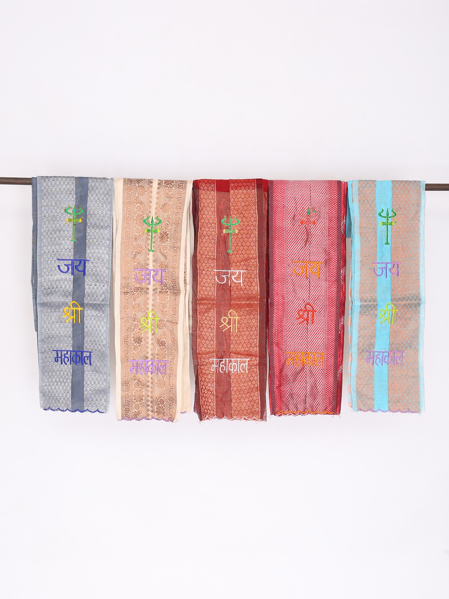 Each of these five devotional wraps has been meticulously crafted from premium art silk, chosen for its luxurious feel and elegant drape. The fine threads are skillfully embroidered, forming sacred symbols and script with remarkable precision. This dedication to artisanal quality ensures that each piece is not merely an accessory but a testament to skilled craftsmanship and spiritual intent.