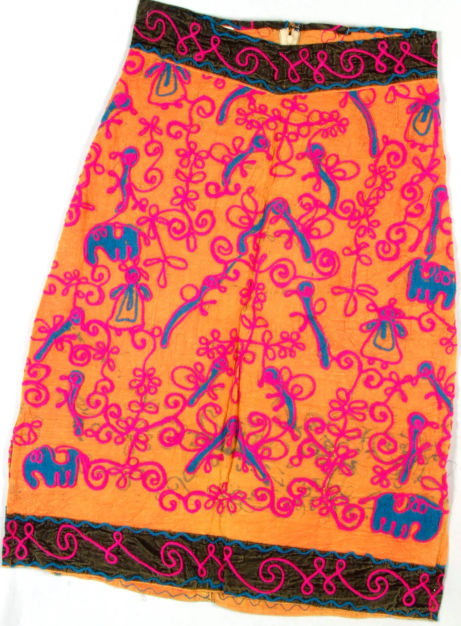 Discover the artistry of traditional Indian craftsmanship with this captivating set of three Gujarati skirts. Each skirt is a unique canvas, showcasing the rich heritage of hand embroidery, making them a truly special addition to any wardrobe. Crafted from pure cotton, these skirts promise not only exceptional comfort but also breathability, perfect for warmer days or layering for a cozy, bohemian look. The vibrant and intricate embroidery is the heart of these pieces. You'll find a delightful interplay of colors and patterns, with each skirt offering its own distinct design. One skirt features a refreshing lime green base, adorned with striking black panels embellished with bold red embroidery. Swirls and curves come to life, creating a dynamic visual appeal. Another skirt bursts with an energetic orange hue, complemented by dark panels featuring delicate pink embroidery. The contrast in colors and the fluid, organic lines of the stitching evoke a sense of joyful movement and artistic expression. The third skirt presents a more subdued yet equally captivating palette of deep maroon and slate grey, interwoven with threads of shimmering gold and subtle metallic accents, adding a touch of understated glamour. ––––––––––––––––––––