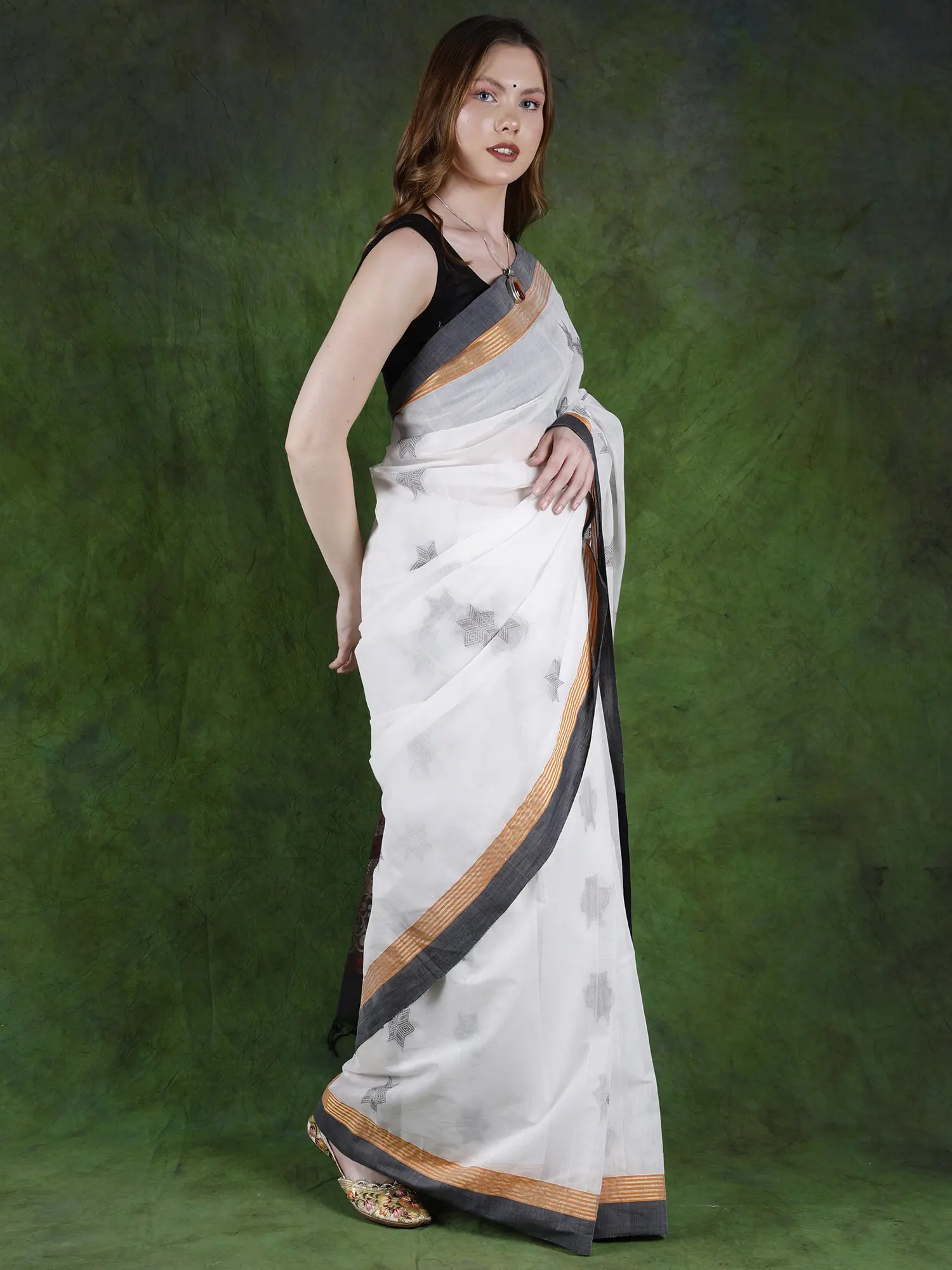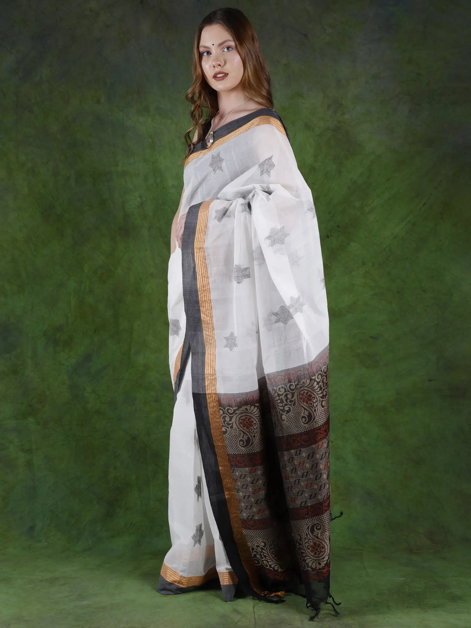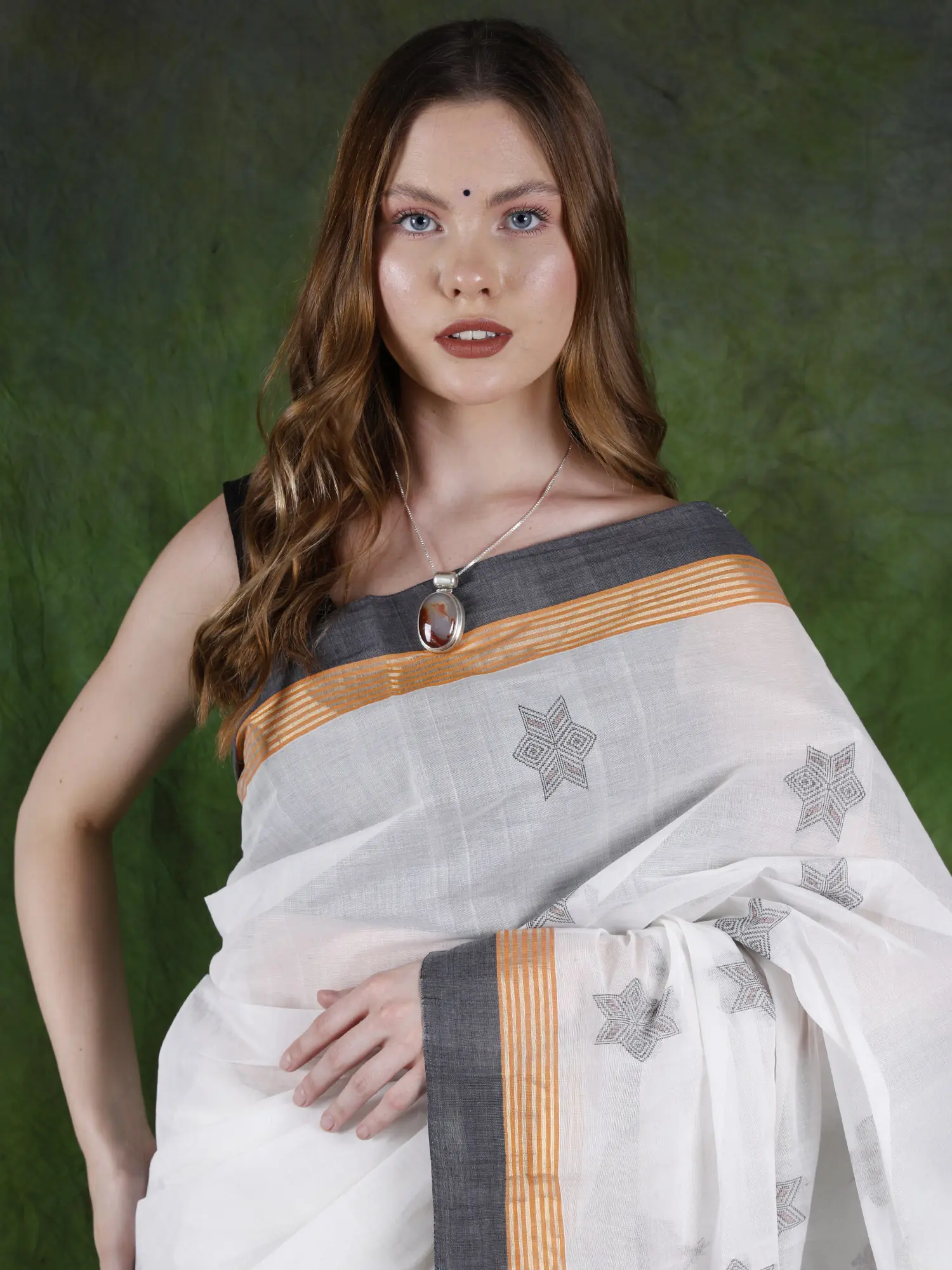 The body of the saree is adorned with star shapes, and a striped border, bringing a simple charm to the drape. The pallu in contrast features an elaborate spread of exquisite paisley or aamra motif with floral elements and geometrical shapes adding a touch of richness to the nonchalance of pure cotton.