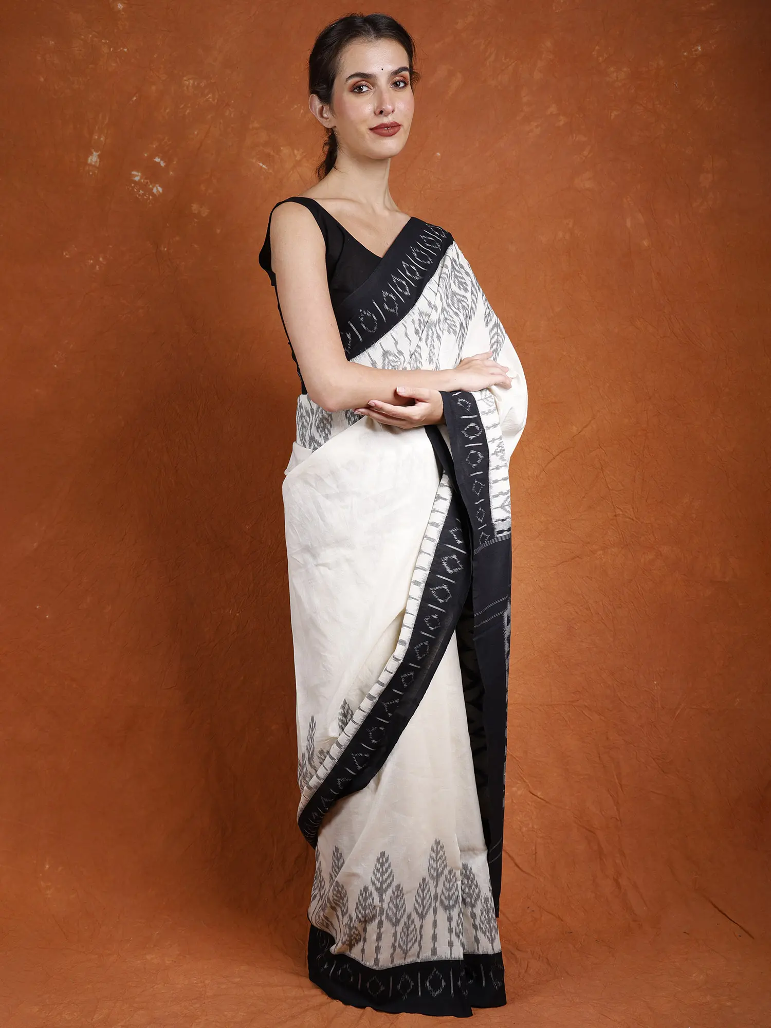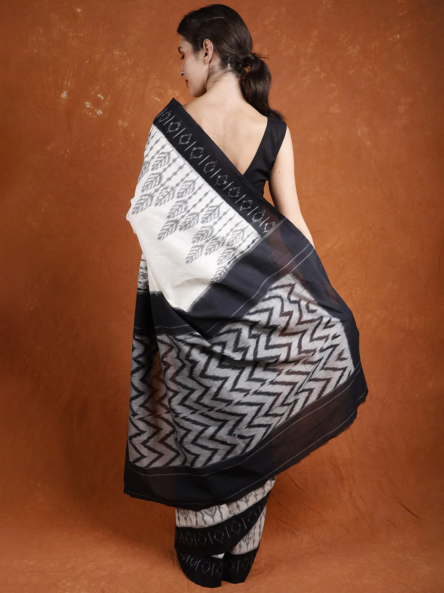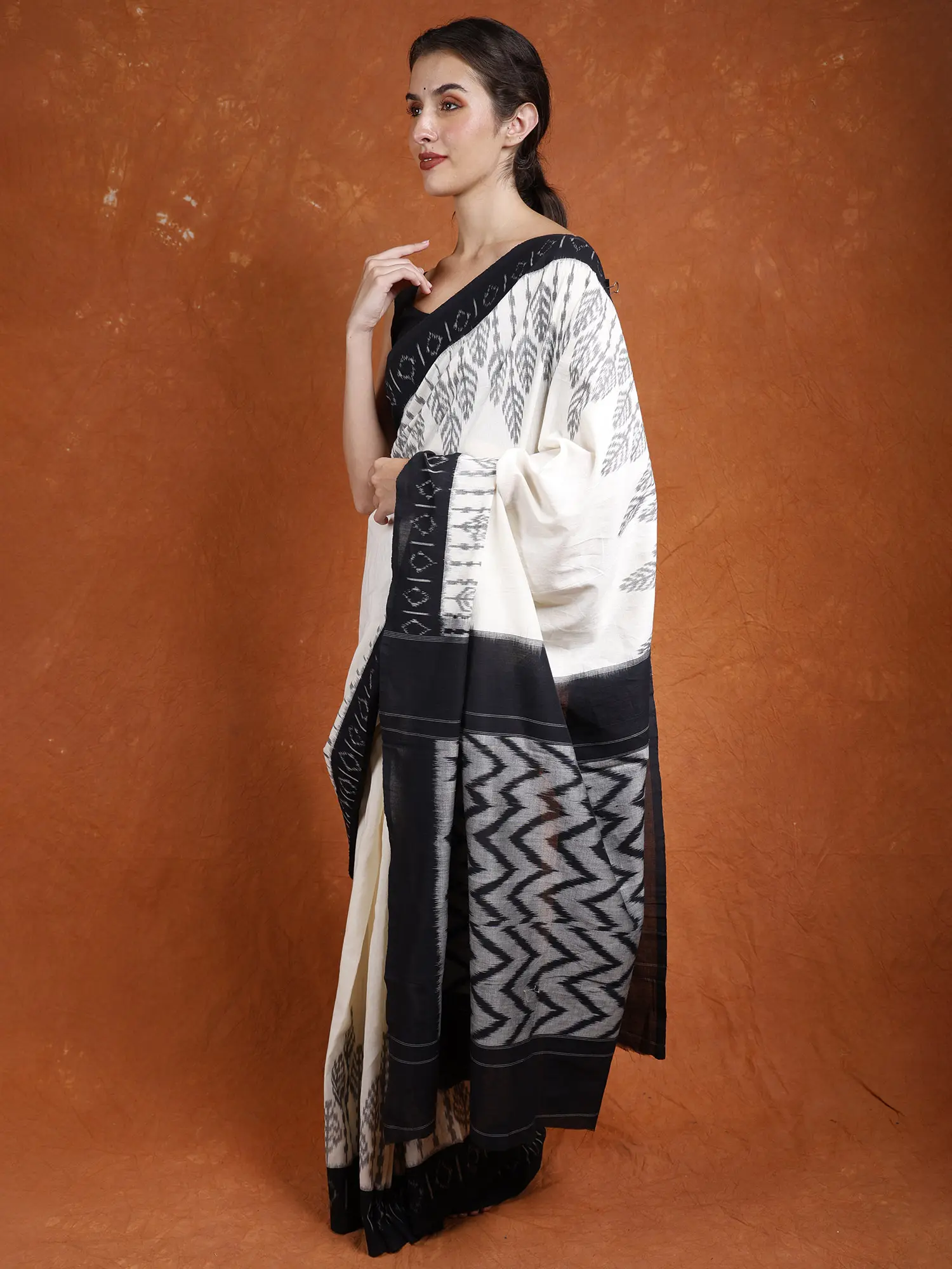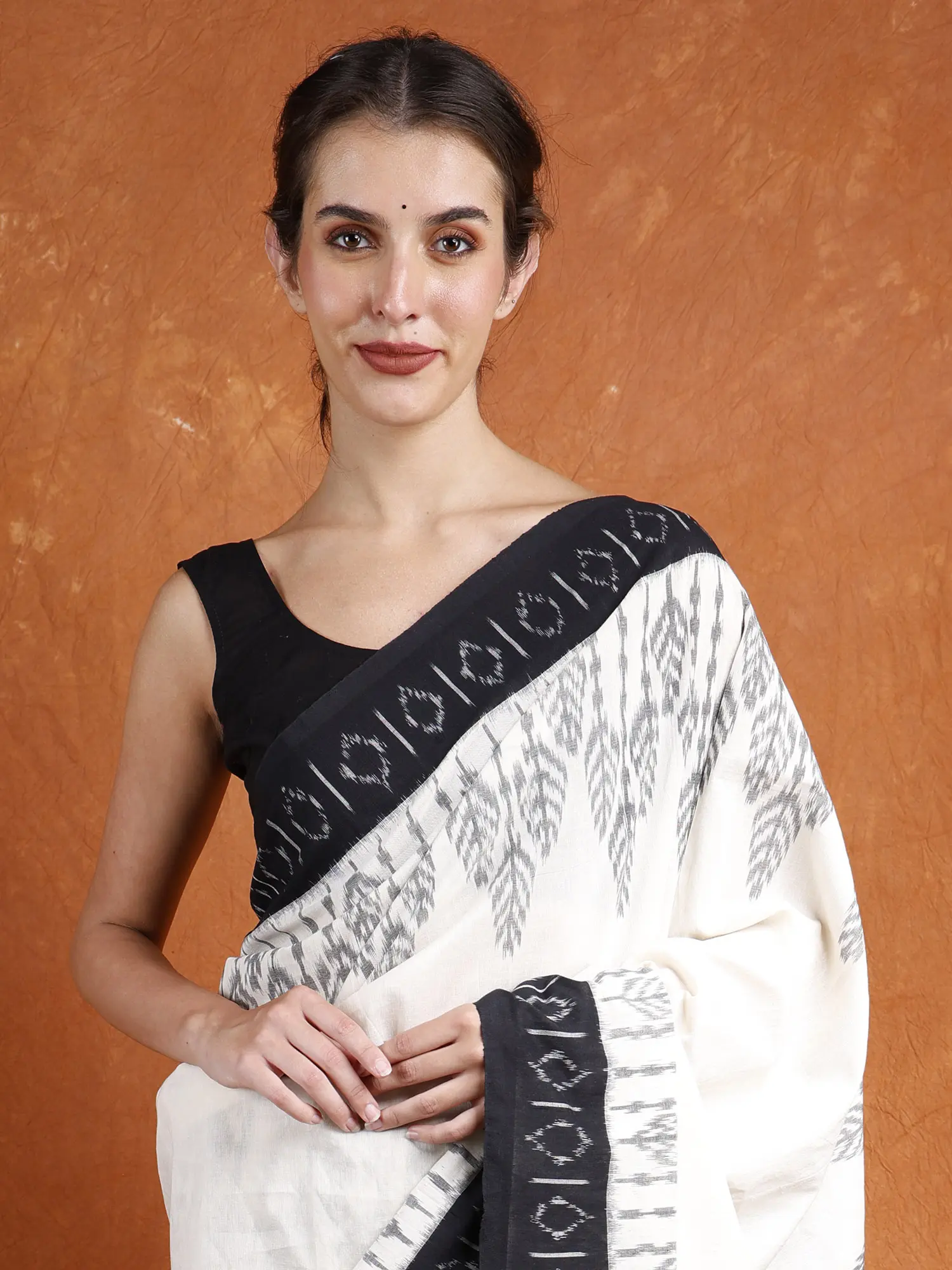 This Lucnet-White and Black Ikat Woven Pure Cotton Saree from Puchampally epitomizes professionalism with its sophisticated design and craftsmanship. The classic combination of white and black lends a timeless elegance, while the intricate Ikat weave adds a touch of texture and depth. The pure cotton fabric ensures comfort and breathability, making it ideal for long hours at work.