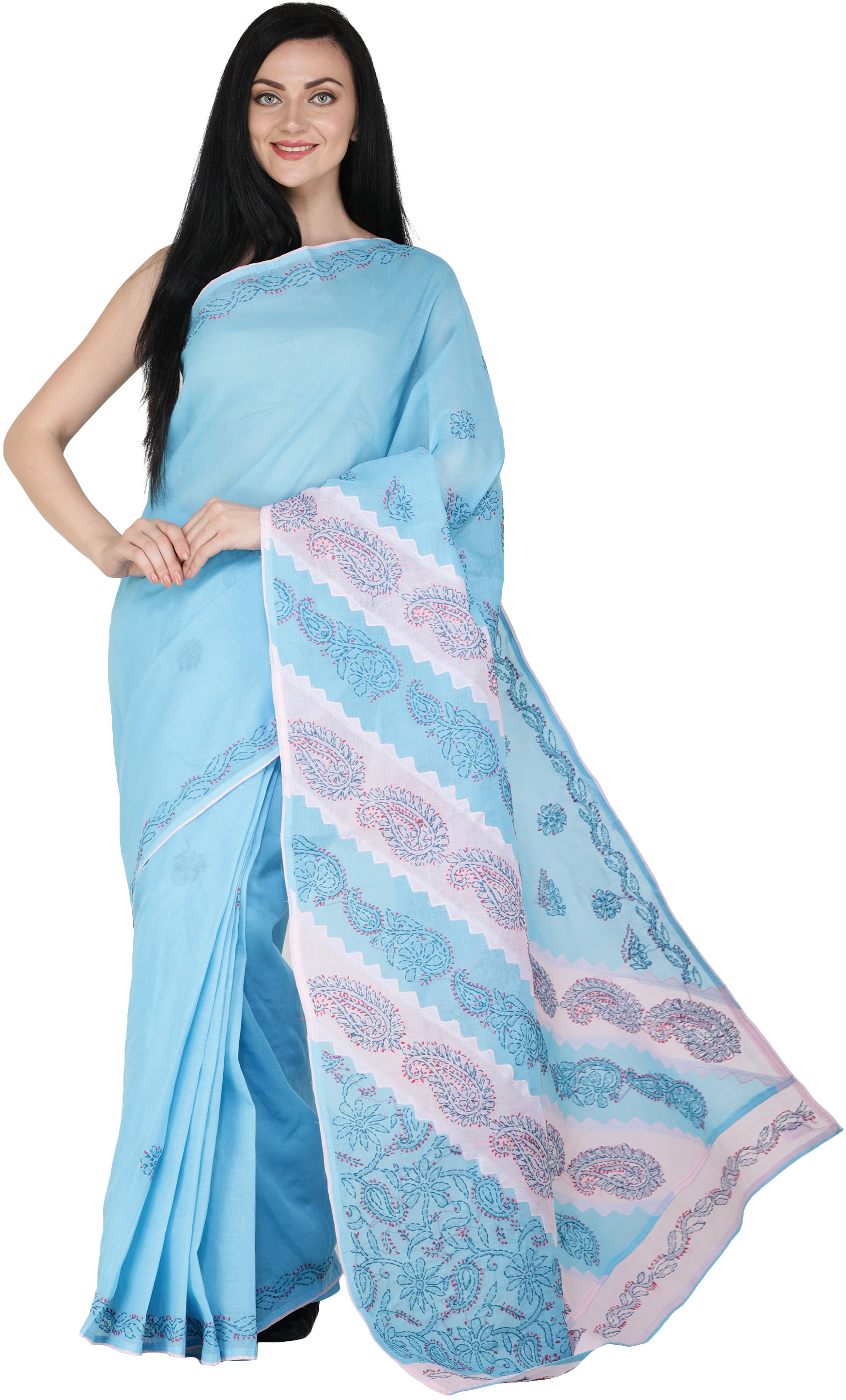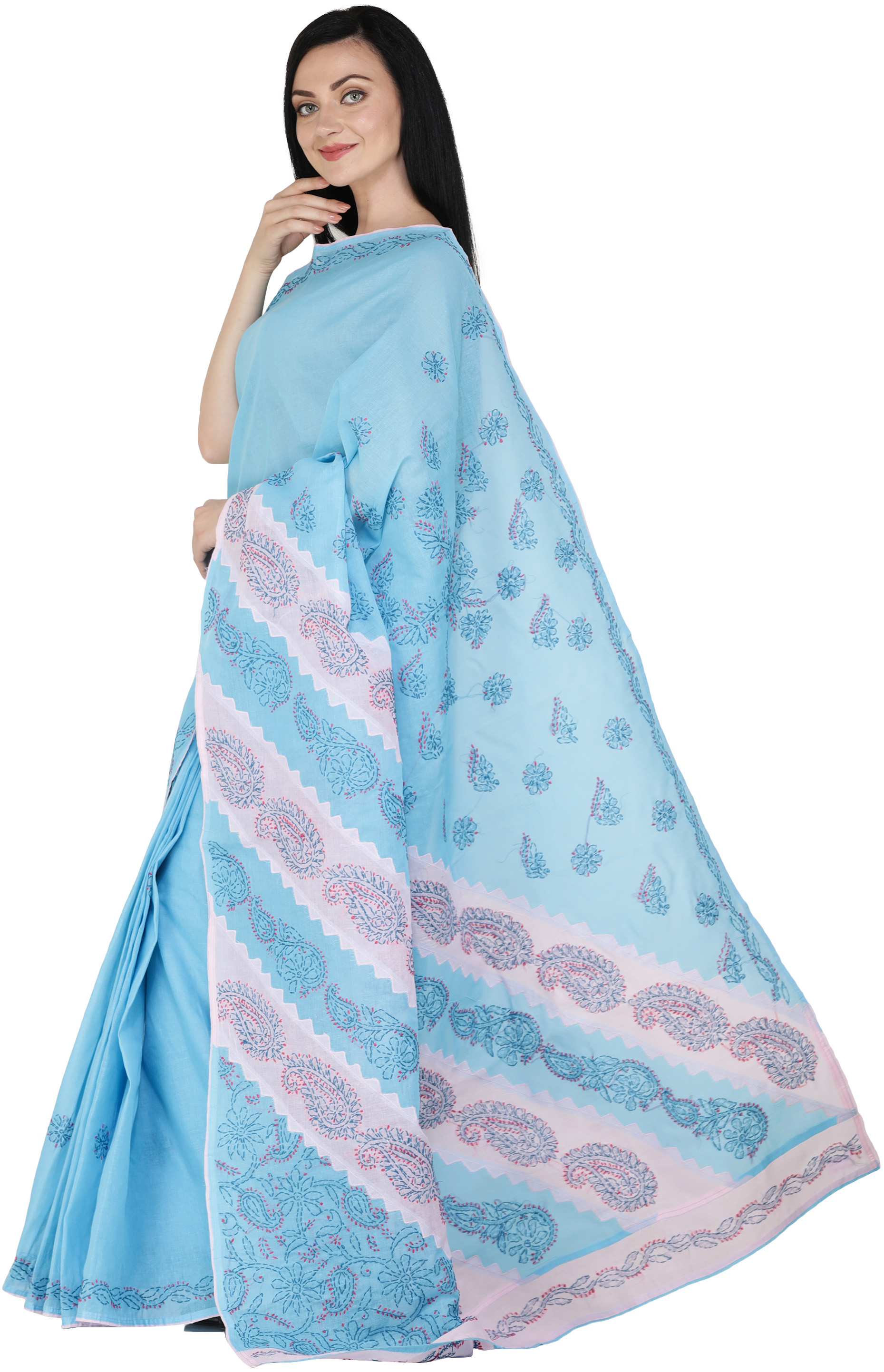 Lukhnavi Chikan Sari with Hand-Embroidered Flowers and Paisleys