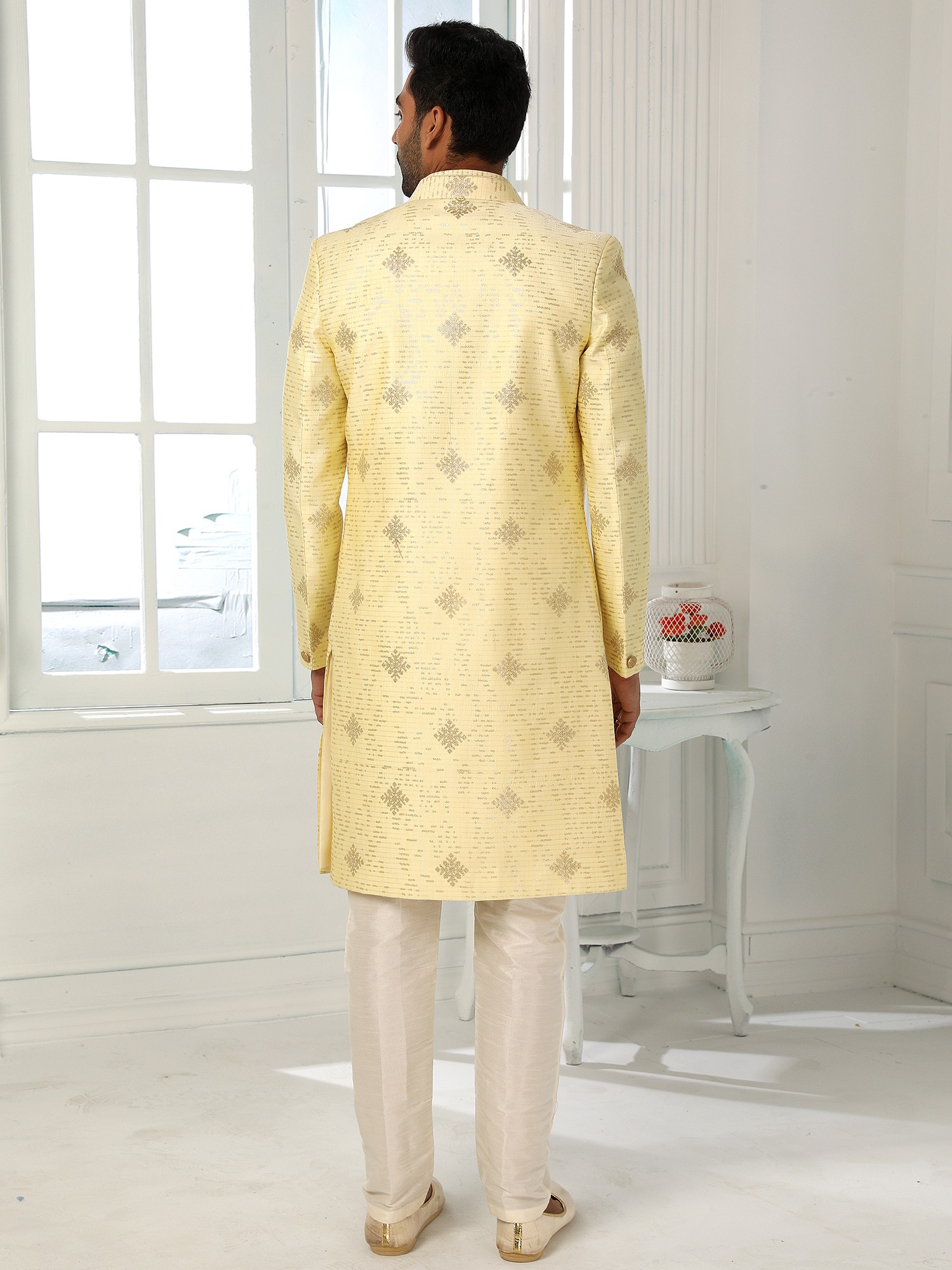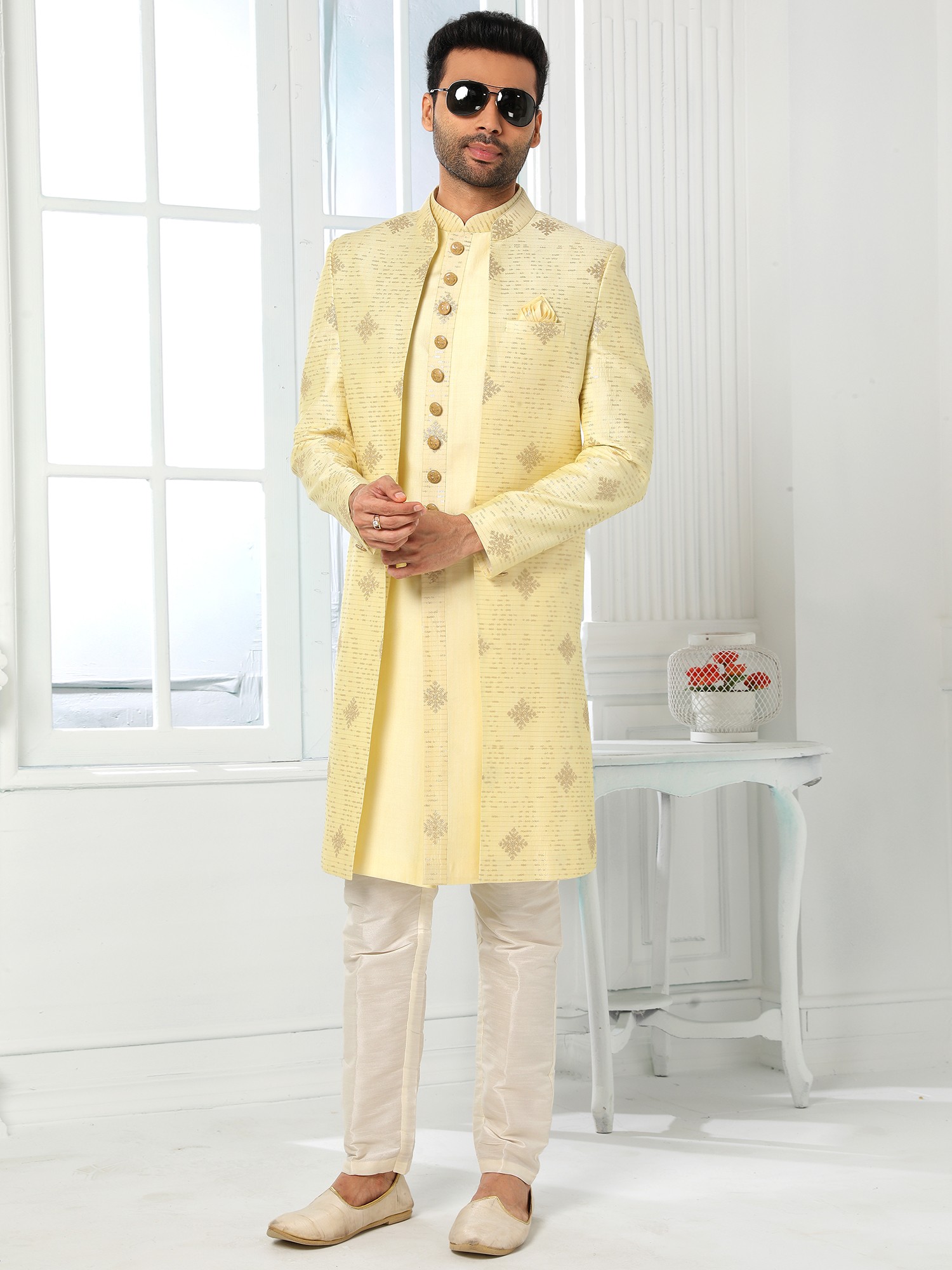 Art Silk Shimmer Sequins Three Piece Indo Jacket Set With Aligarhi Pant Crafts A Premium Ethnic Ensemble For Groom