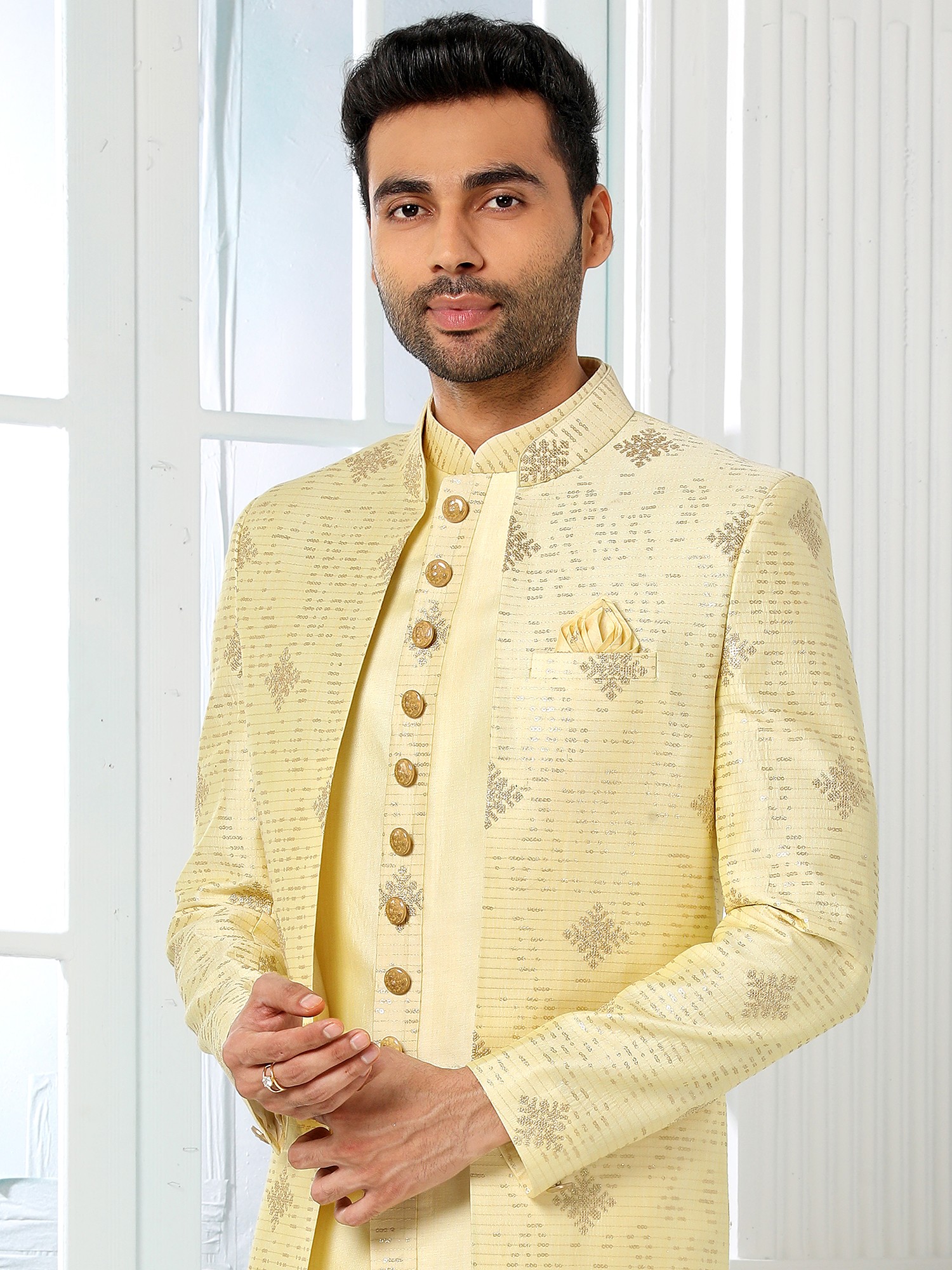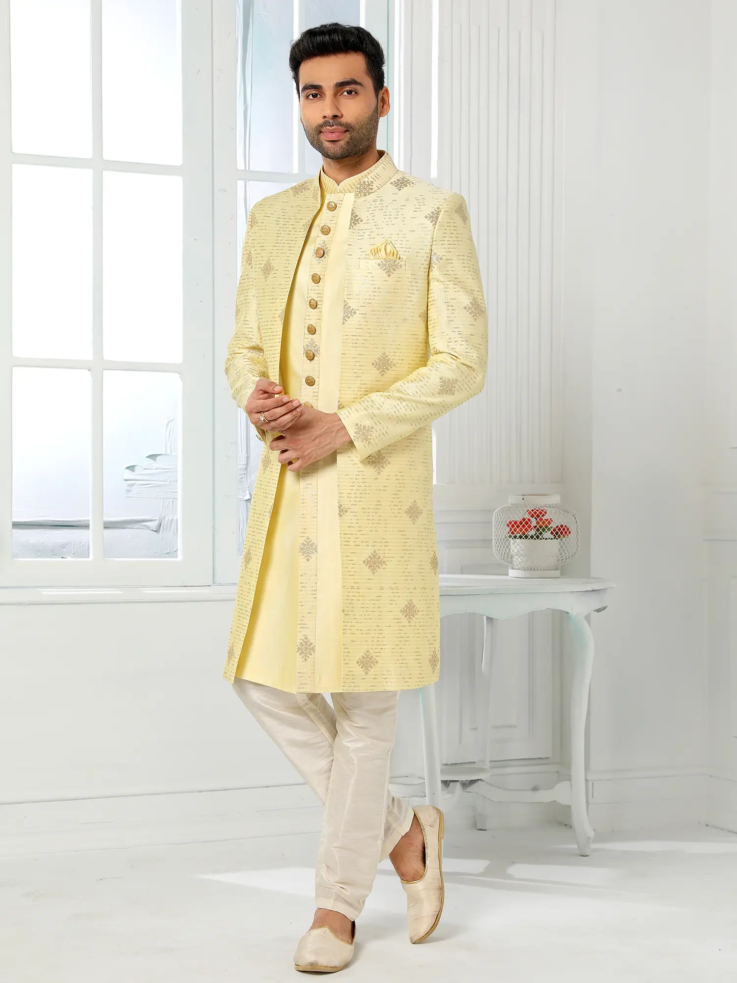 Elegant Art Silk Brocade Three Piece Indo Jacket Set With Aligarhi Pant Dazzles Grooms With Timeless Wedding Luxury