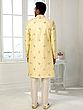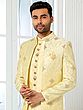 Luxurious Printed Thread Work Art Silk Indo Jacket Set With Aligarhi Pant For Wedding Groom Wear
