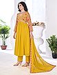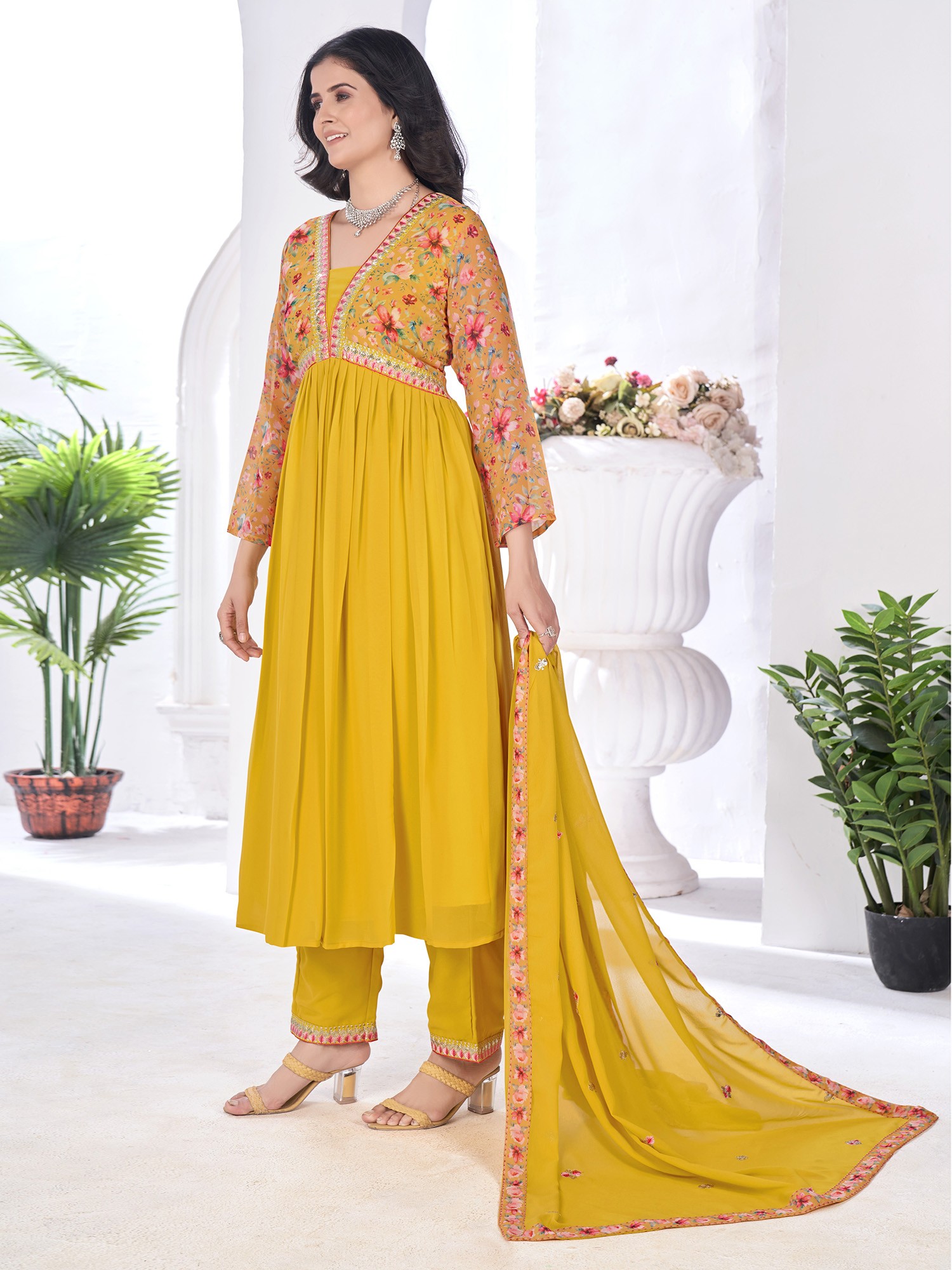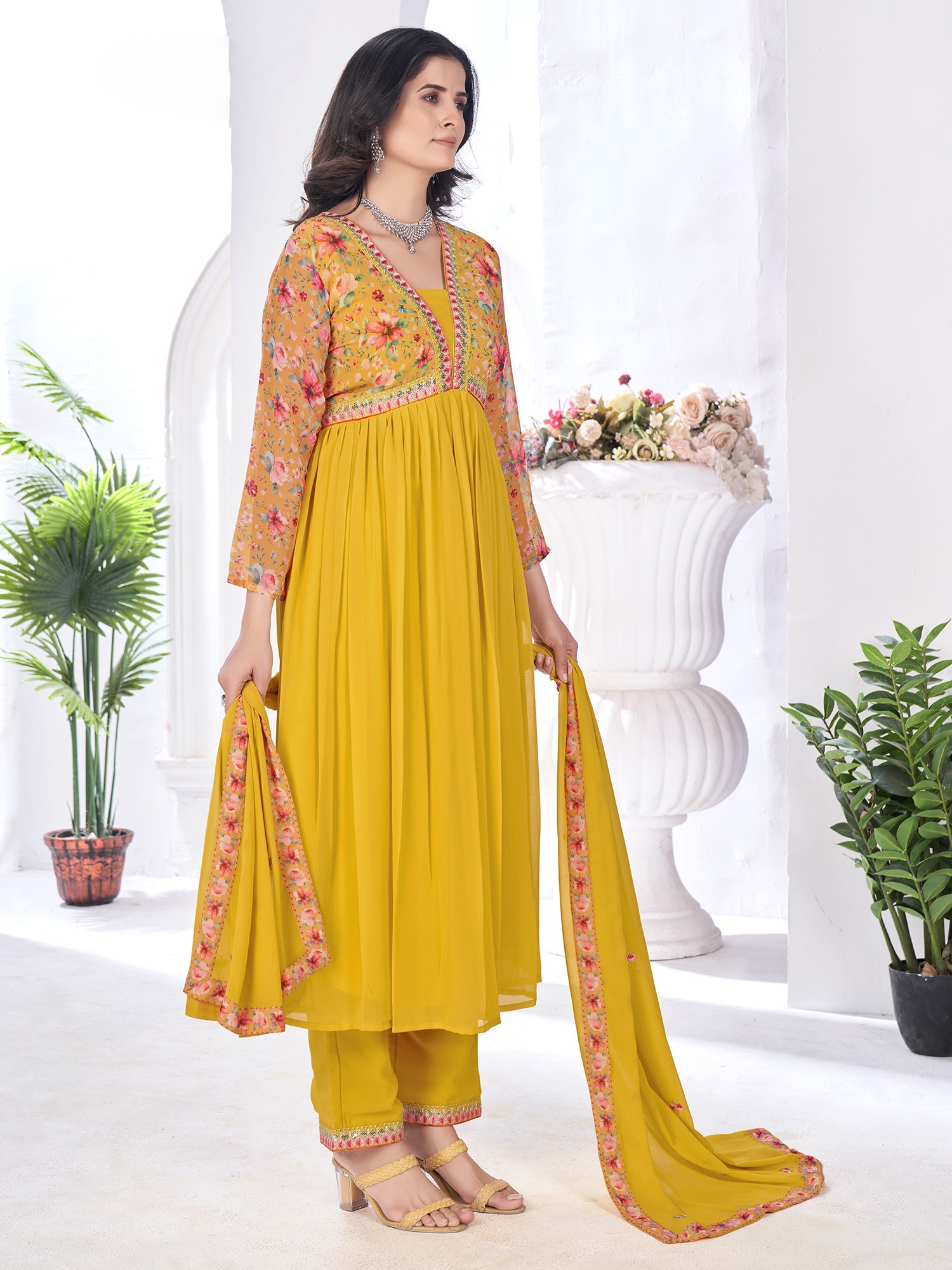 Step into a world of elegance and festive cheer with this exquisite Anarkali suit. Crafted from luxurious blooming georgette, this ensemble is designed to make you shine at any party or celebratory occasion. The vibrant hue of the georgette fabric creates a captivating visual appeal, reminiscent of a sun-drenched meadow in full bloom. Its graceful drape and lightweight feel ensure comfort without compromising on style, allowing you to move with effortless grace throughout your event.