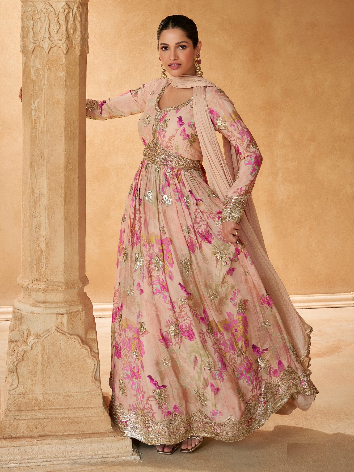 Vivid Auburn Airtex Chinon Heavy Digital Printed Fully Flared Anarkali Style Festival Wear Gown With Dupatta
