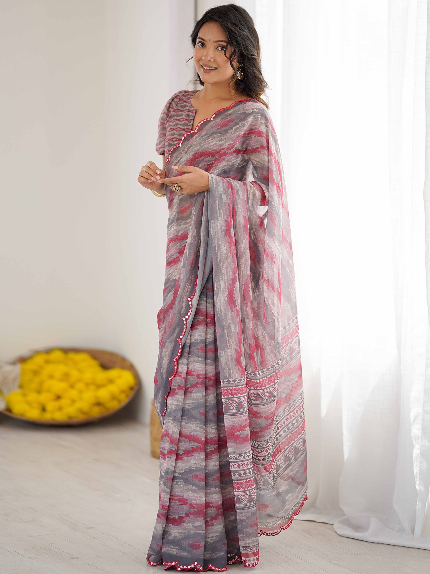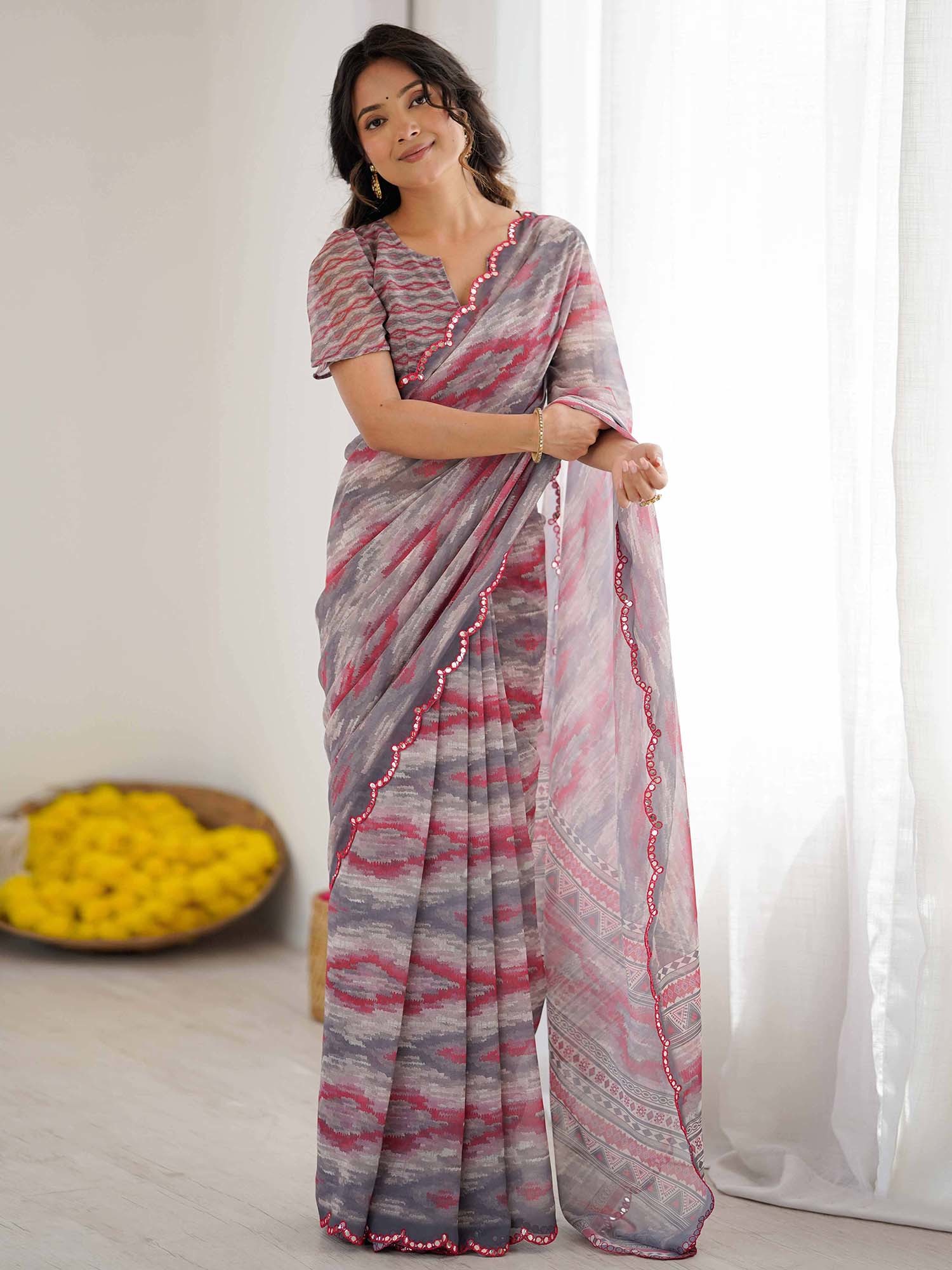 Crafted from the finest georgette, this creation offers an unparalleled drape and a luxurious feel against your skin. Each detail has been meticulously considered, from the delicate printed patterns that weave a story of artistry to the exquisite mirror cut work adorning the borders. The construction speaks of a commitment to quality, ensuring a garment that is as durable as it is beautiful.