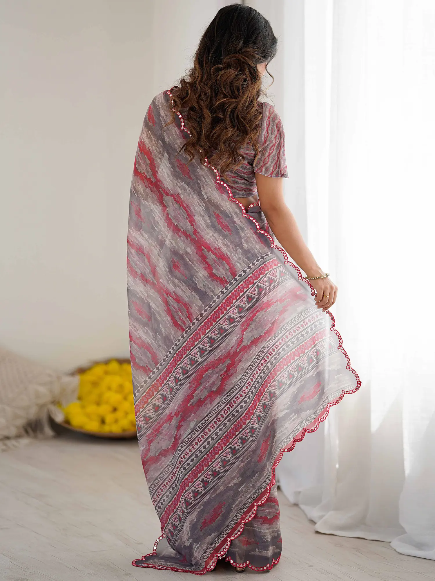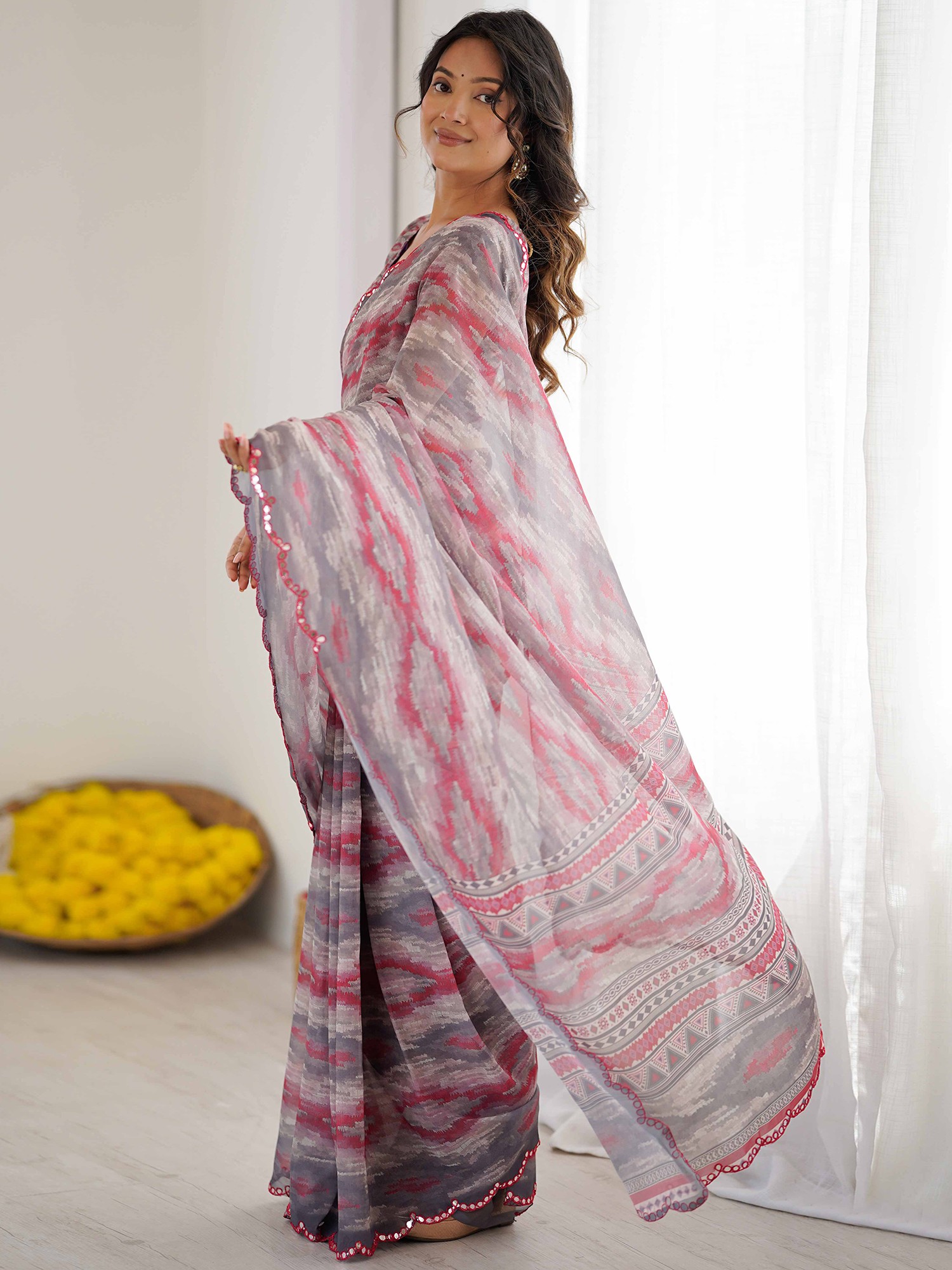 The vibrant prints are rendered with precision on the lightweight georgette fabric, creating a visual tapestry that is both modern and timeless. The scalloped edges, finished with intricate mirror cut work, add a touch of artisanal sparkle and a subtle shimmer that catches the light with every movement. You'll appreciate the thoughtful design, intended to enhance your silhouette and elevate your presence.