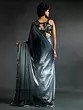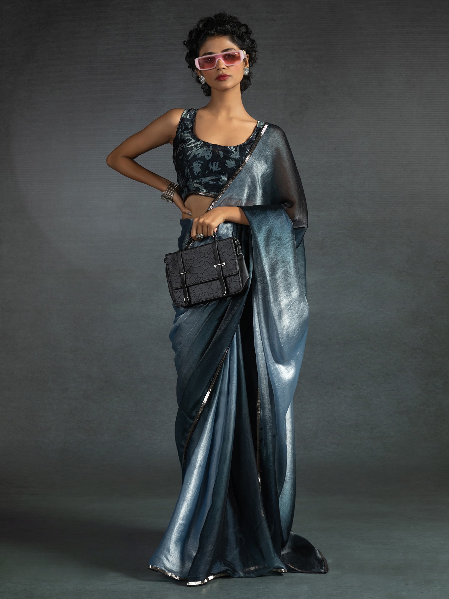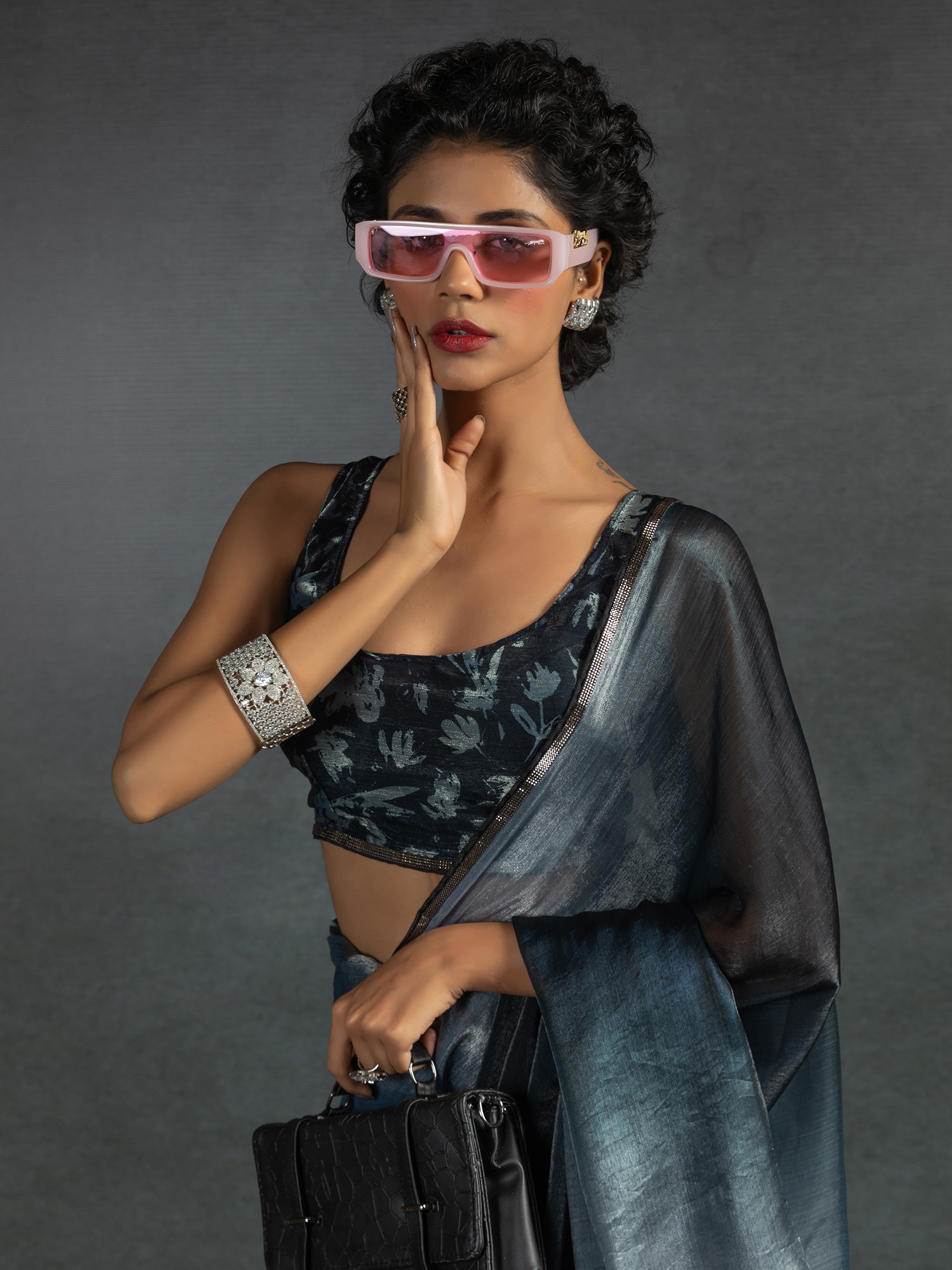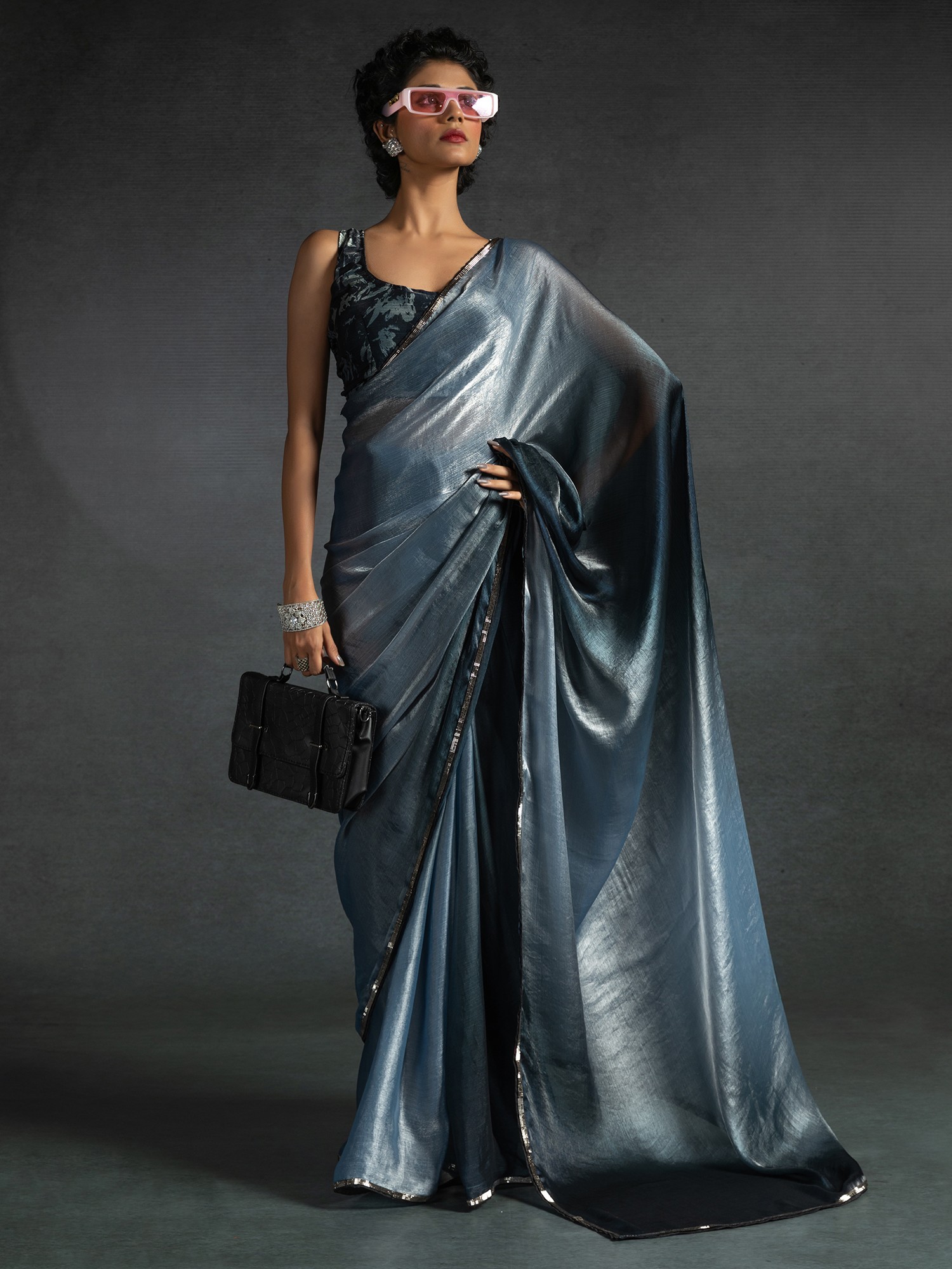 The captivating interplay of light across the fluid satin silk creates a mesmerizing effect, shifting from deepest charcoal to luminous slate blue with every subtle movement. A striking black zircon border introduces a sophisticated sparkle, meticulously hand-applied for enduring brilliance. This is complemented by a thoughtfully designed blouse and underskirt, both tailored to ensure a perfect, flexible fit, adaptable to your unique silhouette.