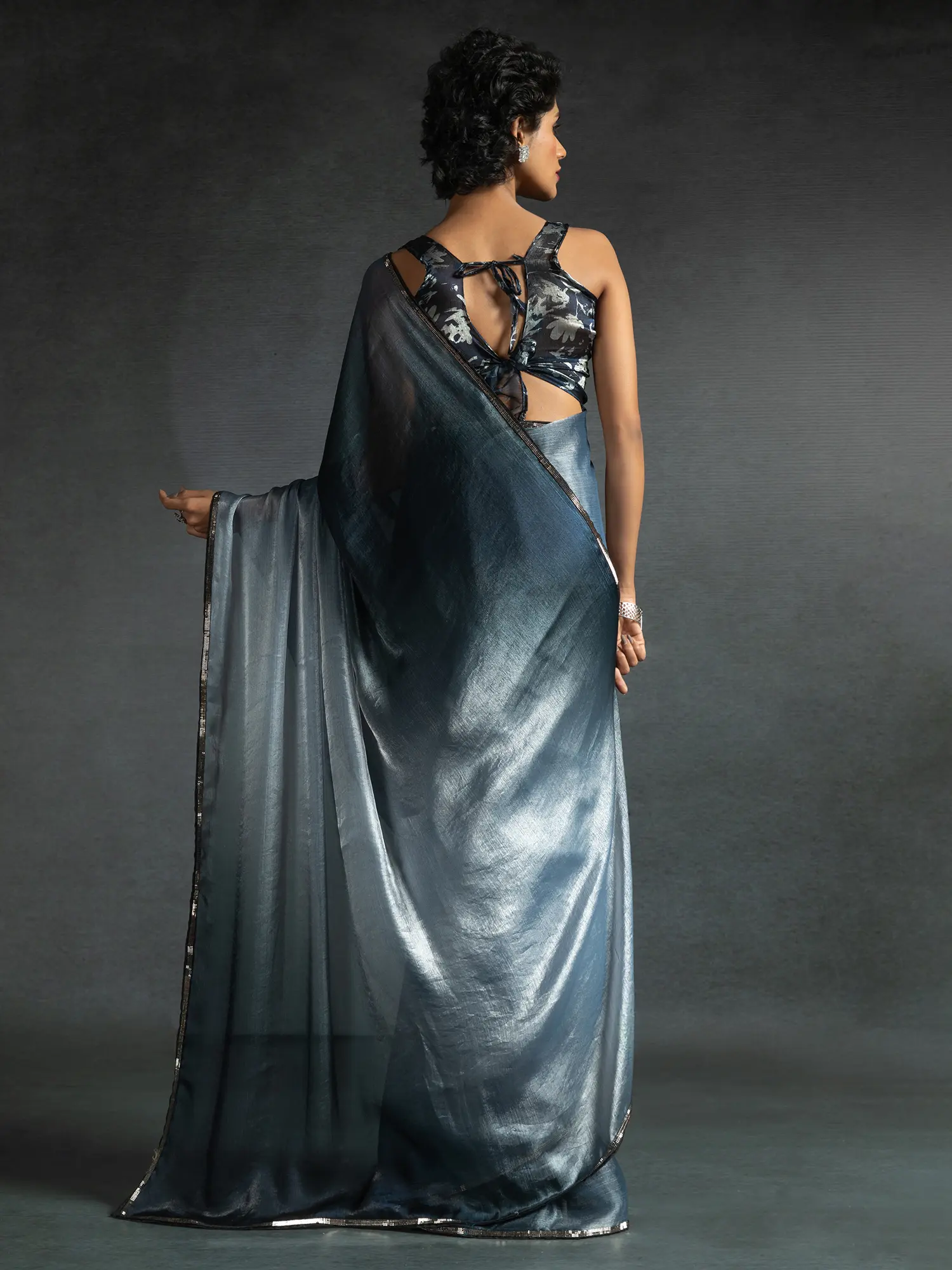 Premium Fendi Satin Silk Two Ton Shaded Saree Adorned With Heavy Hand Work Black Zircon Border Flexible Multiple Hooks