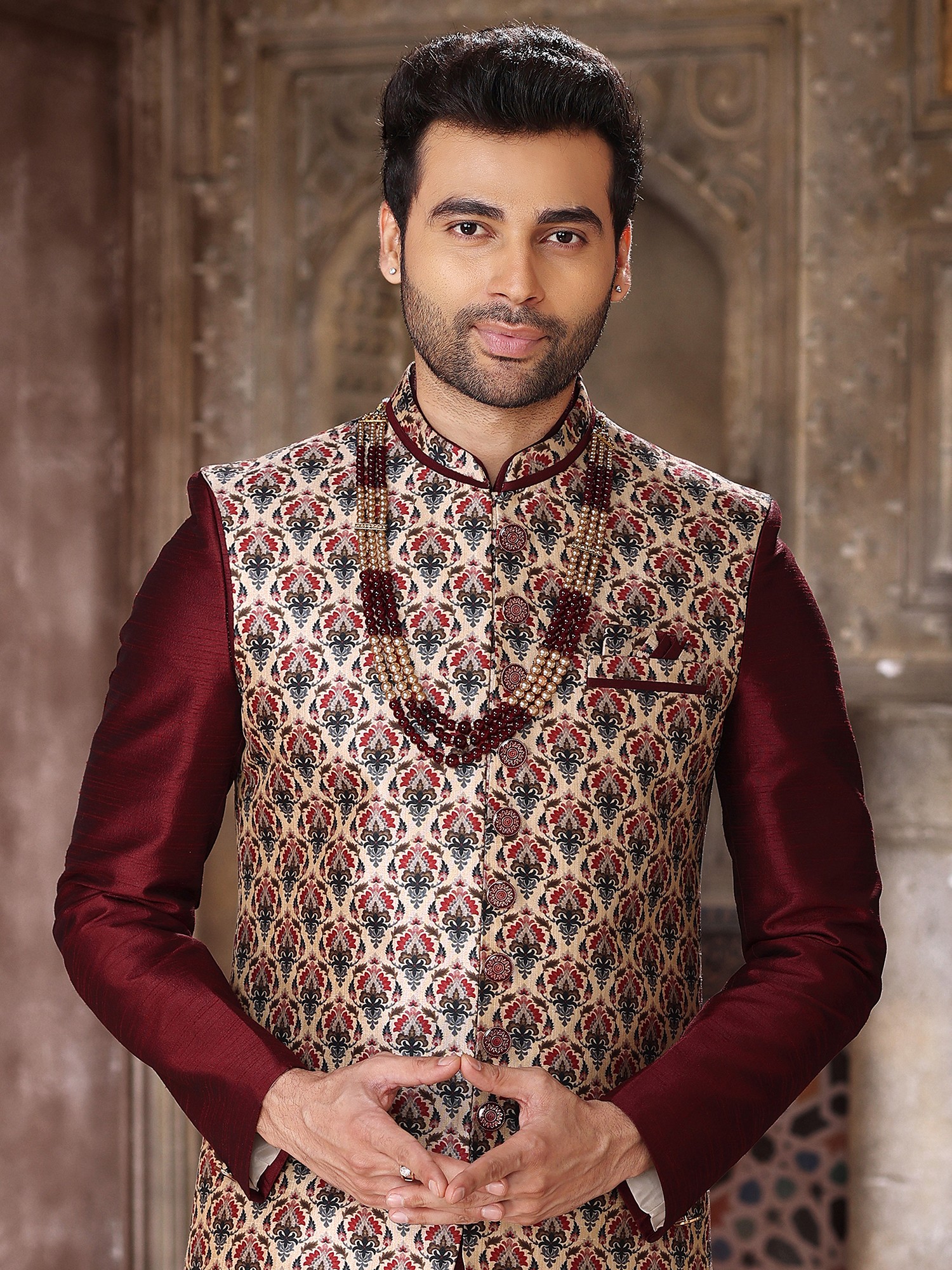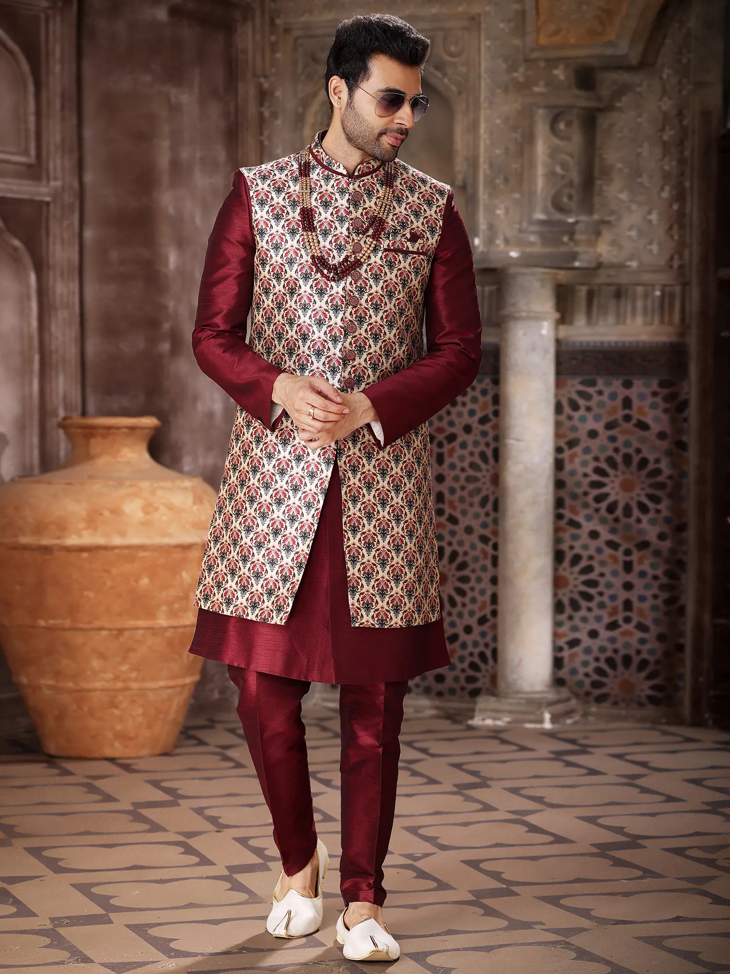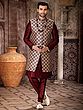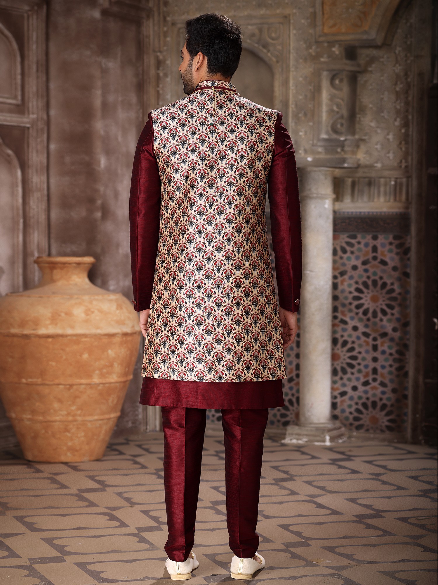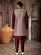 The rich, deep burgundy of the inner kurta and Aligarhi pants provides a stunning contrast to the elaborately patterned jacket. The jacket itself is tailored to perfection, falling gracefully to create a distinguished silhouette. The Aligarhi pants offer unparalleled comfort and freedom of movement, their relaxed fit designed to complement the structured elegance of the outerwear, all presented in a size 34 (XS) for a precise fit.