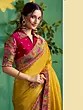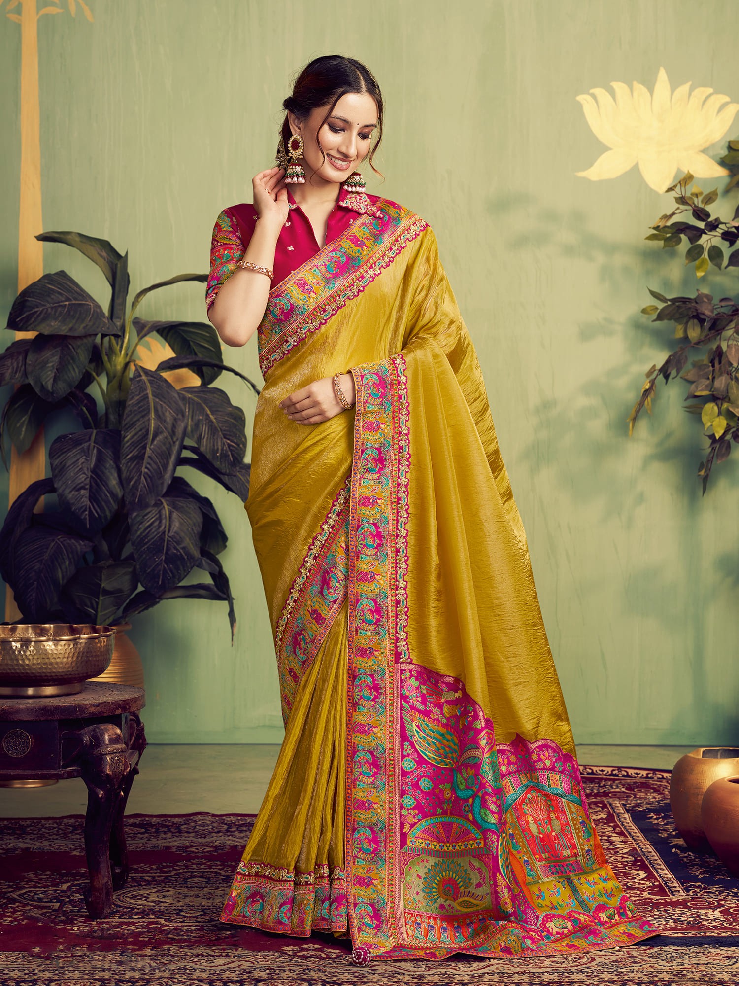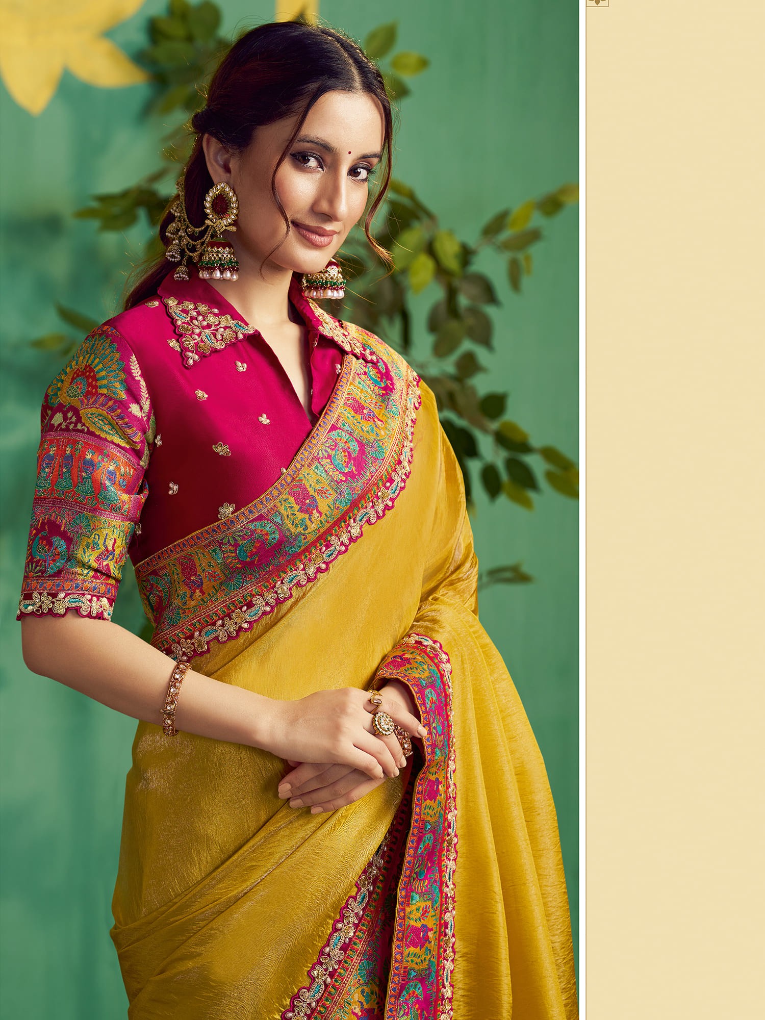 The captivating golden hue provides a resplendent backdrop for the vibrant, multi-hued border and pallu. Here, delicate sequence work dances alongside precisely placed stones, forming elaborate motifs that shimmer with every movement. The rich texture of the silk offers a luxurious feel against your skin, while the detailed embellishments add a profound depth of visual appeal.