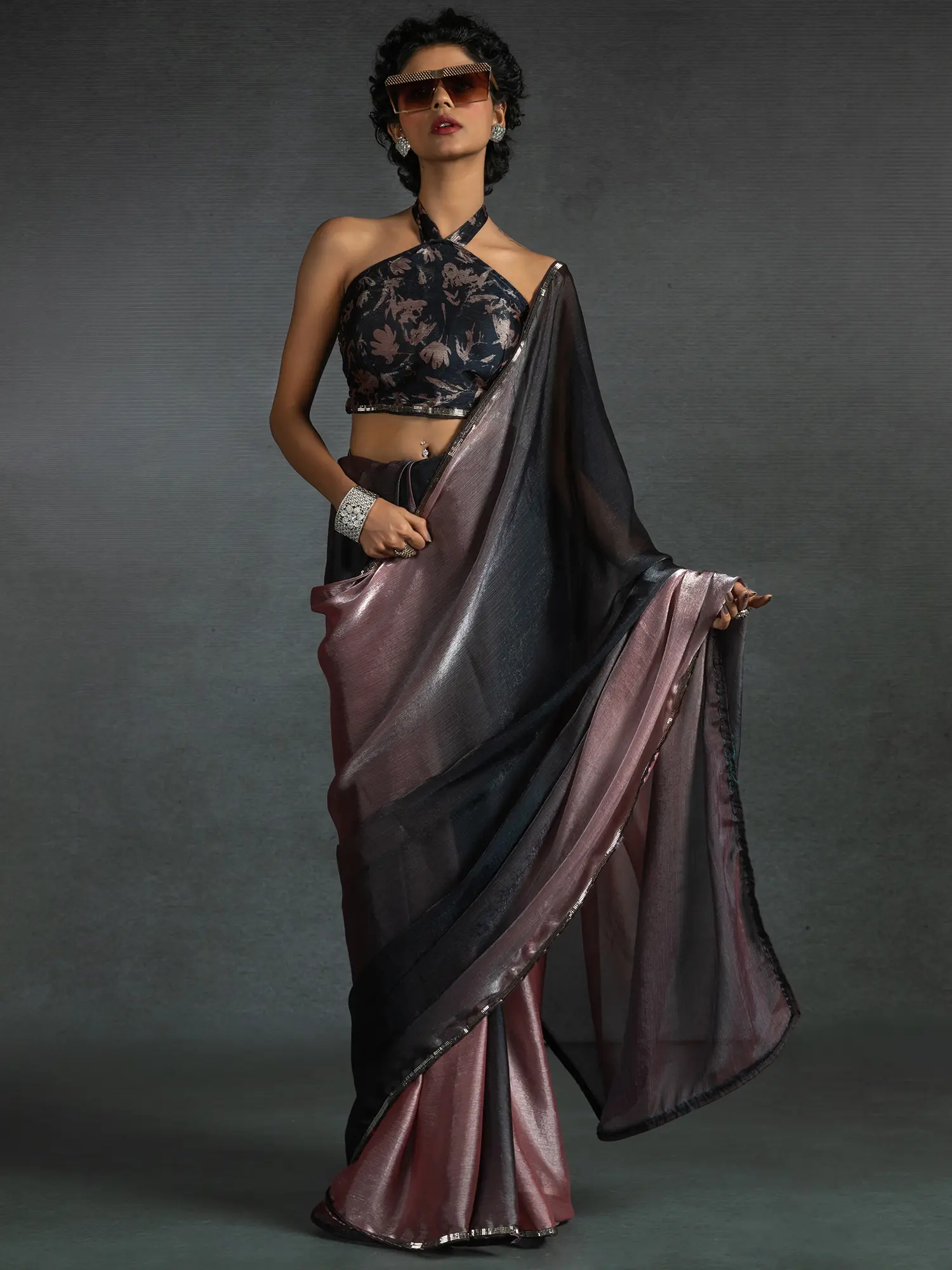 Experience the mesmerizing shift from a luminous silver-grey to a deep, enigmatic charcoal. This gradient effect, coupled with the lustrous satin silk, creates a dynamic visual appeal that is both modern and timeless. The accompanying blouse and underskirt are tailor-made for a flawless, bespoke fit, ensuring comfort and a perfect silhouette.