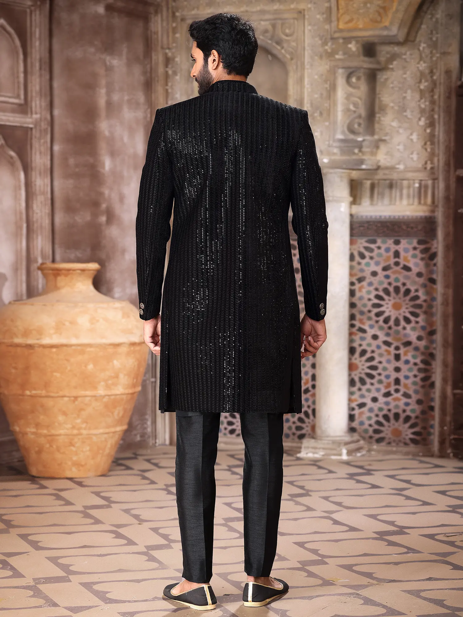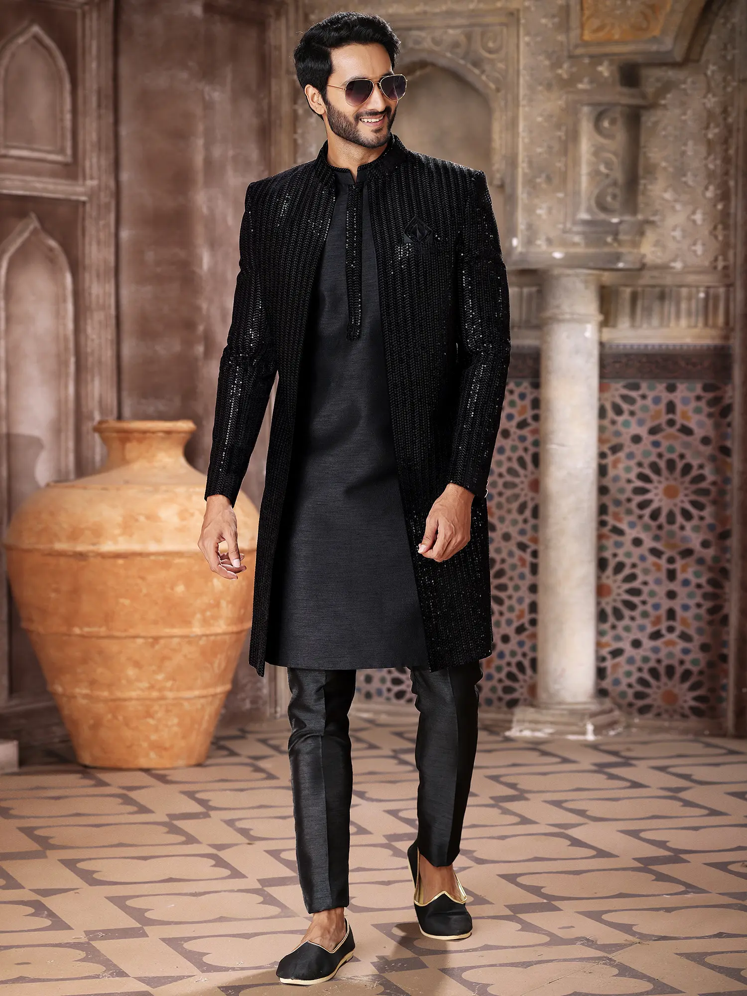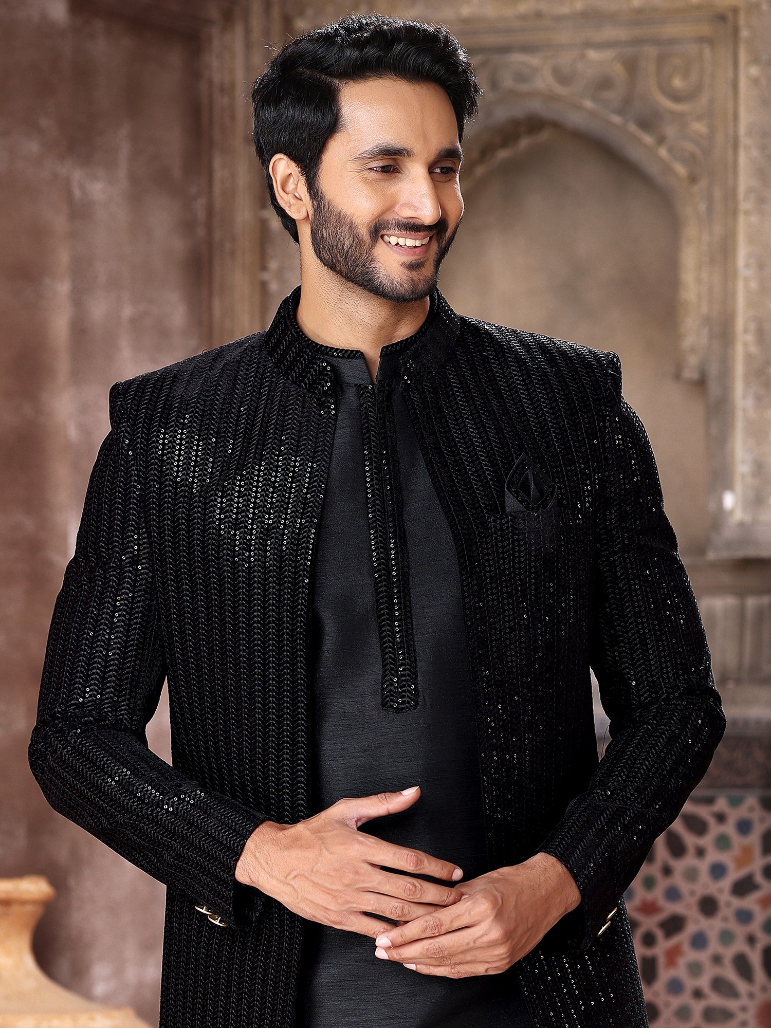 Art Silk Shimmer Sequins Three Piece Indo Jacket Set With Aligarhi Pant Crafts A Premium Ethnic Ensemble For Groom