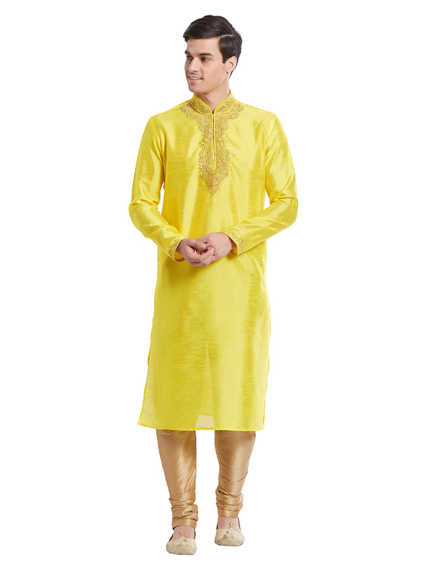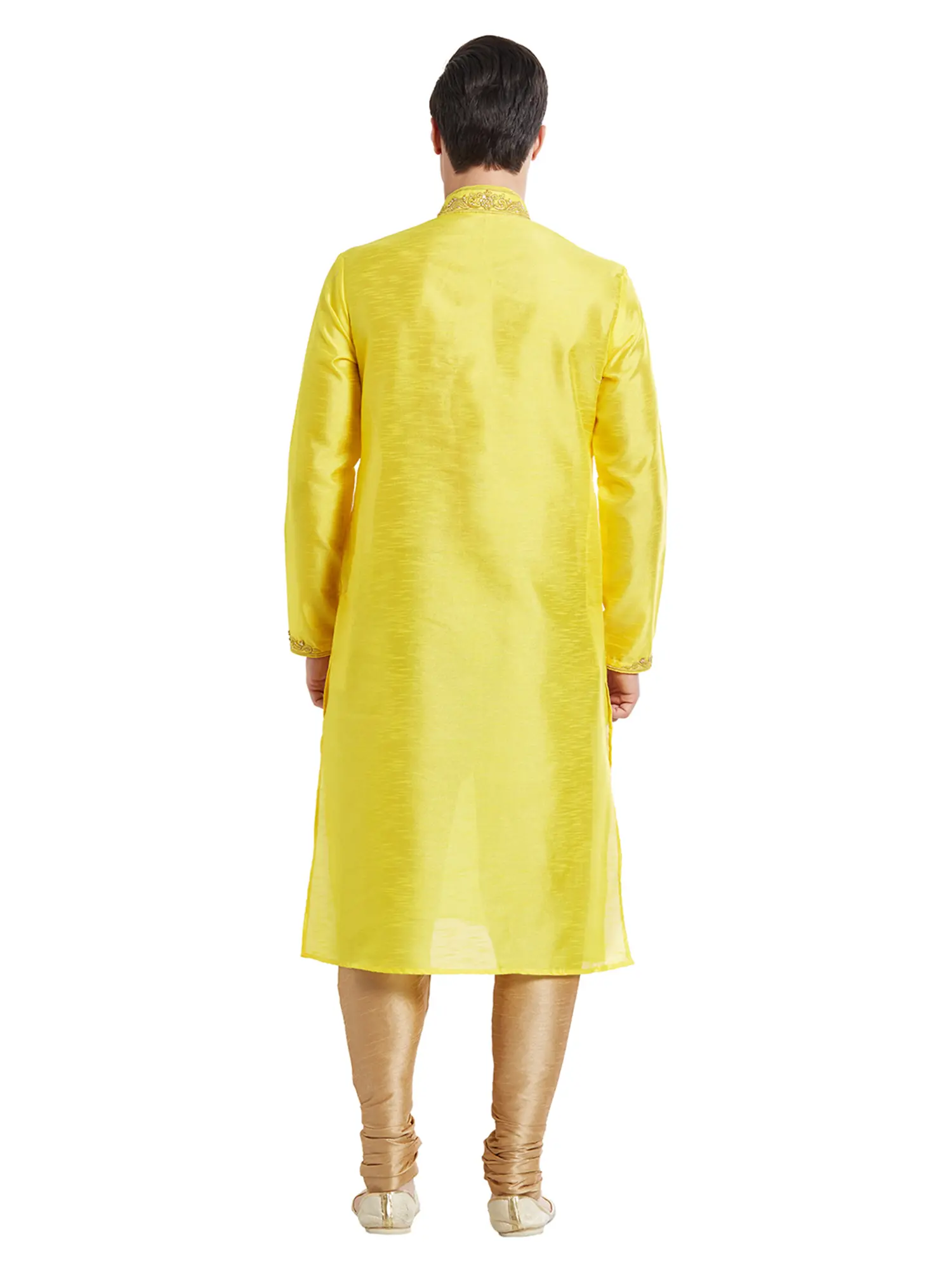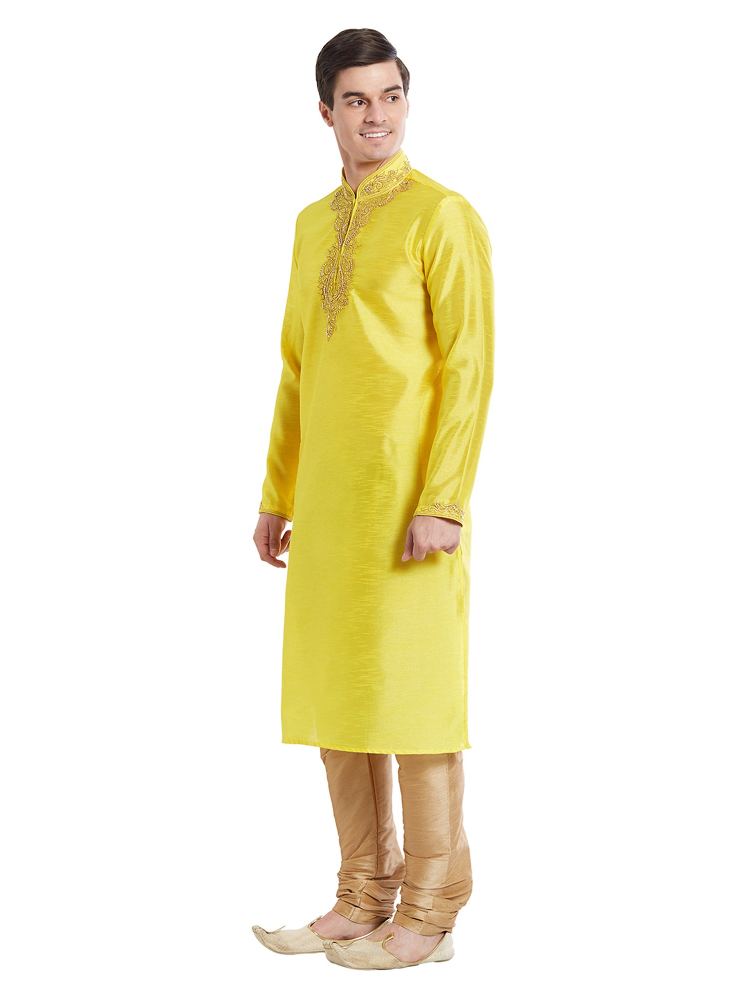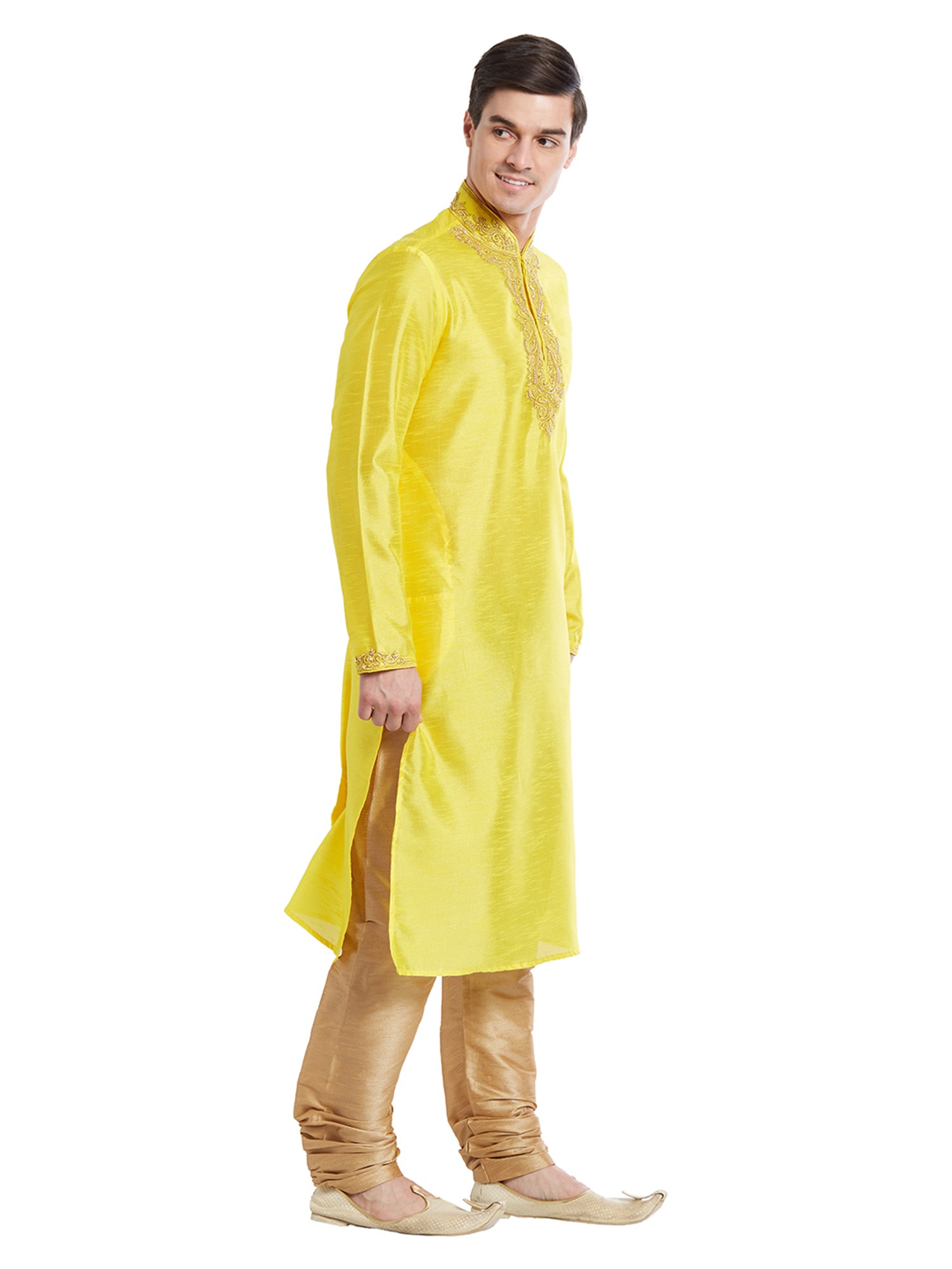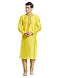 Bright yellow art silk kurta set designed for festive occasions and grand celebrations.