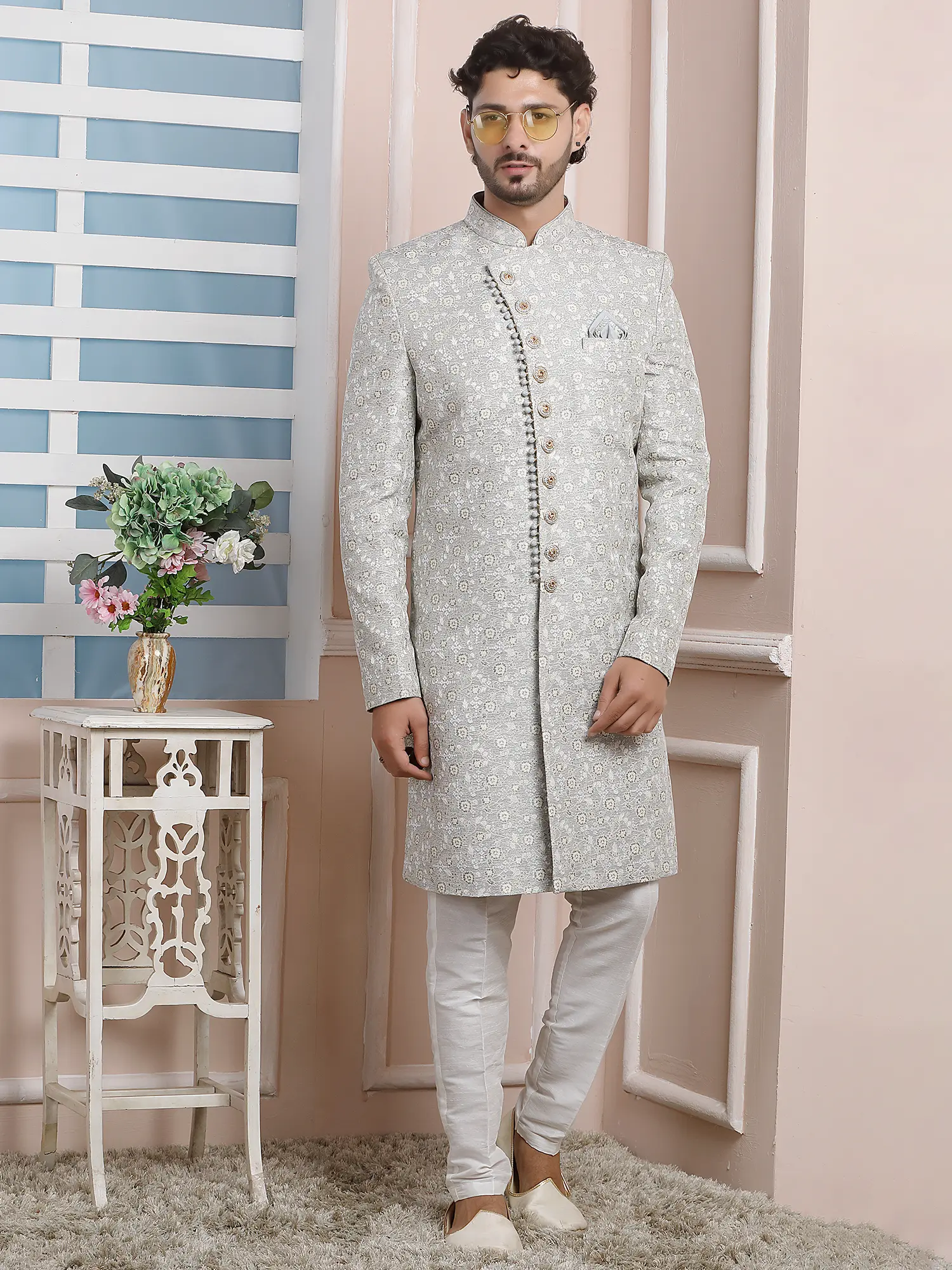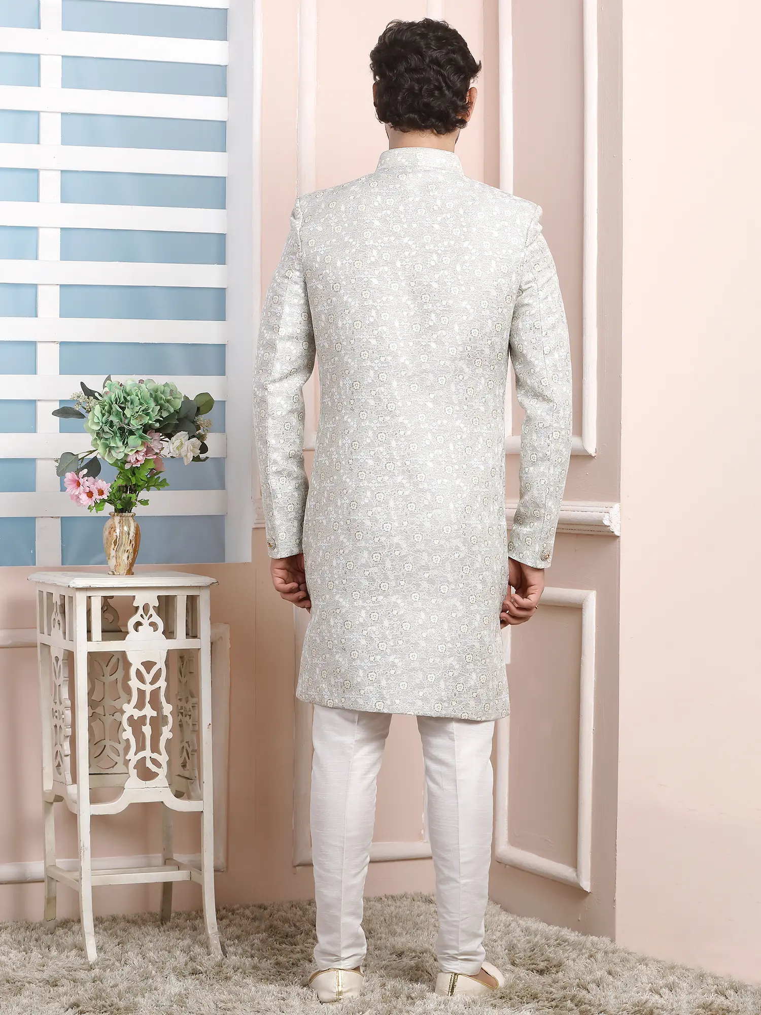 Elegant Jacquard Silk Indo Western Sherwani Paired With Luxe Dupion Art Silk Aligarhi Pant For Men