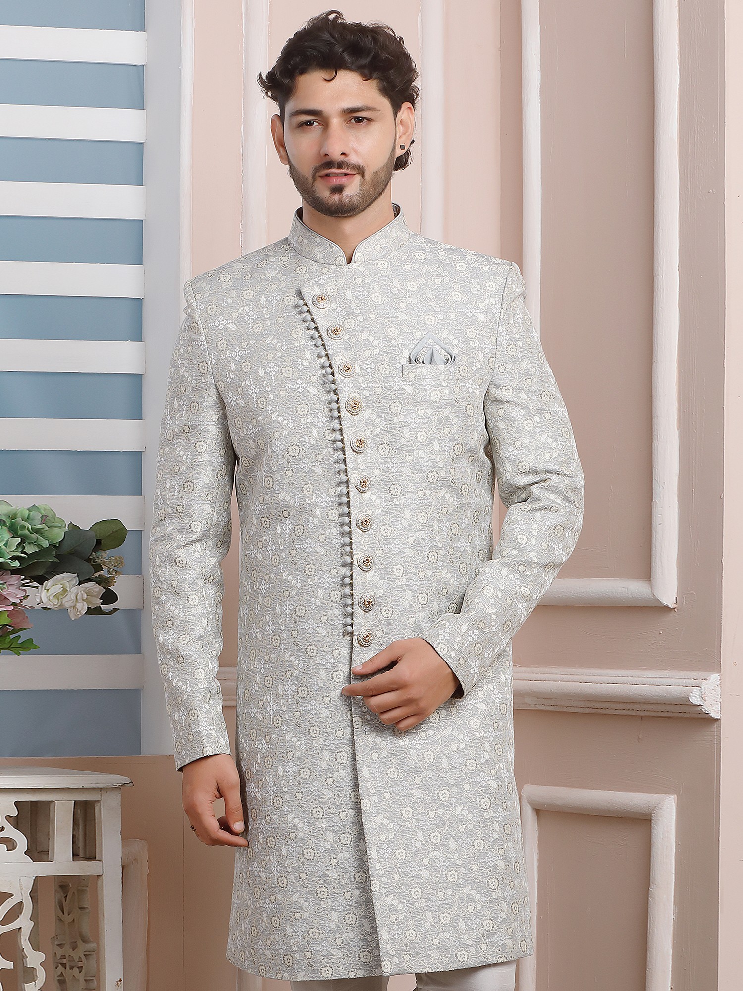 Imported Jacquard Silk Indo Western Sherwani With Dupion Art Silk Aligarhi Pant For Wedding Groom Men