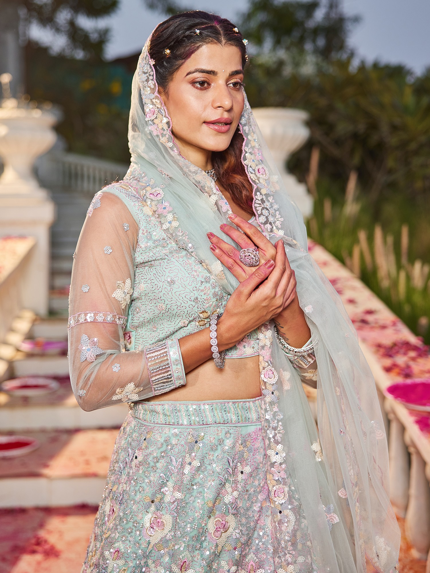 Pastel Net Lehenga Choli With Heavy Gota Patti And Moti Embroidery For Bridal Wedding And Engagement Wear Set