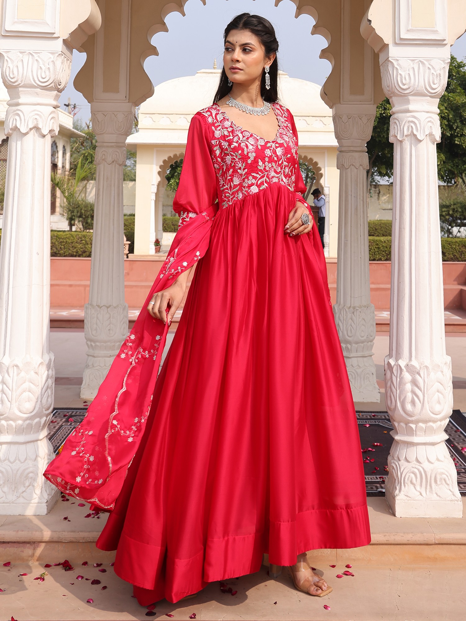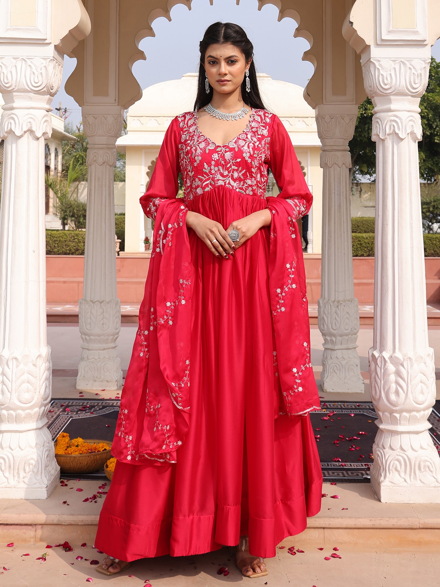 Charming Georgette Anarkali Suit With Dupatta And Crepe Bottom Highlighted By Elegant Ribbon Work Embroidery