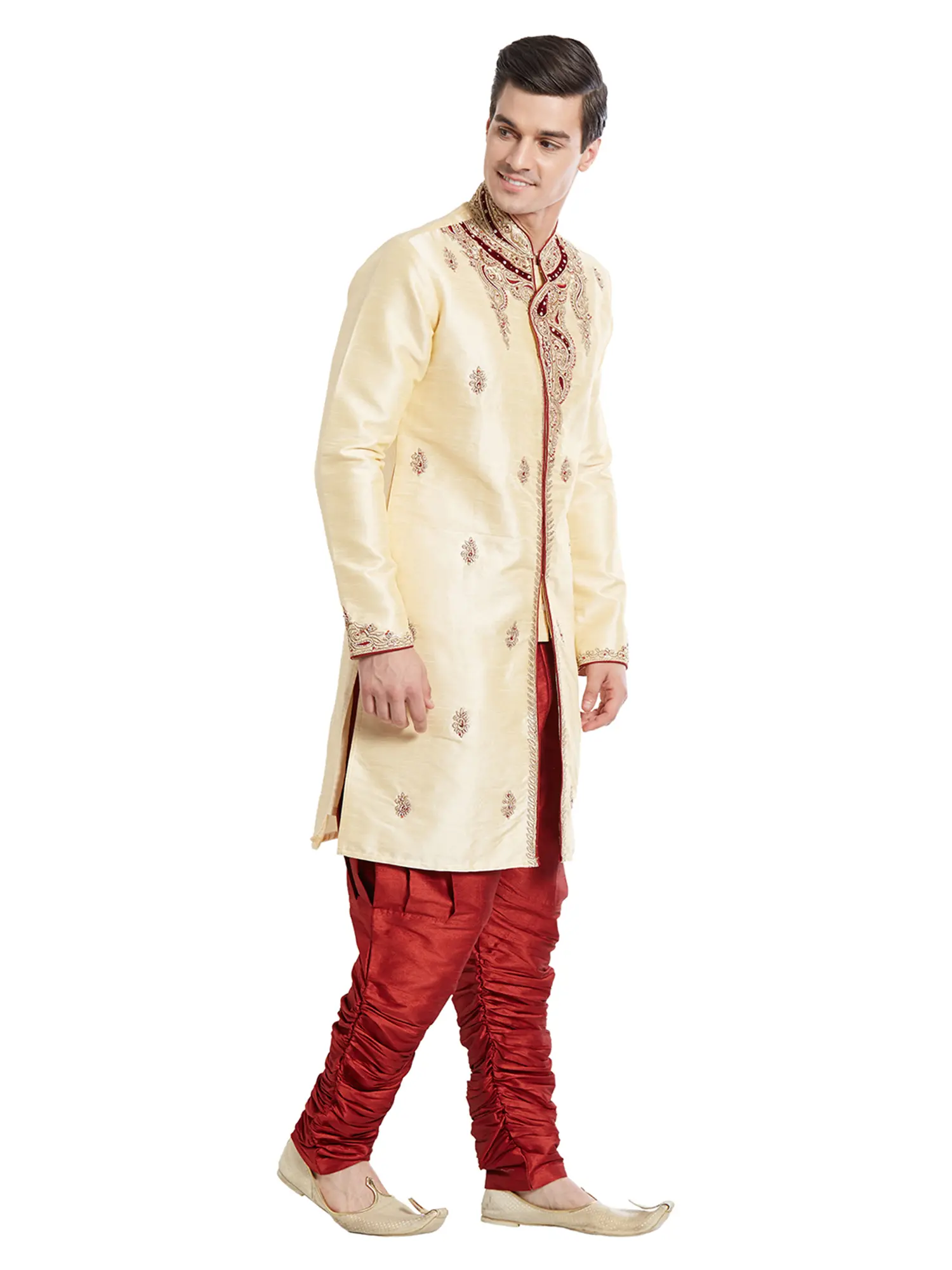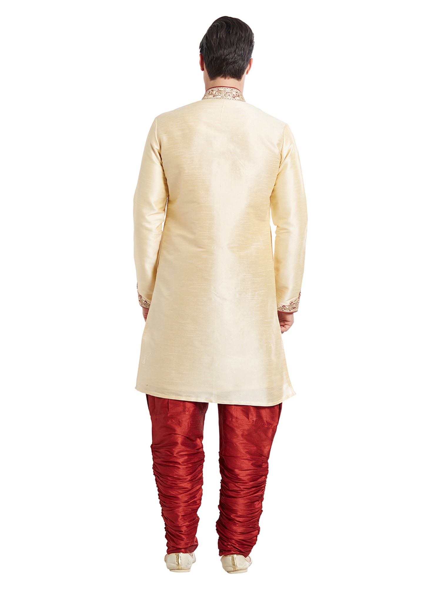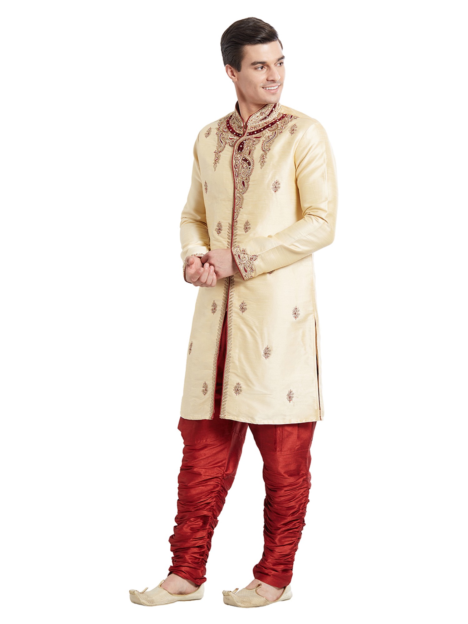The rich, creamy hue of the silk provides a sublime canvas for the elaborate embellishments gracing the neckline, cuffs, and front placket. You'll appreciate the subtle yet impactful scattering of embroidered motifs across the length, each a miniature masterpiece. The accompanying churidar, in a deep, opulent maroon, offers a comfortable yet sophisticated silhouette, further enhancing the overall grandeur.
