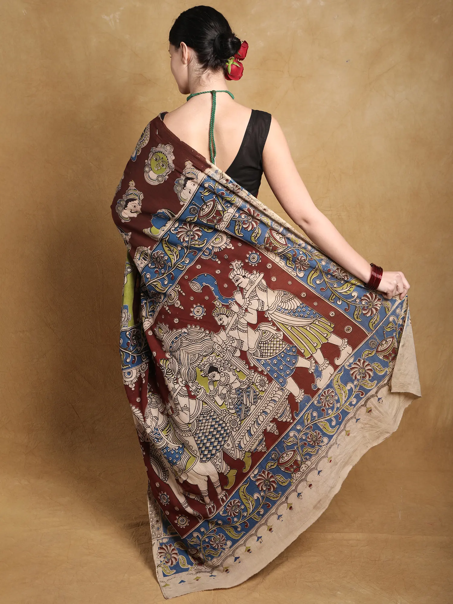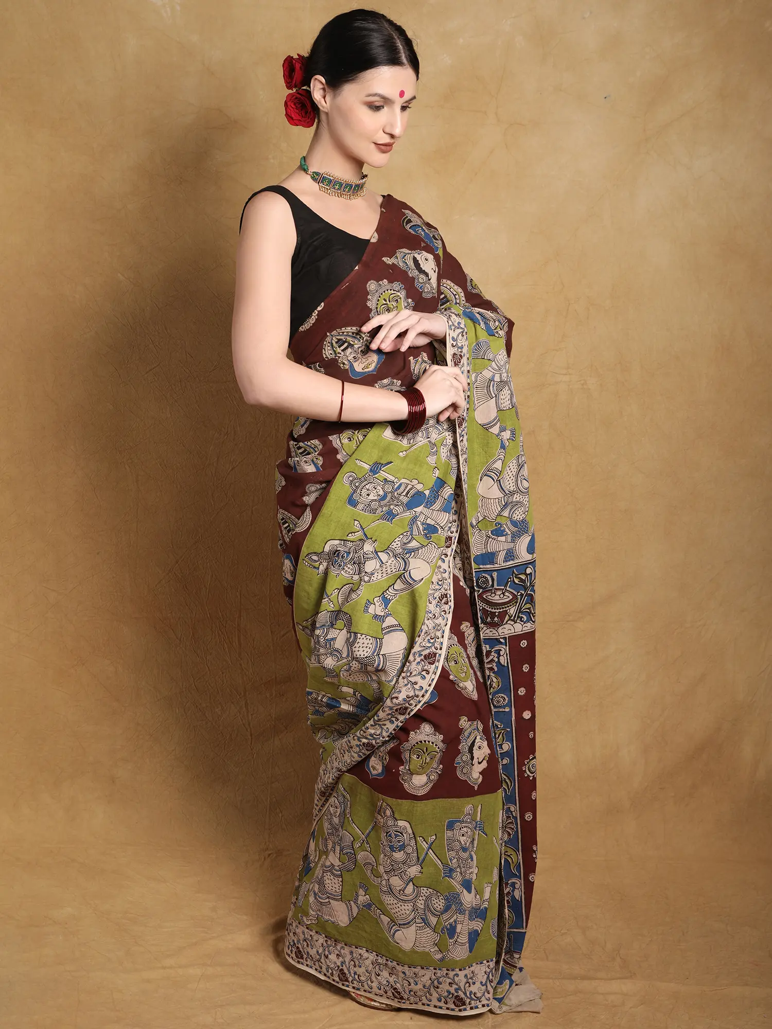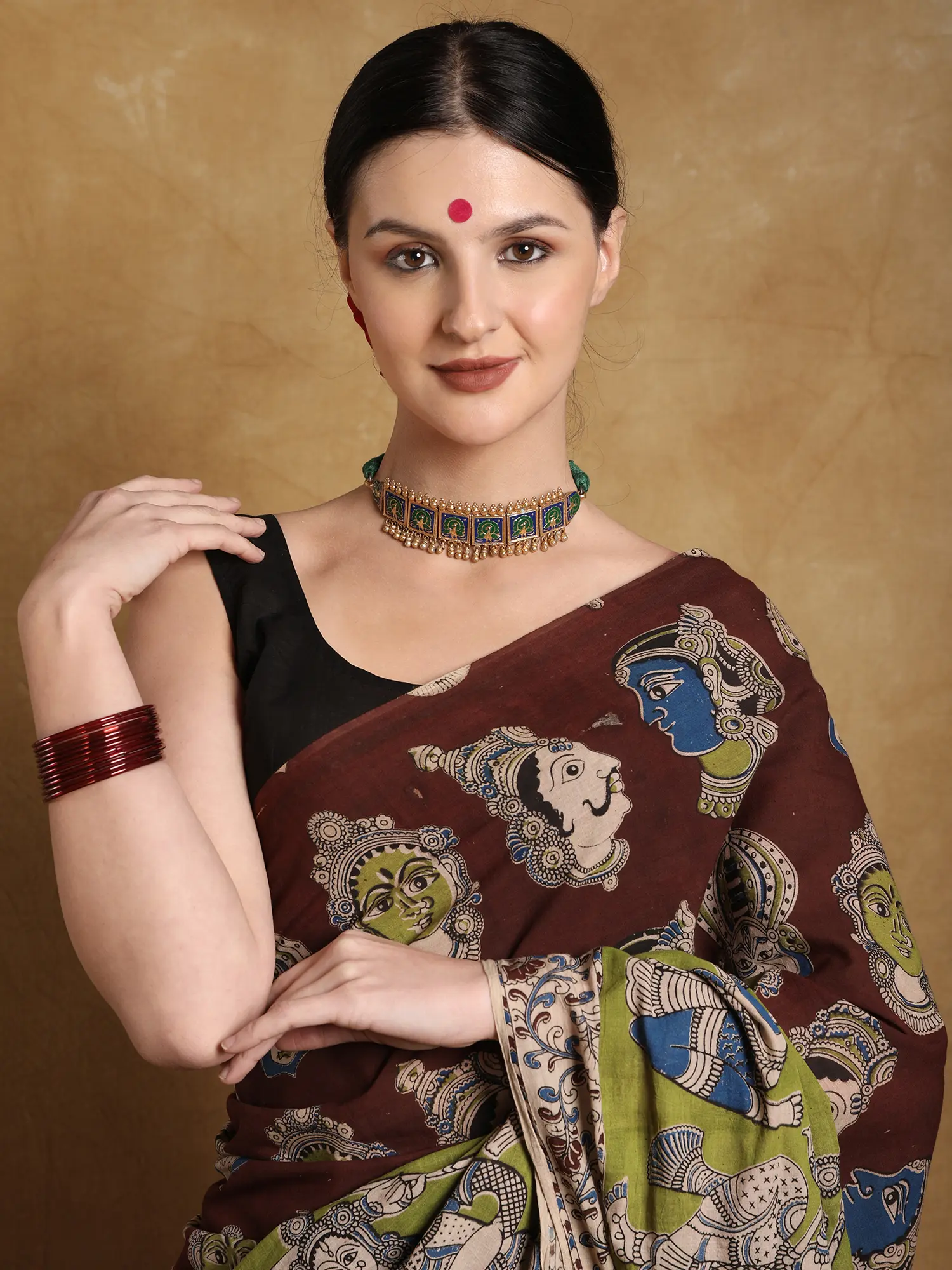 This Saree, a mesmerising creation from the heartlands of Telangana, will take you to a realm of eternal charm. Crafted from pure cotton with passion and finesse, each fold tells a tale of tradition and artistry. The rich hues of madder-brown convey warmth and refinement, while the extensive Kalamkari artistry adds a touch of mystique. Kalamkari is a traditional Indian art style characterised by hand-painted or block-printed cotton fabrics utilising natural dyes.
