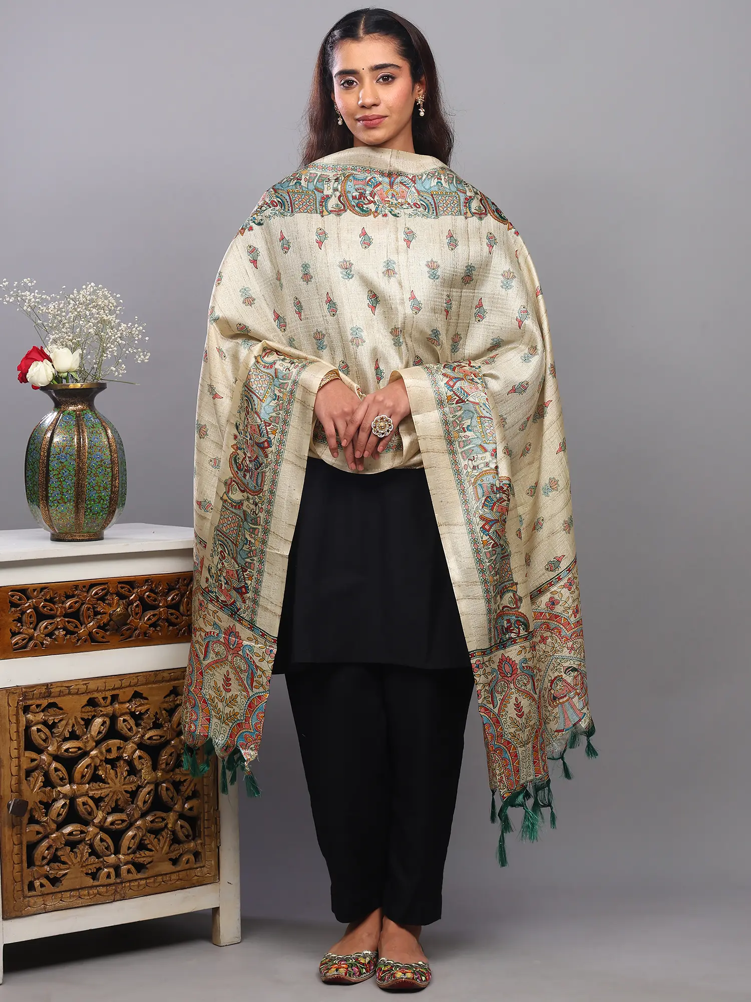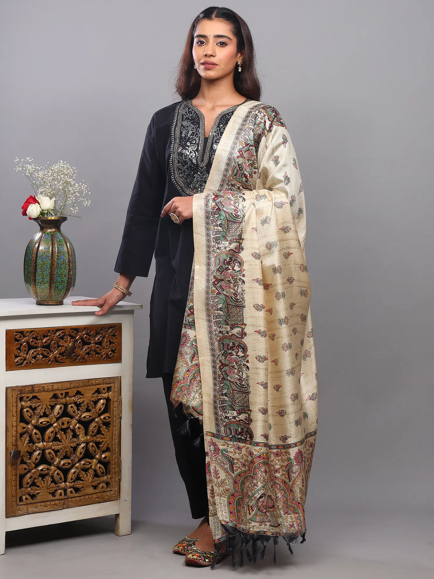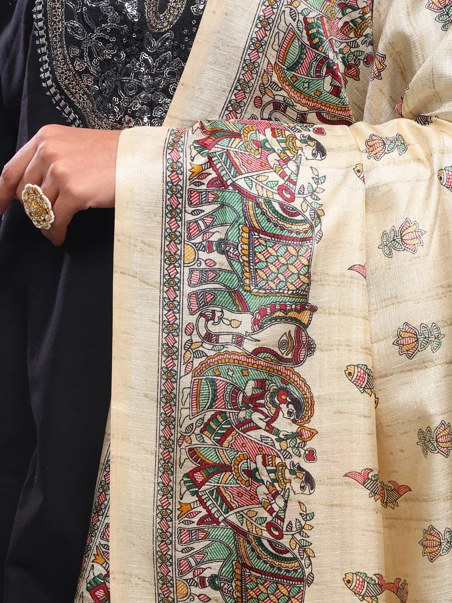Warm-Sand Khadi Silk Madhubani Dupatta from Bihar with Hand-Painted Fishes